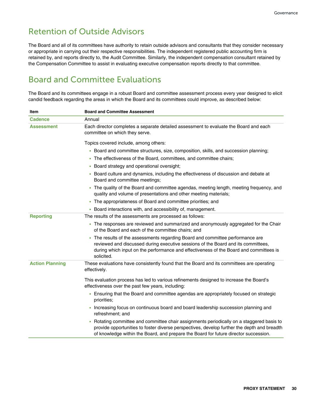 Retention of Outside Advisors The Board and all of its committees have authority to retain outside advisors and consultants that they consider necessary or appropriate in carrying out their respective responsibilities. The independent registered public accounting firm is retained by, and reports directly to, the Audit Committee. Similarly, the independent compensation consultant retained by the Compensation Committee to assist in evaluating executive compensation reports directly to that committee. Board and Committee Evaluations The Board and its committees engage in a robust Board and committee assessment process every year designed to elicit candid feedback regarding the areas in which the Board and its committees could improve, as described below: Item Board and Committee Assessment Cadence Annual Assessment Each director completes a separate detailed assessment to evaluate the Board and each committee on which they serve. Topics covered include, among others: • Board and committee structures, size, composition, skills, and succession planning; • The effectiveness of the Board, committees, and committee chairs; • Board strategy and operational oversight; • Board culture and dynamics, including the effectiveness of discussion and debate at Board and committee meetings; • The quality of the Board and committee agendas, meeting length, meeting frequency, and quality and volume of presentations and other meeting materials; • The appropriateness of Board and committee priorities; and • Board interactions with, and accessibility of, management. Reporting The results of the assessments are processed as follows: • The responses are reviewed and summarized and anonymously aggregated for the Chair of the Board and each of the committee chairs; and • The results of the assessments regarding Board and committee performance are reviewed and discussed during executive sessions of the Board and its committees, during which input on the performance and effectiveness of the Board and committees is solicited. Action Planning These evaluations have consistently found that the Board and its committees are operating effectively. This evaluation process has led to various refinements designed to increase the Board’s effectiveness over the past few years, including: • Ensuring that the Board and committee agendas are appropriately focused on strategic priorities; • Increasing focus on continuous board and board leadership succession planning and refreshment; and • Rotating committee and committee chair assignments periodically on a staggered basis to provide opportunities to foster diverse perspectives, develop further the depth and breadth of knowledge within the Board, and prepare the Board for future director succession. Governance PROXY STATEMENT 30