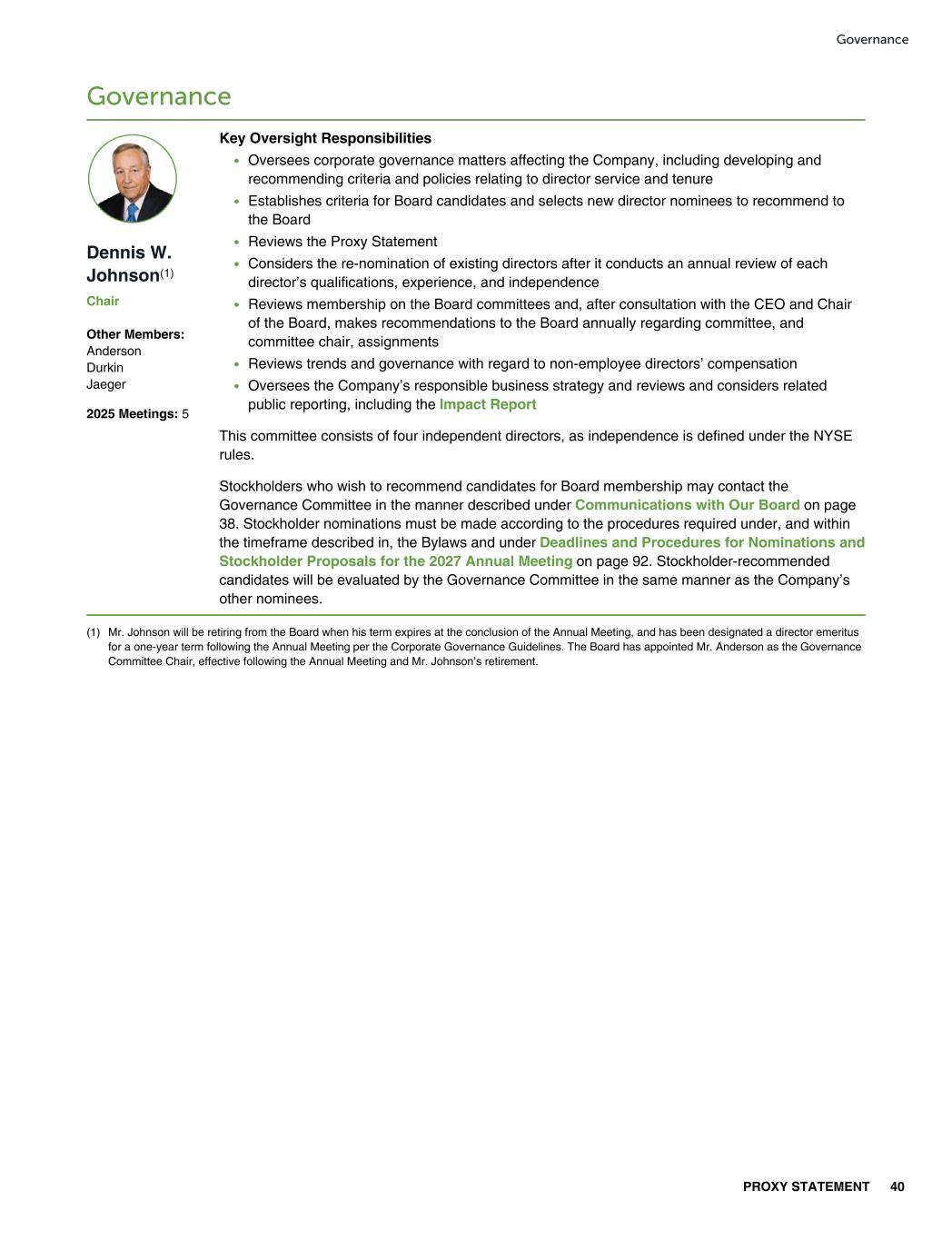 Governance Dennis W. Johnson(1) Chair Other Members: Anderson Durkin Jaeger 2025 Meetings: 5 Key Oversight Responsibilities • Oversees corporate governance matters affecting the Company, including developing and recommending criteria and policies relating to director service and tenure • Establishes criteria for Board candidates and selects new director nominees to recommend to the Board • Reviews the Proxy Statement • Considers the re-nomination of existing directors after it conducts an annual review of each director’s qualifications, experience, and independence • Reviews membership on the Board committees and, after consultation with the CEO and Chair of the Board, makes recommendations to the Board annually regarding committee, and committee chair, assignments • Reviews trends and governance with regard to non-employee directors’ compensation • Oversees the Company’s responsible business strategy and reviews and considers related public reporting, including the Impact Report This committee consists of four independent directors, as independence is defined under the NYSE rules. Stockholders who wish to recommend candidates for Board membership may contact the Governance Committee in the manner described under Communications with Our Board on page 38. Stockholder nominations must be made according to the procedures required under, and within the timeframe described in, the Bylaws and under Deadlines and Procedures for Nominations and Stockholder Proposals for the 2027 Annual Meeting on page 92. Stockholder-recommended candidates will be evaluated by the Governance Committee in the same manner as the Company’s other nominees. (1) Mr. Johnson will be retiring from the Board when his term expires at the conclusion of the Annual Meeting, and has been designated a director emeritus for a one-year term following the Annual Meeting per the Corporate Governance Guidelines. The Board has appointed Mr. Anderson as the Governance Committee Chair, effective following the Annual Meeting and Mr. Johnson’s retirement. Governance PROXY STATEMENT 40