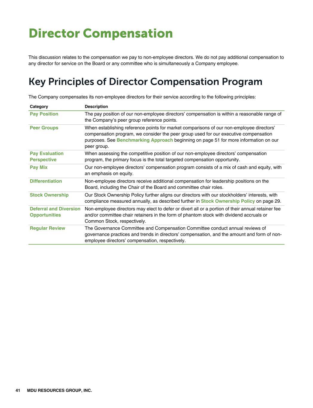 Director Compensation This discussion relates to the compensation we pay to non-employee directors. We do not pay additional compensation to any director for service on the Board or any committee who is simultaneously a Company employee. Key Principles of Director Compensation Program The Company compensates its non-employee directors for their service according to the following principles: Category Description Pay Position The pay position of our non-employee directors’ compensation is within a reasonable range of the Company’s peer group reference points. Peer Groups When establishing reference points for market comparisons of our non-employee directors’ compensation program, we consider the peer group used for our executive compensation purposes. See Benchmarking Approach beginning on page 51 for more information on our peer group. Pay Evaluation Perspective When assessing the competitive position of our non-employee directors’ compensation program, the primary focus is the total targeted compensation opportunity. Pay Mix Our non-employee directors’ compensation program consists of a mix of cash and equity, with an emphasis on equity. Differentiation Non-employee directors receive additional compensation for leadership positions on the Board, including the Chair of the Board and committee chair roles. Stock Ownership Our Stock Ownership Policy further aligns our directors with our stockholders’ interests, with compliance measured annually, as described further in Stock Ownership Policy on page 29. Deferral and Diversion Opportunities Non-employee directors may elect to defer or divert all or a portion of their annual retainer fee and/or committee chair retainers in the form of phantom stock with dividend accruals or Common Stock, respectively. Regular Review The Governance Committee and Compensation Committee conduct annual reviews of governance practices and trends in directors’ compensation, and the amount and form of non- employee directors’ compensation, respectively. 41 MDU RESOURCES GROUP, INC.