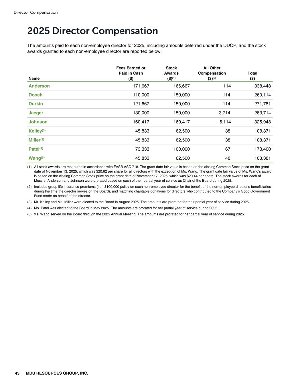 2025 Director Compensation The amounts paid to each non-employee director for 2025, including amounts deferred under the DDCP, and the stock awards granted to each non-employee director are reported below: Name Fees Earned or Paid in Cash ($) Stock Awards ($)(1) All Other Compensation ($)(2) Total ($) Anderson 171,667 166,667 114 338,448 Dosch 110,000 150,000 114 260,114 Durkin 121,667 150,000 114 271,781 Jaeger 130,000 150,000 3,714 283,714 Johnson 160,417 160,417 5,114 325,948 Kelley(3) 45,833 62,500 38 108,371 Miller(3) 45,833 62,500 38 108,371 Patel(4) 73,333 100,000 67 173,400 Wang(5) 45,833 62,500 48 108,381 (1) All stock awards are measured in accordance with FASB ASC 718. The grant date fair value is based on the closing Common Stock price on the grant date of November 13, 2025, which was $20.62 per share for all directors with the exception of Ms. Wang. The grant date fair value of Ms. Wang’s award is based on the closing Common Stock price on the grant date of November 17, 2025, which was $20.44 per share. The stock awards for each of Messrs. Anderson and Johnson were prorated based on each of their partial year of service as Chair of the Board during 2025. (2) Includes group life insurance premiums (i.e., $100,000 policy on each non-employee director for the benefit of the non-employee director’s beneficiaries during the time the director serves on the Board), and matching charitable donations for directors who contributed to the Company’s Good Government Fund made on behalf of the director. (3) Mr. Kelley and Ms. Miller were elected to the Board in August 2025. The amounts are prorated for their partial year of service during 2025. (4) Ms. Patel was elected to the Board in May 2025. The amounts are prorated for her partial year of service during 2025. (5) Ms. Wang served on the Board through the 2025 Annual Meeting. The amounts are prorated for her partial year of service during 2025. Director Compensation 43 MDU RESOURCES GROUP, INC.