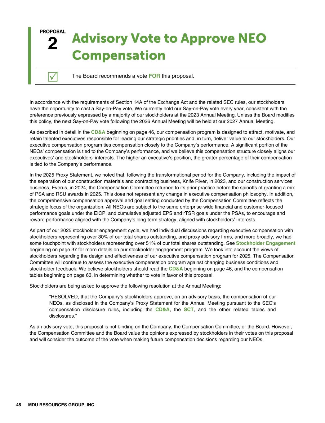 PROPOSAL Advisory Vote to Approve NEO Compensation 2 R The Board recommends a vote FOR this proposal. In accordance with the requirements of Section 14A of the Exchange Act and the related SEC rules, our stockholders have the opportunity to cast a Say-on-Pay vote. We currently hold our Say-on-Pay vote every year, consistent with the preference previously expressed by a majority of our stockholders at the 2023 Annual Meeting. Unless the Board modifies this policy, the next Say-on-Pay vote following the 2026 Annual Meeting will be held at our 2027 Annual Meeting. As described in detail in the CD&A beginning on page 46, our compensation program is designed to attract, motivate, and retain talented executives responsible for leading our strategic priorities and, in turn, deliver value to our stockholders. Our executive compensation program ties compensation closely to the Company’s performance. A significant portion of the NEOs’ compensation is tied to the Company’s performance, and we believe this compensation structure closely aligns our executives’ and stockholders’ interests. The higher an executive’s position, the greater percentage of their compensation is tied to the Company’s performance. In the 2025 Proxy Statement, we noted that, following the transformational period for the Company, including the impact of the separation of our construction materials and contracting business, Knife River, in 2023, and our construction services business, Everus, in 2024, the Compensation Committee returned to its prior practice before the spinoffs of granting a mix of PSA and RSU awards in 2025. This does not represent any change in executive compensation philosophy. In addition, the comprehensive compensation approval and goal setting conducted by the Compensation Committee reflects the strategic focus of the organization. All NEOs are subject to the same enterprise-wide financial and customer-focused performance goals under the EICP, and cumulative adjusted EPS and rTSR goals under the PSAs, to encourage and reward performance aligned with the Company’s long-term strategy, aligned with stockholders’ interests. As part of our 2025 stockholder engagement cycle, we had individual discussions regarding executive compensation with stockholders representing over 30% of our total shares outstanding, and proxy advisory firms, and more broadly, we had some touchpoint with stockholders representing over 51% of our total shares outstanding. See Stockholder Engagement beginning on page 37 for more details on our stockholder engagement program. We took into account the views of stockholders regarding the design and effectiveness of our executive compensation program for 2025. The Compensation Committee will continue to assess the executive compensation program against changing business conditions and stockholder feedback. We believe stockholders should read the CD&A beginning on page 46, and the compensation tables beginning on page 63, in determining whether to vote in favor of this proposal. Stockholders are being asked to approve the following resolution at the Annual Meeting: “RESOLVED, that the Company’s stockholders approve, on an advisory basis, the compensation of our NEOs, as disclosed in the Company’s Proxy Statement for the Annual Meeting pursuant to the SEC’s compensation disclosure rules, including the CD&A, the SCT, and the other related tables and disclosures.” As an advisory vote, this proposal is not binding on the Company, the Compensation Committee, or the Board. However, the Compensation Committee and the Board value the opinions expressed by stockholders in their votes on this proposal and will consider the outcome of the vote when making future compensation decisions regarding our NEOs. 45 MDU RESOURCES GROUP, INC.