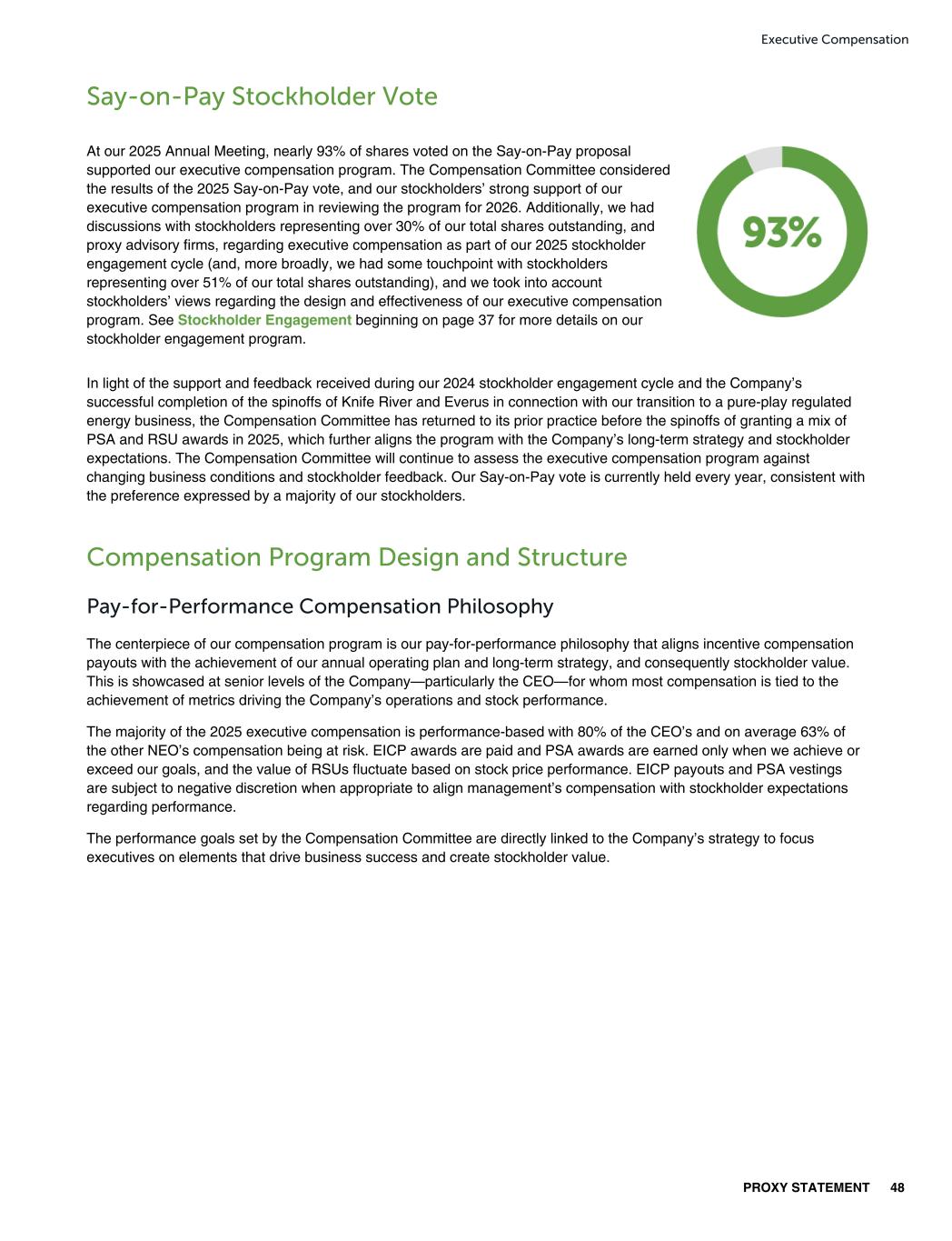Say-on-Pay Stockholder Vote At our 2025 Annual Meeting, nearly 93% of shares voted on the Say-on-Pay proposal supported our executive compensation program. The Compensation Committee considered the results of the 2025 Say-on-Pay vote, and our stockholders’ strong support of our executive compensation program in reviewing the program for 2026. Additionally, we had discussions with stockholders representing over 30% of our total shares outstanding, and proxy advisory firms, regarding executive compensation as part of our 2025 stockholder engagement cycle (and, more broadly, we had some touchpoint with stockholders representing over 51% of our total shares outstanding), and we took into account stockholders’ views regarding the design and effectiveness of our executive compensation program. See Stockholder Engagement beginning on page 37 for more details on our stockholder engagement program. In light of the support and feedback received during our 2024 stockholder engagement cycle and the Company’s successful completion of the spinoffs of Knife River and Everus in connection with our transition to a pure-play regulated energy business, the Compensation Committee has returned to its prior practice before the spinoffs of granting a mix of PSA and RSU awards in 2025, which further aligns the program with the Company’s long-term strategy and stockholder expectations. The Compensation Committee will continue to assess the executive compensation program against changing business conditions and stockholder feedback. Our Say-on-Pay vote is currently held every year, consistent with the preference expressed by a majority of our stockholders. Compensation Program Design and Structure Pay-for-Performance Compensation Philosophy The centerpiece of our compensation program is our pay-for-performance philosophy that aligns incentive compensation payouts with the achievement of our annual operating plan and long-term strategy, and consequently stockholder value. This is showcased at senior levels of the Company—particularly the CEO—for whom most compensation is tied to the achievement of metrics driving the Company’s operations and stock performance. The majority of the 2025 executive compensation is performance-based with 80% of the CEO’s and on average 63% of the other NEO’s compensation being at risk. EICP awards are paid and PSA awards are earned only when we achieve or exceed our goals, and the value of RSUs fluctuate based on stock price performance. EICP payouts and PSA vestings are subject to negative discretion when appropriate to align management’s compensation with stockholder expectations regarding performance. The performance goals set by the Compensation Committee are directly linked to the Company’s strategy to focus executives on elements that drive business success and create stockholder value. Executive Compensation PROXY STATEMENT 48