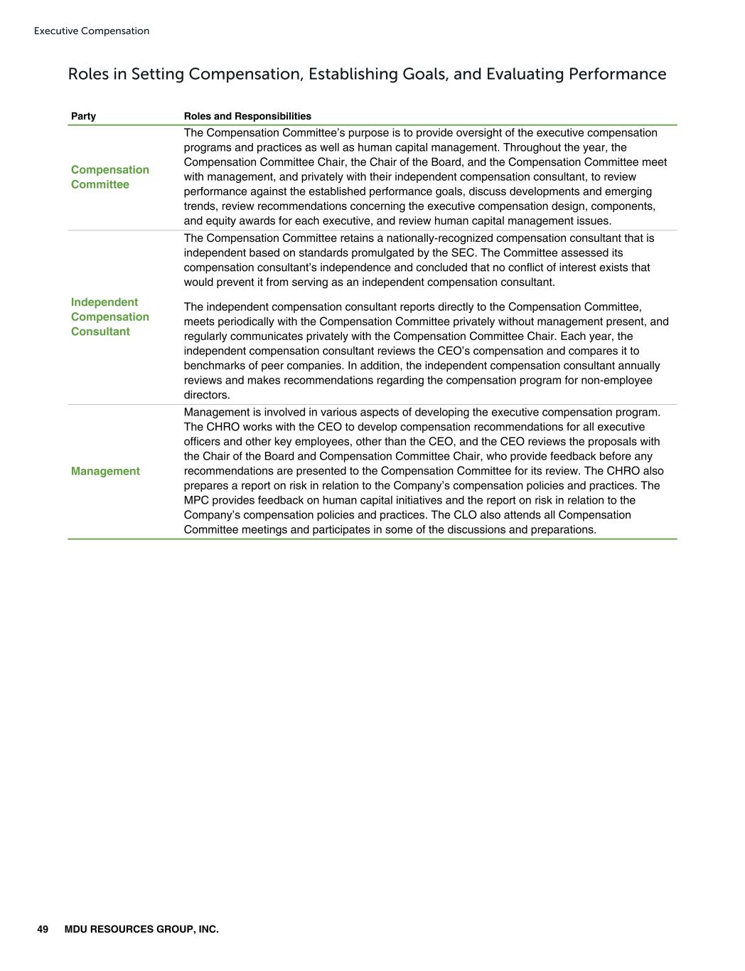 Roles in Setting Compensation, Establishing Goals, and Evaluating Performance Party Roles and Responsibilities Compensation Committee The Compensation Committee’s purpose is to provide oversight of the executive compensation programs and practices as well as human capital management. Throughout the year, the Compensation Committee Chair, the Chair of the Board, and the Compensation Committee meet with management, and privately with their independent compensation consultant, to review performance against the established performance goals, discuss developments and emerging trends, review recommendations concerning the executive compensation design, components, and equity awards for each executive, and review human capital management issues. Independent Compensation Consultant The Compensation Committee retains a nationally-recognized compensation consultant that is independent based on standards promulgated by the SEC. The Committee assessed its compensation consultant’s independence and concluded that no conflict of interest exists that would prevent it from serving as an independent compensation consultant. The independent compensation consultant reports directly to the Compensation Committee, meets periodically with the Compensation Committee privately without management present, and regularly communicates privately with the Compensation Committee Chair. Each year, the independent compensation consultant reviews the CEO’s compensation and compares it to benchmarks of peer companies. In addition, the independent compensation consultant annually reviews and makes recommendations regarding the compensation program for non-employee directors. Management Management is involved in various aspects of developing the executive compensation program. The CHRO works with the CEO to develop compensation recommendations for all executive officers and other key employees, other than the CEO, and the CEO reviews the proposals with the Chair of the Board and Compensation Committee Chair, who provide feedback before any recommendations are presented to the Compensation Committee for its review. The CHRO also prepares a report on risk in relation to the Company’s compensation policies and practices. The MPC provides feedback on human capital initiatives and the report on risk in relation to the Company’s compensation policies and practices. The CLO also attends all Compensation Committee meetings and participates in some of the discussions and preparations. Executive Compensation 49 MDU RESOURCES GROUP, INC.