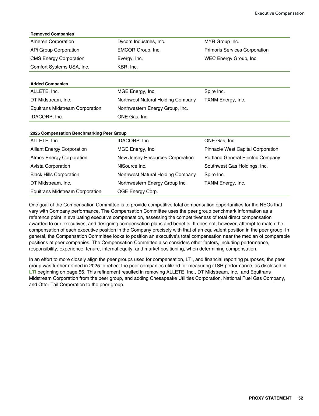 Removed Companies Ameren Corporation Dycom Industries, Inc. MYR Group Inc. APi Group Corporation EMCOR Group, Inc. Primoris Services Corporation CMS Energy Corporation Evergy, Inc. WEC Energy Group, Inc. Comfort Systems USA, Inc. KBR, Inc. Added Companies ALLETE, Inc. MGE Energy, Inc. Spire Inc. DT Midstream, Inc. Northwest Natural Holding Company TXNM Energy, Inc. Equitrans Midstream Corporation Northwestern Energy Group, Inc. IDACORP, Inc. ONE Gas, Inc. 2025 Compensation Benchmarking Peer Group ALLETE, Inc. IDACORP, Inc. ONE Gas, Inc. Alliant Energy Corporation MGE Energy, Inc. Pinnacle West Capital Corporation Atmos Energy Corporation New Jersey Resources Corporation Portland General Electric Company Avista Corporation NiSource Inc. Southwest Gas Holdings, Inc. Black Hills Corporation Northwest Natural Holding Company Spire Inc. DT Midstream, Inc. Northwestern Energy Group Inc. TXNM Energy, Inc. Equitrans Midstream Corporation OGE Energy Corp. One goal of the Compensation Committee is to provide competitive total compensation opportunities for the NEOs that vary with Company performance. The Compensation Committee uses the peer group benchmark information as a reference point in evaluating executive compensation, assessing the competitiveness of total direct compensation awarded to our executives, and designing compensation plans and benefits. It does not, however, attempt to match the compensation of each executive position in the Company precisely with that of an equivalent position in the peer group. In general, the Compensation Committee looks to position an executive’s total compensation near the median of comparable positions at peer companies. The Compensation Committee also considers other factors, including performance, responsibility, experience, tenure, internal equity, and market positioning, when determining compensation. In an effort to more closely align the peer groups used for compensation, LTI, and financial reporting purposes, the peer group was further refined in 2025 to reflect the peer companies utilized for measuring rTSR performance, as disclosed in LTI beginning on page 56. This refinement resulted in removing ALLETE, Inc., DT Midstream, Inc., and Equitrans Midstream Corporation from the peer group, and adding Chesapeake Utilities Corporation, National Fuel Gas Company, and Otter Tail Corporation to the peer group. Executive Compensation PROXY STATEMENT 52