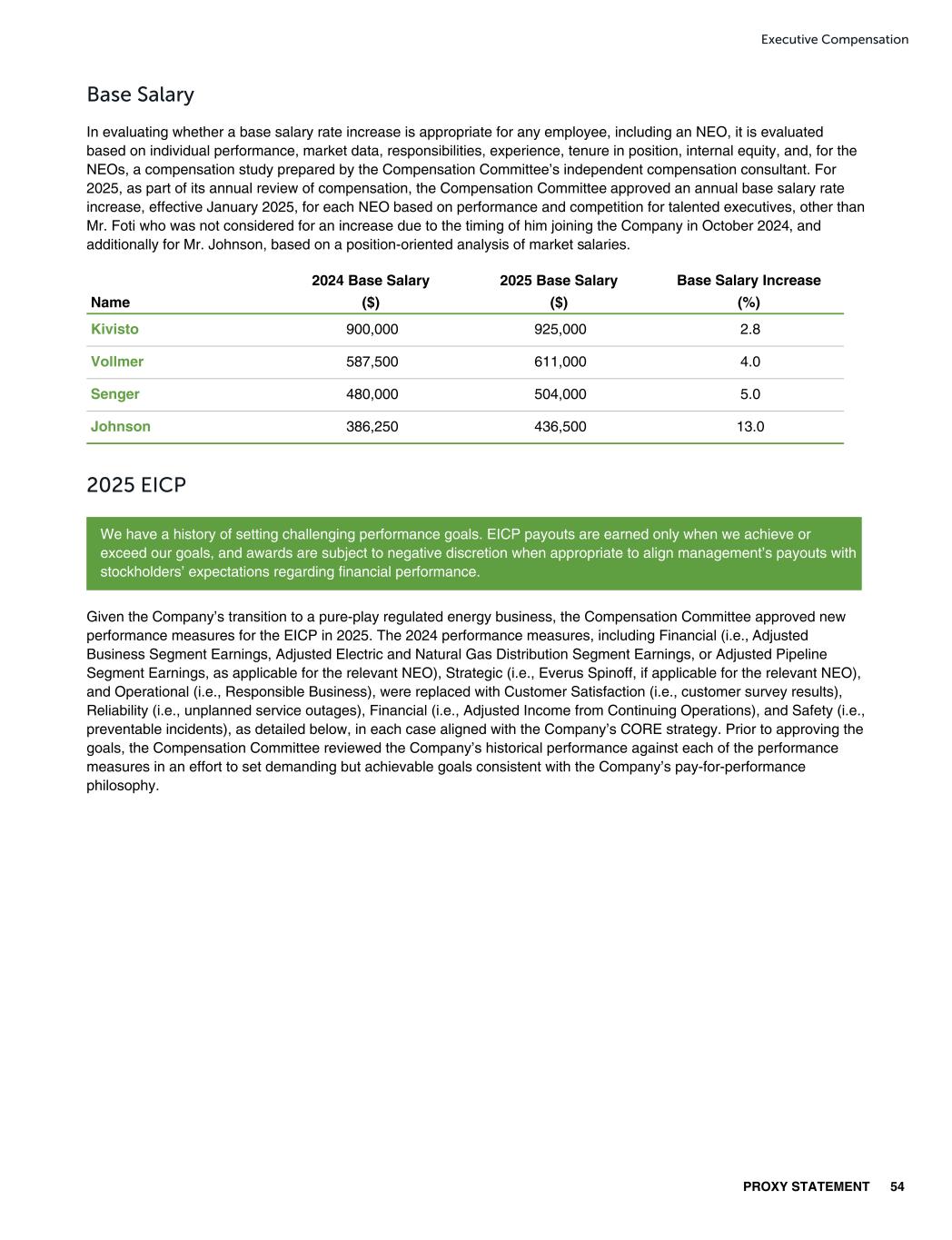 Base Salary In evaluating whether a base salary rate increase is appropriate for any employee, including an NEO, it is evaluated based on individual performance, market data, responsibilities, experience, tenure in position, internal equity, and, for the NEOs, a compensation study prepared by the Compensation Committee’s independent compensation consultant. For 2025, as part of its annual review of compensation, the Compensation Committee approved an annual base salary rate increase, effective January 2025, for each NEO based on performance and competition for talented executives, other than Mr. Foti who was not considered for an increase due to the timing of him joining the Company in October 2024, and additionally for Mr. Johnson, based on a position-oriented analysis of market salaries. Name 2024 Base Salary ($) 2025 Base Salary ($) Base Salary Increase (%) Kivisto 900,000 925,000 2.8 Vollmer 587,500 611,000 4.0 Senger 480,000 504,000 5.0 Johnson 386,250 436,500 13.0 2025 EICP We have a history of setting challenging performance goals. EICP payouts are earned only when we achieve or exceed our goals, and awards are subject to negative discretion when appropriate to align management’s payouts with stockholders’ expectations regarding financial performance. Given the Company’s transition to a pure-play regulated energy business, the Compensation Committee approved new performance measures for the EICP in 2025. The 2024 performance measures, including Financial (i.e., Adjusted Business Segment Earnings, Adjusted Electric and Natural Gas Distribution Segment Earnings, or Adjusted Pipeline Segment Earnings, as applicable for the relevant NEO), Strategic (i.e., Everus Spinoff, if applicable for the relevant NEO), and Operational (i.e., Responsible Business), were replaced with Customer Satisfaction (i.e., customer survey results), Reliability (i.e., unplanned service outages), Financial (i.e., Adjusted Income from Continuing Operations), and Safety (i.e., preventable incidents), as detailed below, in each case aligned with the Company’s CORE strategy. Prior to approving the goals, the Compensation Committee reviewed the Company’s historical performance against each of the performance measures in an effort to set demanding but achievable goals consistent with the Company’s pay-for-performance philosophy. Executive Compensation PROXY STATEMENT 54