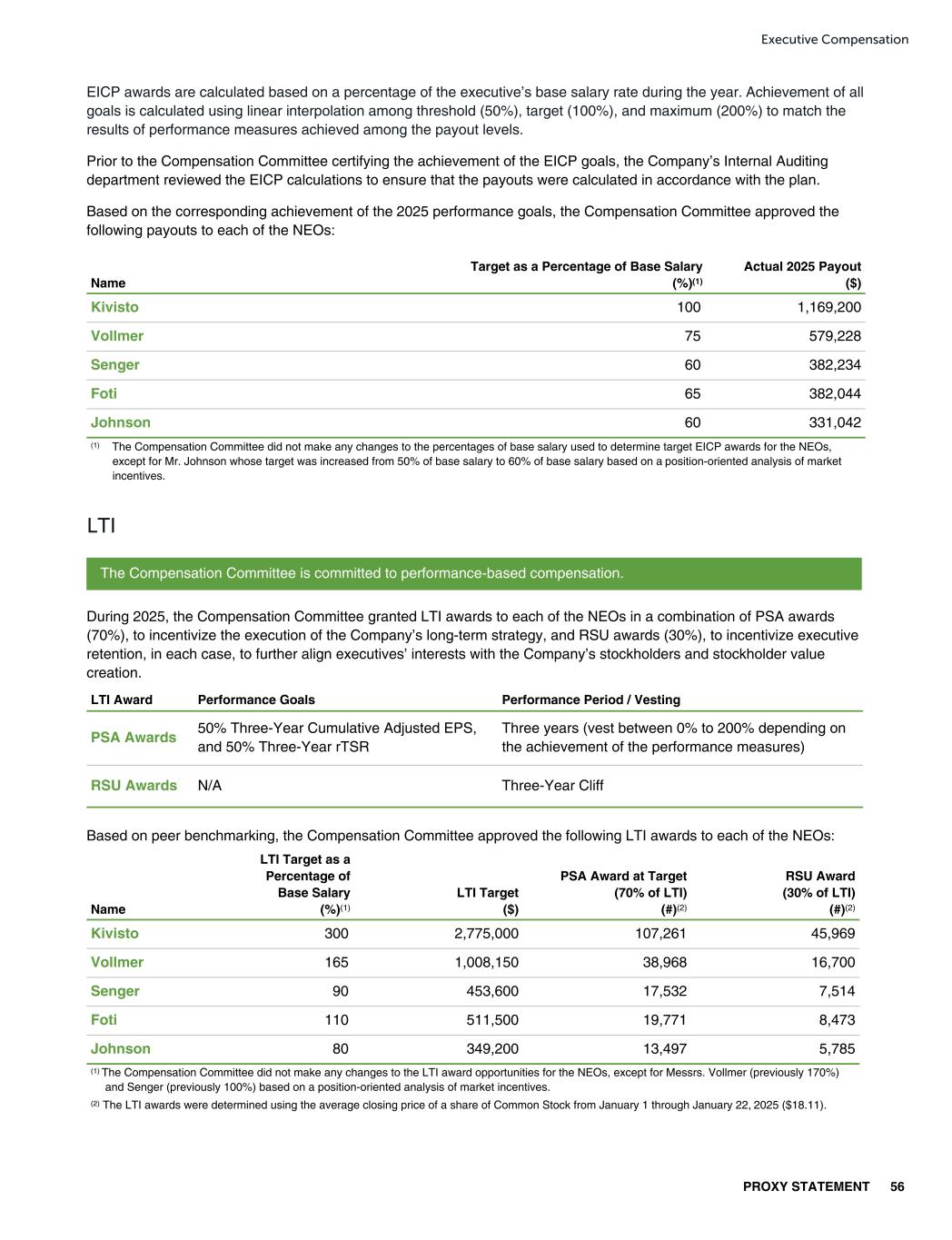 EICP awards are calculated based on a percentage of the executive’s base salary rate during the year. Achievement of all goals is calculated using linear interpolation among threshold (50%), target (100%), and maximum (200%) to match the results of performance measures achieved among the payout levels. Prior to the Compensation Committee certifying the achievement of the EICP goals, the Company’s Internal Auditing department reviewed the EICP calculations to ensure that the payouts were calculated in accordance with the plan. Based on the corresponding achievement of the 2025 performance goals, the Compensation Committee approved the following payouts to each of the NEOs: Name Target as a Percentage of Base Salary (%)(1) Actual 2025 Payout ($) Kivisto 100 1,169,200 Vollmer 75 579,228 Senger 60 382,234 Foti 65 382,044 Johnson 60 331,042 (1) The Compensation Committee did not make any changes to the percentages of base salary used to determine target EICP awards for the NEOs, except for Mr. Johnson whose target was increased from 50% of base salary to 60% of base salary based on a position-oriented analysis of market incentives. LTI The Compensation Committee is committed to performance-based compensation. During 2025, the Compensation Committee granted LTI awards to each of the NEOs in a combination of PSA awards (70%), to incentivize the execution of the Company’s long-term strategy, and RSU awards (30%), to incentivize executive retention, in each case, to further align executives’ interests with the Company’s stockholders and stockholder value creation. LTI Award Performance Goals Performance Period / Vesting PSA Awards 50% Three-Year Cumulative Adjusted EPS, and 50% Three-Year rTSR Three years (vest between 0% to 200% depending on the achievement of the performance measures) RSU Awards N/A Three-Year Cliff Based on peer benchmarking, the Compensation Committee approved the following LTI awards to each of the NEOs: Name LTI Target as a Percentage of Base Salary (%)(1) LTI Target ($) PSA Award at Target (70% of LTI) (#)(2) RSU Award (30% of LTI) (#)(2) Kivisto 300 2,775,000 107,261 45,969 Vollmer 165 1,008,150 38,968 16,700 Senger 90 453,600 17,532 7,514 Foti 110 511,500 19,771 8,473 Johnson 80 349,200 13,497 5,785 (1) The Compensation Committee did not make any changes to the LTI award opportunities for the NEOs, except for Messrs. Vollmer (previously 170%) and Senger (previously 100%) based on a position-oriented analysis of market incentives. (2) The LTI awards were determined using the average closing price of a share of Common Stock from January 1 through January 22, 2025 ($18.11). Executive Compensation PROXY STATEMENT 56