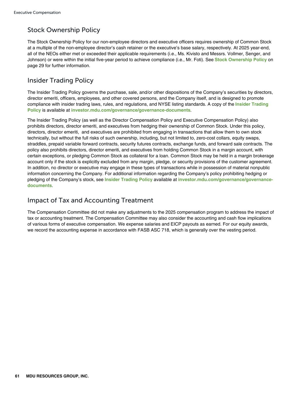 Stock Ownership Policy The Stock Ownership Policy for our non-employee directors and executive officers requires ownership of Common Stock at a multiple of the non-employee director’s cash retainer or the executive’s base salary, respectively. At 2025 year-end, all of the NEOs either met or exceeded their applicable requirements (i.e., Ms. Kivisto and Messrs. Vollmer, Senger, and Johnson) or were within the initial five-year period to achieve compliance (i.e., Mr. Foti). See Stock Ownership Policy on page 29 for further information. Insider Trading Policy The Insider Trading Policy governs the purchase, sale, and/or other dispositions of the Company’s securities by directors, director emeriti, officers, employees, and other covered persons, and the Company itself, and is designed to promote compliance with insider trading laws, rules, and regulations, and NYSE listing standards. A copy of the Insider Trading Policy is available at investor.mdu.com/governance/governance-documents. The Insider Trading Policy (as well as the Director Compensation Policy and Executive Compensation Policy) also prohibits directors, director emeriti, and executives from hedging their ownership of Common Stock. Under this policy, directors, director emeriti, and executives are prohibited from engaging in transactions that allow them to own stock technically, but without the full risks of such ownership, including, but not limited to, zero-cost collars, equity swaps, straddles, prepaid variable forward contracts, security futures contracts, exchange funds, and forward sale contracts. The policy also prohibits directors, director emeriti, and executives from holding Common Stock in a margin account, with certain exceptions, or pledging Common Stock as collateral for a loan. Common Stock may be held in a margin brokerage account only if the stock is explicitly excluded from any margin, pledge, or security provisions of the customer agreement. In addition, no director or executive may engage in these types of transactions while in possession of material nonpublic information concerning the Company. For additional information regarding the Company’s policy prohibiting hedging or pledging of the Company’s stock, see Insider Trading Policy available at investor.mdu.com/governance/governance- documents. Impact of Tax and Accounting Treatment The Compensation Committee did not make any adjustments to the 2025 compensation program to address the impact of tax or accounting treatment. The Compensation Committee may also consider the accounting and cash flow implications of various forms of executive compensation. We expense salaries and EICP payouts as earned. For our equity awards, we record the accounting expense in accordance with FASB ASC 718, which is generally over the vesting period. Executive Compensation 61 MDU RESOURCES GROUP, INC.
