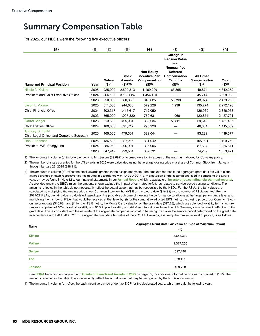 Summary Compensation Table For 2025, our NEOs were the following five executive officers: (a) (b) (c) (d) (e) (f) (g) (h) Name and Principal Position Year Salary ($)(1) Stock Awards ($)(2)(3) Non-Equity Incentive Plan Compensation ($)(4) Change in Pension Value and Nonqualified Deferred Compensation Earnings ($)(5) All Other Compensation ($)(6) Total ($)(7) Nicole A. Kivisto 2025 925,000 2,600,313 1,169,200 67,865 49,874 4,812,252 President and Chief Executive Officer 2024 966,137 3,162,624 1,454,400 — 45,744 5,628,905 2023 550,000 980,883 845,625 58,798 43,974 2,479,280 Jason L. Vollmer 2025 611,000 944,686 579,228 1,938 135,274 2,272,126 Chief Financial Officer 2024 602,317 1,415,617 712,050 — 126,969 2,856,953 2023 565,000 1,007,320 760,631 1,966 122,874 2,457,791 Garret Senger 2025 513,692 425,031 382,234 50,821 59,649 1,431,427 Chief Utilities Officer 2024 480,000 591,717 296,928 — 46,864 1,415,509 Anthony D. Foti(8) Chief Legal Officer and Corporate Secretary 2025 465,000 479,301 382,044 — 93,232 1,419,577 Rob L. Johnson 2025 436,500 327,216 331,042 — 105,001 1,199,759 President, WBI Energy, Inc. 2024 386,250 396,901 395,906 — 87,584 1,266,641 2023 347,917 293,584 337,731 — 74,239 1,053,471 (1) The amounts in column (c) include payments to Mr. Senger ($9,692) of accrued vacation in excess of the maximum allowed by Company policy. (2) The number of shares granted for the LTI awards in 2025 were calculated using the average closing price of a share of Common Stock from January 1 through January 22, 2025 ($18.11). (3) The amounts in column (d) reflect the stock awards granted in the designated years. The amounts represent the aggregate grant date fair value of the awards granted in each respective year computed in accordance with FASB ASC 718. A discussion of the assumptions used in computing the award values may be found in Note 12 to our financial statements in our Annual Report, which is available at investor.mdu.com/financials/annual-reports/. As provided under the SEC’s rules, the amounts shown exclude the impact of estimated forfeitures related to service-based vesting conditions. The amounts reflected in the table do not necessarily reflect the actual value that may be recognized by the NEOs. For the RSUs, the fair values are calculated by multiplying the closing price of our Common Stock on the NYSE on the award date ($16.83) by the number of RSUs granted. For the 2025-27 PSAs, the fair value is calculated based upon the probable outcome of meeting the performance conditions at the target performance level and multiplying the number of PSAs that would be received at that level by: (i) for the cumulative adjusted EPS metric, the closing price of our Common Stock on the grant date ($16.83), and (ii) for the rTSR metric, the Monte Carlo valuation on the grant date ($17.23), which uses blended volatility term structure ranges comprised of 50% historical volatility and 50% implied volatility and risk-free interest rates based on U.S. Treasury security rates in effect as of the grant date. This is consistent with the estimate of the aggregate compensation cost to be recognized over the service period determined on the grant date in accordance with FASB ASC 718. The aggregate grant date fair value of the 2025 PSA awards, assuming the maximum level of payout, is as follows: Name Aggregate Grant Date Fair Value of PSAs at Maximum Payout ($) Kivisto 3,653,310 Vollmer 1,327,250 Senger 597,140 Foti 673,401 Johnson 459,708 See CD&A beginning on page 46, and Grants of Plan-Based Awards in 2025 on page 65, for additional information on awards granted in 2025. The amounts reflected in the table do not necessarily reflect the actual value that may be recognized by the NEOs upon vesting. (4) The amounts in column (e) reflect the cash incentive earned under the EICP for the designated years, which are paid the following year. Executive Compensation 63 MDU RESOURCES GROUP, INC.