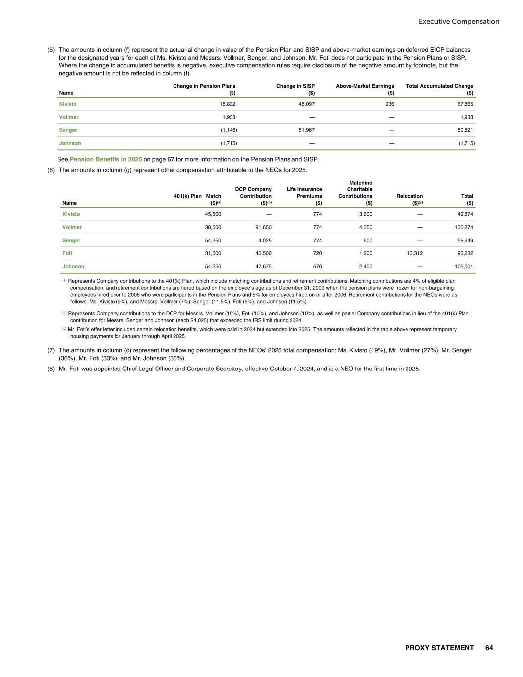 (5) The amounts in column (f) represent the actuarial change in value of the Pension Plan and SISP and above-market earnings on deferred EICP balances for the designated years for each of Ms. Kivisto and Messrs. Vollmer, Senger, and Johnson. Mr. Foti does not participate in the Pension Plans or SISP. Where the change in accumulated benefits is negative, executive compensation rules require disclosure of the negative amount by footnote, but the negative amount is not be reflected in column (f). Name Change in Pension Plans ($) Change in SISP ($) Above-Market Earnings ($) Total Accumulated Change ($) Kivisto 18,832 48,097 936 67,865 Vollmer 1,938 — — 1,938 Senger (1,146) 51,967 — 50,821 Johnson (1,715) — — (1,715) See Pension Benefits in 2025 on page 67 for more information on the Pension Plans and SISP. (6) The amounts in column (g) represent other compensation attributable to the NEOs for 2025. Name 401(k) Plan Match ($)(a) DCP Company Contribution ($)(b) Life Insurance Premiums ($) Matching Charitable Contributions ($) Relocation ($)(c) Total ($) Kivisto 45,500 — 774 3,600 — 49,874 Vollmer 38,500 91,650 774 4,350 — 135,274 Senger 54,250 4,025 774 600 — 59,649 Foti 31,500 46,500 720 1,200 13,312 93,232 Johnson 54,250 47,675 676 2,400 — 105,001 (a) Represents Company contributions to the 401(k) Plan, which include matching contributions and retirement contributions. Matching contributions are 4% of eligible plan compensation, and retirement contributions are tiered based on the employee’s age as of December 31, 2009 when the pension plans were frozen for non-bargaining employees hired prior to 2006 who were participants in the Pension Plans and 5% for employees hired on or after 2006. Retirement contributions for the NEOs were as follows: Ms. Kivisto (9%), and Messrs. Vollmer (7%), Senger (11.5%), Foti (5%), and Johnson (11.5%). (b) Represents Company contributions to the DCP for Messrs. Vollmer (15%), Foti (10%), and Johnson (10%), as well as partial Company contributions in lieu of the 401(k) Plan contribution for Messrs. Senger and Johnson (each $4,025) that exceeded the IRS limit during 2024. (c) Mr. Foti’s offer letter included certain relocation benefits, which were paid in 2024 but extended into 2025. The amounts reflected in the table above represent temporary housing payments for January through April 2025. (7) The amounts in column (c) represent the following percentages of the NEOs’ 2025 total compensation: Ms. Kivisto (19%), Mr. Vollmer (27%), Mr. Senger (36%), Mr. Foti (33%), and Mr. Johnson (36%). (8) Mr. Foti was appointed Chief Legal Officer and Corporate Secretary, effective October 7, 2024, and is a NEO for the first time in 2025. Executive Compensation PROXY STATEMENT 64