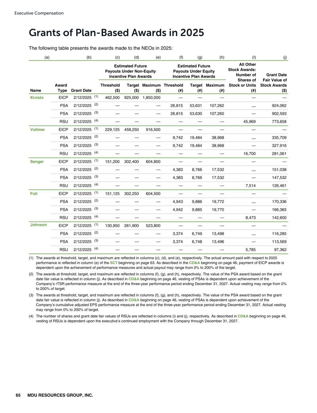 Grants of Plan-Based Awards in 2025 The following table presents the awards made to the NEOs in 2025: (a) (b) (c) (d) (e) (f) (g) (h) (I) (j) Estimated Future Payouts Under Non-Equity Incentive Plan Awards Estimated Future Payouts Under Equity Incentive Plan Awards All Other Stock Awards: Number of Shares of Stock or Units (#) Grant Date Fair Value of Stock Awards ($)Name Award Type Grant Date Threshold ($) Target ($) Maximum ($) Threshold (#) Target (#) Maximum (#) Kivisto EICP 2/12/2025 (1) 462,500 925,000 1,850,000 — — — — — PSA 2/12/2025 (2) — — — 26,815 53,631 107,262 — 924,062 PSA 2/12/2025 (3) — — — 26,815 53,630 107,260 — 902,593 RSU 2/12/2025 (4) — — — — — — 45,969 773,658 Vollmer EICP 2/12/2025 (1) 229,125 458,250 916,500 — — — — — PSA 2/12/2025 (2) — — — 9,742 19,484 38,968 — 335,709 PSA 2/12/2025 (3) — — — 9,742 19,484 38,968 — 327,916 RSU 2/12/2025 (4) — — — — — — 16,700 281,061 Senger EICP 2/12/2025 (1) 151,200 302,400 604,800 — — — — — PSA 2/12/2025 (2) — — — 4,383 8,766 17,532 — 151,038 PSA 2/12/2025 (3) — — — 4,383 8,766 17,532 — 147,532 RSU 2/12/2025 (4) — — — — — — 7,514 126,461 Foti EICP 2/12/2025 (1) 151,125 302,250 604,500 — — — — — PSA 2/12/2025 (2) — — — 4,943 9,886 19,772 — 170,336 PSA 2/12/2025 (3) — — — 4,942 9,885 19,770 — 166,365 RSU 2/12/2025 (4) — — — — — — 8,473 142,600 Johnson EICP 2/12/2025 (1) 130,950 261,900 523,800 — — — — — PSA 2/12/2025 (2) — — — 3,374 6,749 13,498 — 116,285 PSA 2/12/2025 (3) — — — 3,374 6,748 13,496 — 113,569 RSU 2/12/2025 (4) — — — — — — 5,785 97,362 (1) The awards at threshold, target, and maximum are reflected in columns (c), (d), and (e), respectively. The actual amount paid with respect to 2025 performance is reflected in column (e) of the SCT beginning on page 63. As described in the CD&A beginning on page 46, payment of EICP awards is dependent upon the achievement of performance measures and actual payout may range from 0% to 200% of the target. (2) The awards at threshold, target, and maximum are reflected in columns (f), (g), and (h), respectively. The value of the PSA award based on the grant date fair value is reflected in column (j). As described in CD&A beginning on page 46, vesting of PSAs is dependent upon achievement of the Company’s rTSR performance measure at the end of the three-year performance period ending December 31, 2027. Actual vesting may range from 0% to 200% of target. (3) The awards at threshold, target, and maximum are reflected in columns (f), (g), and (h), respectively. The value of the PSA award based on the grant date fair value is reflected in column (j). As described in CD&A beginning on page 46, vesting of PSAs is dependent upon achievement of the Company’s cumulative adjusted EPS performance measure at the end of the three-year performance period ending December 31, 2027. Actual vesting may range from 0% to 200% of target. (4) The number of shares and grant date fair values of RSUs are reflected in columns (i) and (j), respectively. As described in CD&A beginning on page 46, vesting of RSUs is dependent upon the executive’s continued employment with the Company through December 31, 2027. Executive Compensation 65 MDU RESOURCES GROUP, INC.