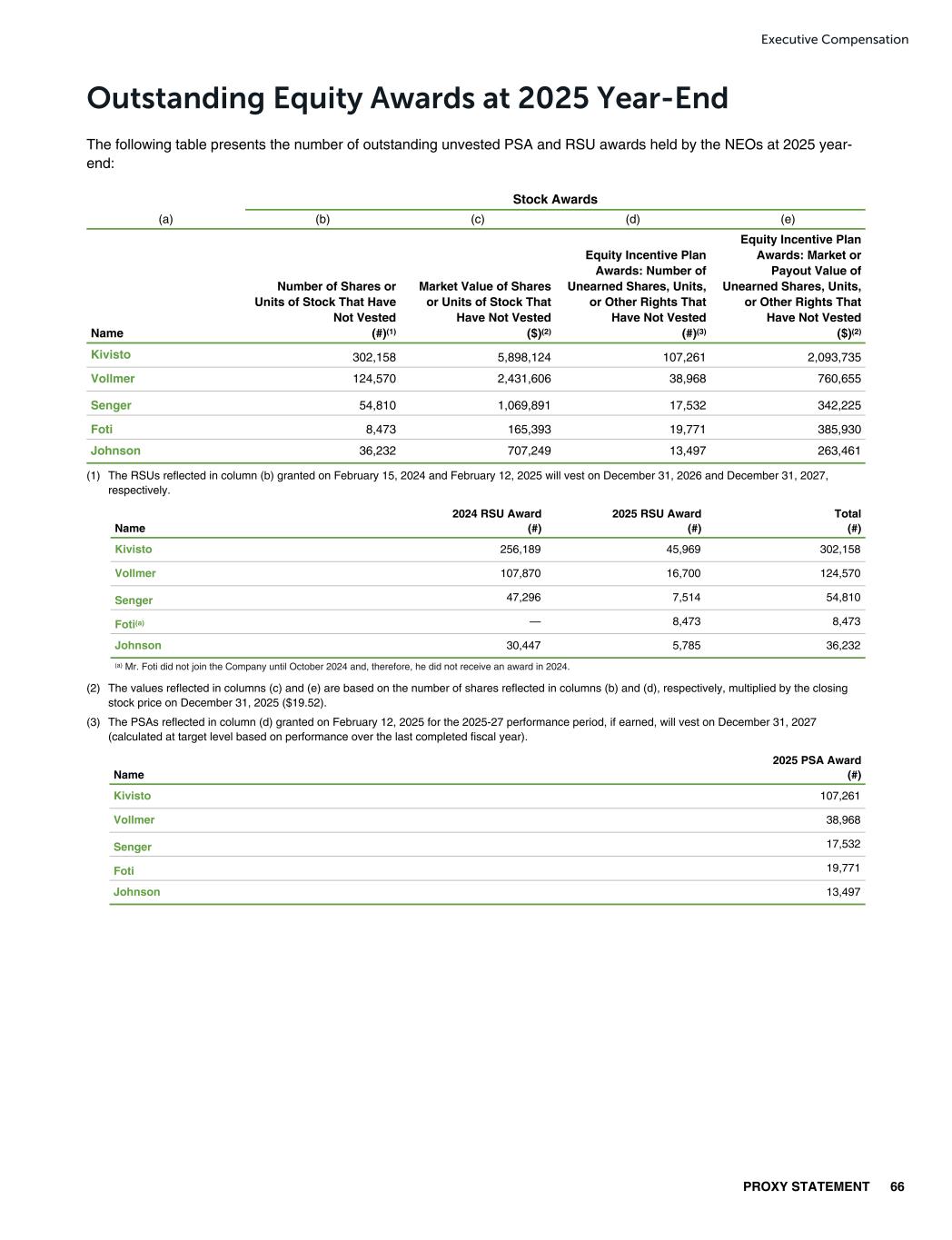 Outstanding Equity Awards at 2025 Year-End The following table presents the number of outstanding unvested PSA and RSU awards held by the NEOs at 2025 year- end: Stock Awards (a) (b) (c) (d) (e) Name Number of Shares or Units of Stock That Have Not Vested (#)(1) Market Value of Shares or Units of Stock That Have Not Vested ($)(2) Equity Incentive Plan Awards: Number of Unearned Shares, Units, or Other Rights That Have Not Vested (#)(3) Equity Incentive Plan Awards: Market or Payout Value of Unearned Shares, Units, or Other Rights That Have Not Vested ($)(2) Kivisto 302,158 5,898,124 107,261 2,093,735 Vollmer 124,570 2,431,606 38,968 760,655 Senger 54,810 1,069,891 17,532 342,225 Foti 8,473 165,393 19,771 385,930 Johnson 36,232 707,249 13,497 263,461 (1) The RSUs reflected in column (b) granted on February 15, 2024 and February 12, 2025 will vest on December 31, 2026 and December 31, 2027, respectively. Name 2024 RSU Award (#) 2025 RSU Award (#) Total (#) Kivisto 256,189 45,969 302,158 Vollmer 107,870 16,700 124,570 Senger 47,296 7,514 54,810 Foti(a) — 8,473 8,473 Johnson 30,447 5,785 36,232 (a) Mr. Foti did not join the Company until October 2024 and, therefore, he did not receive an award in 2024. (2) The values reflected in columns (c) and (e) are based on the number of shares reflected in columns (b) and (d), respectively, multiplied by the closing stock price on December 31, 2025 ($19.52). (3) The PSAs reflected in column (d) granted on February 12, 2025 for the 2025-27 performance period, if earned, will vest on December 31, 2027 (calculated at target level based on performance over the last completed fiscal year). Name 2025 PSA Award (#) Kivisto 107,261 Vollmer 38,968 Senger 17,532 Foti 19,771 Johnson 13,497 Executive Compensation PROXY STATEMENT 66