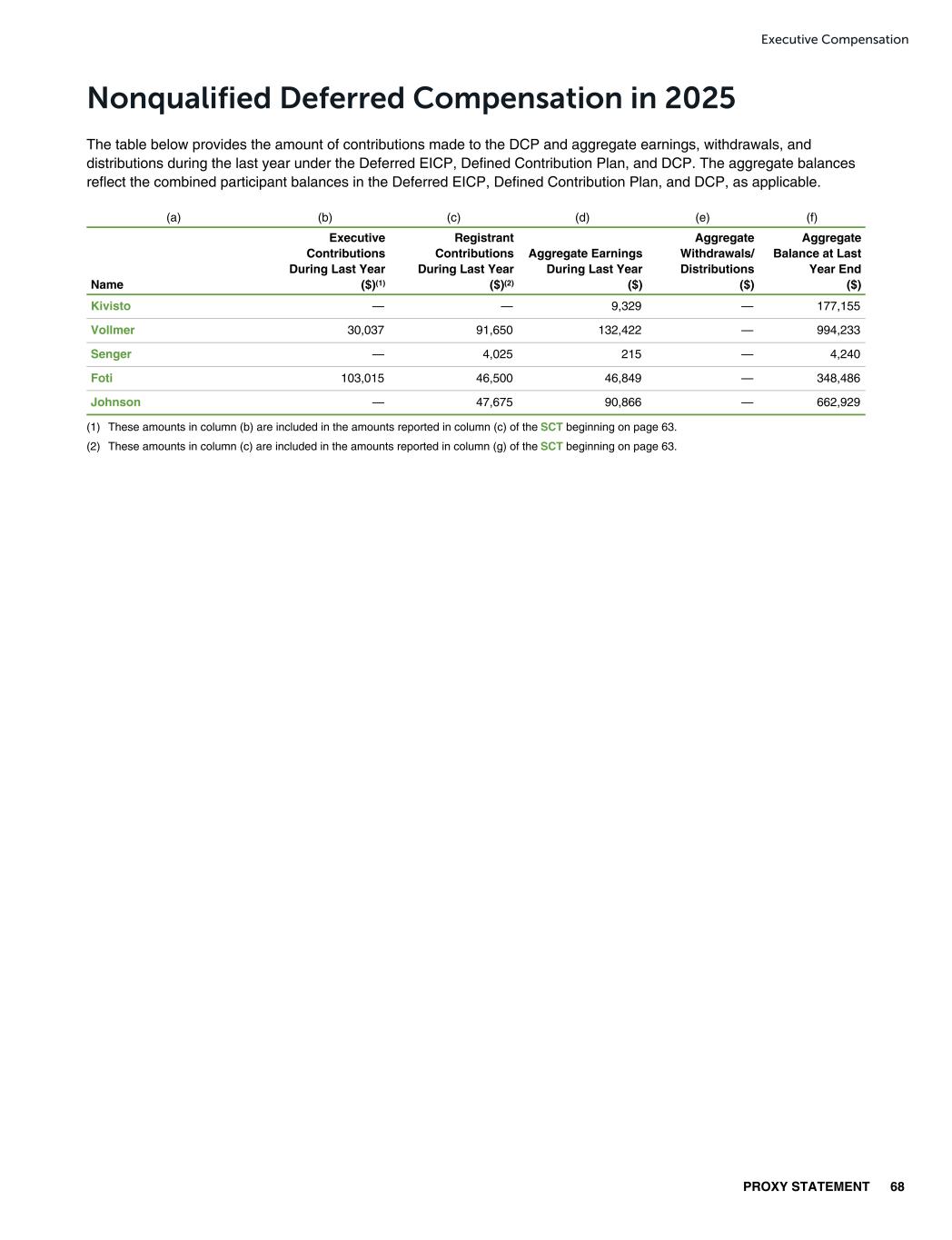 Nonqualified Deferred Compensation in 2025 The table below provides the amount of contributions made to the DCP and aggregate earnings, withdrawals, and distributions during the last year under the Deferred EICP, Defined Contribution Plan, and DCP. The aggregate balances reflect the combined participant balances in the Deferred EICP, Defined Contribution Plan, and DCP, as applicable. (a) (b) (c) (d) (e) (f) Name Executive Contributions During Last Year ($)(1) Registrant Contributions During Last Year ($)(2) Aggregate Earnings During Last Year ($) Aggregate Withdrawals/ Distributions ($) Aggregate Balance at Last Year End ($) Kivisto — — 9,329 — 177,155 Vollmer 30,037 91,650 132,422 — 994,233 Senger — 4,025 215 — 4,240 Foti 103,015 46,500 46,849 — 348,486 Johnson — 47,675 90,866 — 662,929 (1) These amounts in column (b) are included in the amounts reported in column (c) of the SCT beginning on page 63. (2) These amounts in column (c) are included in the amounts reported in column (g) of the SCT beginning on page 63. Executive Compensation PROXY STATEMENT 68