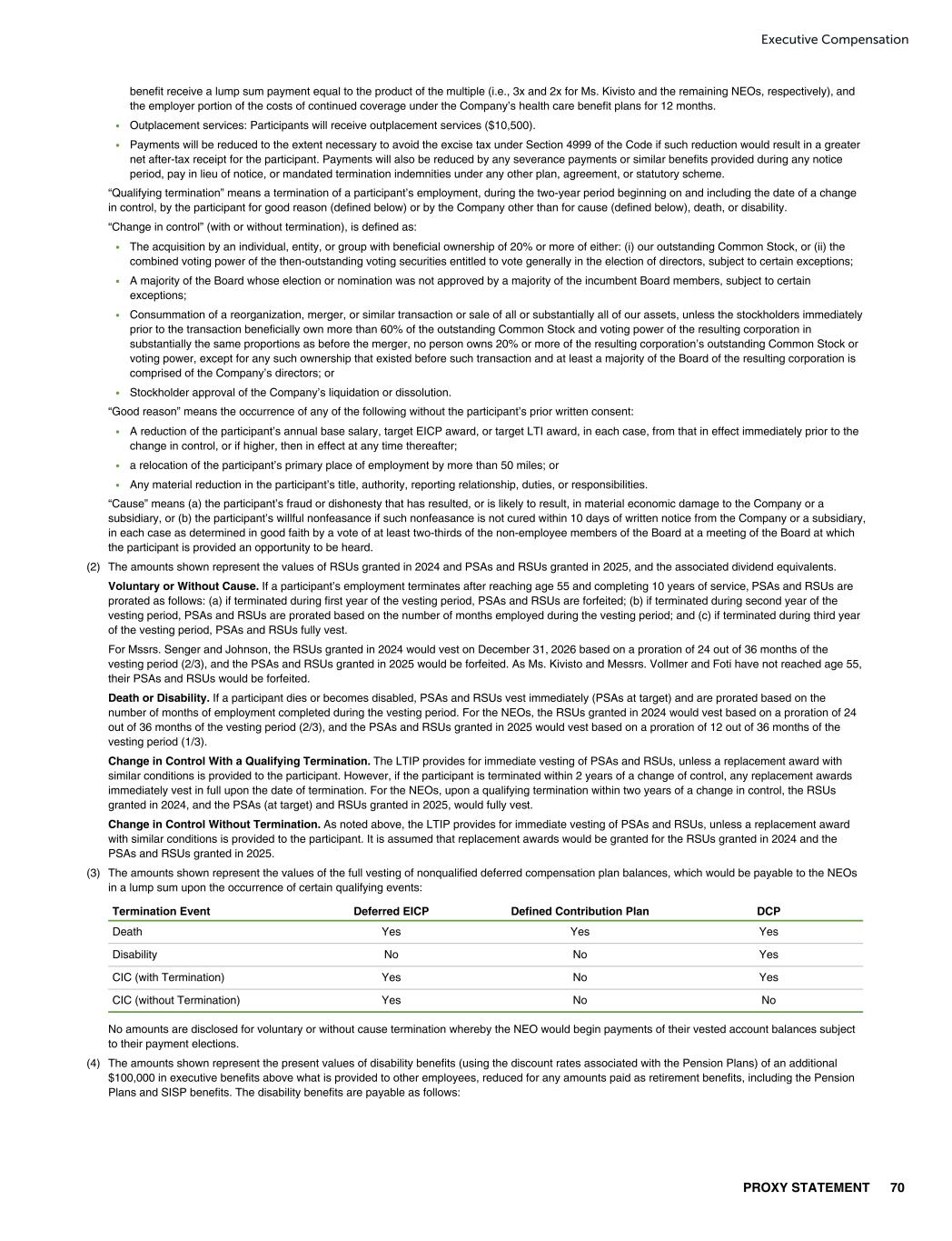 benefit receive a lump sum payment equal to the product of the multiple (i.e., 3x and 2x for Ms. Kivisto and the remaining NEOs, respectively), and the employer portion of the costs of continued coverage under the Company’s health care benefit plans for 12 months. • Outplacement services: Participants will receive outplacement services ($10,500). • Payments will be reduced to the extent necessary to avoid the excise tax under Section 4999 of the Code if such reduction would result in a greater net after-tax receipt for the participant. Payments will also be reduced by any severance payments or similar benefits provided during any notice period, pay in lieu of notice, or mandated termination indemnities under any other plan, agreement, or statutory scheme. “Qualifying termination” means a termination of a participant’s employment, during the two-year period beginning on and including the date of a change in control, by the participant for good reason (defined below) or by the Company other than for cause (defined below), death, or disability. “Change in control” (with or without termination), is defined as: • The acquisition by an individual, entity, or group with beneficial ownership of 20% or more of either: (i) our outstanding Common Stock, or (ii) the combined voting power of the then-outstanding voting securities entitled to vote generally in the election of directors, subject to certain exceptions; • A majority of the Board whose election or nomination was not approved by a majority of the incumbent Board members, subject to certain exceptions; • Consummation of a reorganization, merger, or similar transaction or sale of all or substantially all of our assets, unless the stockholders immediately prior to the transaction beneficially own more than 60% of the outstanding Common Stock and voting power of the resulting corporation in substantially the same proportions as before the merger, no person owns 20% or more of the resulting corporation’s outstanding Common Stock or voting power, except for any such ownership that existed before such transaction and at least a majority of the Board of the resulting corporation is comprised of the Company’s directors; or • Stockholder approval of the Company’s liquidation or dissolution. “Good reason” means the occurrence of any of the following without the participant’s prior written consent: • A reduction of the participant’s annual base salary, target EICP award, or target LTI award, in each case, from that in effect immediately prior to the change in control, or if higher, then in effect at any time thereafter; • a relocation of the participant’s primary place of employment by more than 50 miles; or • Any material reduction in the participant’s title, authority, reporting relationship, duties, or responsibilities. “Cause” means (a) the participant’s fraud or dishonesty that has resulted, or is likely to result, in material economic damage to the Company or a subsidiary, or (b) the participant’s willful nonfeasance if such nonfeasance is not cured within 10 days of written notice from the Company or a subsidiary, in each case as determined in good faith by a vote of at least two-thirds of the non-employee members of the Board at a meeting of the Board at which the participant is provided an opportunity to be heard. (2) The amounts shown represent the values of RSUs granted in 2024 and PSAs and RSUs granted in 2025, and the associated dividend equivalents. Voluntary or Without Cause. If a participant’s employment terminates after reaching age 55 and completing 10 years of service, PSAs and RSUs are prorated as follows: (a) if terminated during first year of the vesting period, PSAs and RSUs are forfeited; (b) if terminated during second year of the vesting period, PSAs and RSUs are prorated based on the number of months employed during the vesting period; and (c) if terminated during third year of the vesting period, PSAs and RSUs fully vest. For Mssrs. Senger and Johnson, the RSUs granted in 2024 would vest on December 31, 2026 based on a proration of 24 out of 36 months of the vesting period (2/3), and the PSAs and RSUs granted in 2025 would be forfeited. As Ms. Kivisto and Messrs. Vollmer and Foti have not reached age 55, their PSAs and RSUs would be forfeited. Death or Disability. If a participant dies or becomes disabled, PSAs and RSUs vest immediately (PSAs at target) and are prorated based on the number of months of employment completed during the vesting period. For the NEOs, the RSUs granted in 2024 would vest based on a proration of 24 out of 36 months of the vesting period (2/3), and the PSAs and RSUs granted in 2025 would vest based on a proration of 12 out of 36 months of the vesting period (1/3). Change in Control With a Qualifying Termination. The LTIP provides for immediate vesting of PSAs and RSUs, unless a replacement award with similar conditions is provided to the participant. However, if the participant is terminated within 2 years of a change of control, any replacement awards immediately vest in full upon the date of termination. For the NEOs, upon a qualifying termination within two years of a change in control, the RSUs granted in 2024, and the PSAs (at target) and RSUs granted in 2025, would fully vest. Change in Control Without Termination. As noted above, the LTIP provides for immediate vesting of PSAs and RSUs, unless a replacement award with similar conditions is provided to the participant. It is assumed that replacement awards would be granted for the RSUs granted in 2024 and the PSAs and RSUs granted in 2025. (3) The amounts shown represent the values of the full vesting of nonqualified deferred compensation plan balances, which would be payable to the NEOs in a lump sum upon the occurrence of certain qualifying events: Termination Event Deferred EICP Defined Contribution Plan DCP Death Yes Yes Yes Disability No No Yes CIC (with Termination) Yes No Yes CI