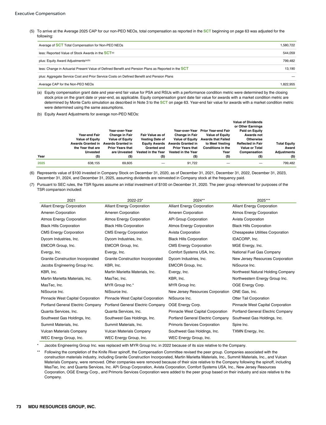 (5) To arrive at the Average 2025 CAP for our non-PEO NEOs, total compensation as reported in the SCT beginning on page 63 was adjusted for the following: Average of SCT Total Compensation for Non-PEO NEOs 1,580,722 less: Reported Value of Stock Awards in the SCT(a) 544,059 plus: Equity Award Adjustments(a)(b) 799,482 less: Change in Actuarial Present Value of Defined Benefit and Pension Plans as Reported in the SCT 13,190 plus: Aggregate Service Cost and Prior Service Costs on Defined Benefit and Pension Plans — Average CAP for the Non-PEO NEOs 1,822,955 (a) Equity compensation grant date and year-end fair value for PSA and RSUs with a performance condition metric were determined by the closing stock price on the grant date or year-end, as applicable. Equity compensation grant date fair value for awards with a market condition metric are determined by Monte Carlo simulation as described in Note 3 to the SCT on page 63. Year-end fair value for awards with a market condition metric were determined using the same assumptions. (b) Equity Award Adjustments for average non-PEO NEOs: Year Year-end Fair Value of Equity Awards Granted in the Year that are Unvested ($) Year-over-Year Change in Fair Value of Equity Awards Granted in Prior Years that are Unvested ($) Fair Value as of Vesting Date of Equity Awards Granted and Vested in the Year ($) Year-over-Year Change in Fair Value of Equity Awards Granted in Prior Years that Vested in the Year ($) Prior Year-end Fair Value of Equity Awards that Failed to Meet Vesting Conditions in the Year ($) Value of Dividends or Other Earnings Paid on Equity Awards not Otherwise Reflected in Fair Value or Total Compensation ($) Total Equity Award Adjustments ($) 2025 638,155 69,605 — 91,722 — — 799,482 (6) Represents value of $100 invested in Company Stock on December 31, 2020, as of December 31, 2021, December 31, 2022, December 31, 2023, December 31, 2024, and December 31, 2025, assuming dividends are reinvested in Company stock at the frequency paid. (7) Pursuant to SEC rules, the TSR figures assume an initial investment of $100 on December 31, 2020. The peer group referenced for purposes of the TSR comparison included: 2021 2022-23* 2024** 2025*** Alliant Energy Corporation Alliant Energy Corporation Alliant Energy Corporation Alliant Energy Corporation Ameren Corporation Ameren Corporation Ameren Corporation Atmos Energy Corporation Atmos Energy Corporation Atmos Energy Corporation APi Group Corporation Avista Corporation Black Hills Corporation Black Hills Corporation Atmos Energy Corporation Black Hills Corporation CMS Energy Corporation CMS Energy Corporation Avista Corporation Chesapeake Utilities Corporation Dycom Industries, Inc. Dycom Industries, Inc. Black Hills Corporation IDACORP, Inc. EMCOR Group, Inc. EMCOR Group, Inc. CMS Energy Corporation MGE Energy, Inc. Evergy, Inc. Evergy, Inc. Comfort Systems USA, Inc. National Fuel Gas Company Granite Construction Incorporated Granite Construction Incorporated Dycom Industries, Inc. New Jersey Resources Corporation Jacobs Engineering Group Inc. KBR, Inc. EMCOR Group, Inc. NiSource Inc. KBR, Inc. Martin Marietta Materials, Inc. Evergy, Inc. Northwest Natural Holding Company Martin Marietta Materials, Inc. MasTec, Inc. KBR, Inc. Northwestern Energy Group Inc. MasTec, Inc. MYR Group Inc.* MYR Group Inc. OGE Energy Corp. NiSource Inc. NiSource Inc. New Jersey Resources Corporation ONE Gas, Inc. Pinnacle West Capital Corporation Pinnacle West Capital Corporation NiSource Inc. Otter Tail Corporation Portland General Electric Company Portland General Electric Company OGE Energy Corp. Pinnacle West Capital Corporation Quanta Services, Inc. Quanta Services, Inc. Pinnacle West Capital Corporation Portland General Electric Company Southwest Gas Holdings, Inc. Southwest Gas Holdings, Inc. Portland General Electric Company Southwest Gas Holdings, Inc. Summit Materials, Inc. Summit Materials, Inc. Primoris Services Corporation Spire Inc. Vulcan Materials Company Vulcan Materials Company Southwest Gas Holdings, Inc. TXMN Energy, Inc. WEC Energy Group, Inc. WEC Energy Group, Inc. WEC Energy Group, Inc. * Jacobs Engineering Group Inc. was replaced with MYR Group Inc. in 2022 because of its size relative to the Company. ** Following the completion of the Knife River spinoff, the Compensation Committee revised the peer group. Companies associated with the construction materials industry, including Granite Construction Incorporated, Martin Marietta Materials, Inc., Summit Materials, Inc., and Vulcan Materials Company, were removed. Other companies were removed because of their size relative to the Company following the spinoff, including MasTec, Inc. and Quanta Services, Inc. APi Group Corporation, Avista Corporation, Comfort Systems USA, Inc., New Jersey Resources Corporation, OGE Energy Corp., and Primoris Services Corporation were added to the peer group based on their industry and size relative to the Company. Executive Compensation 73 MDU RESOURCES GROUP, INC.