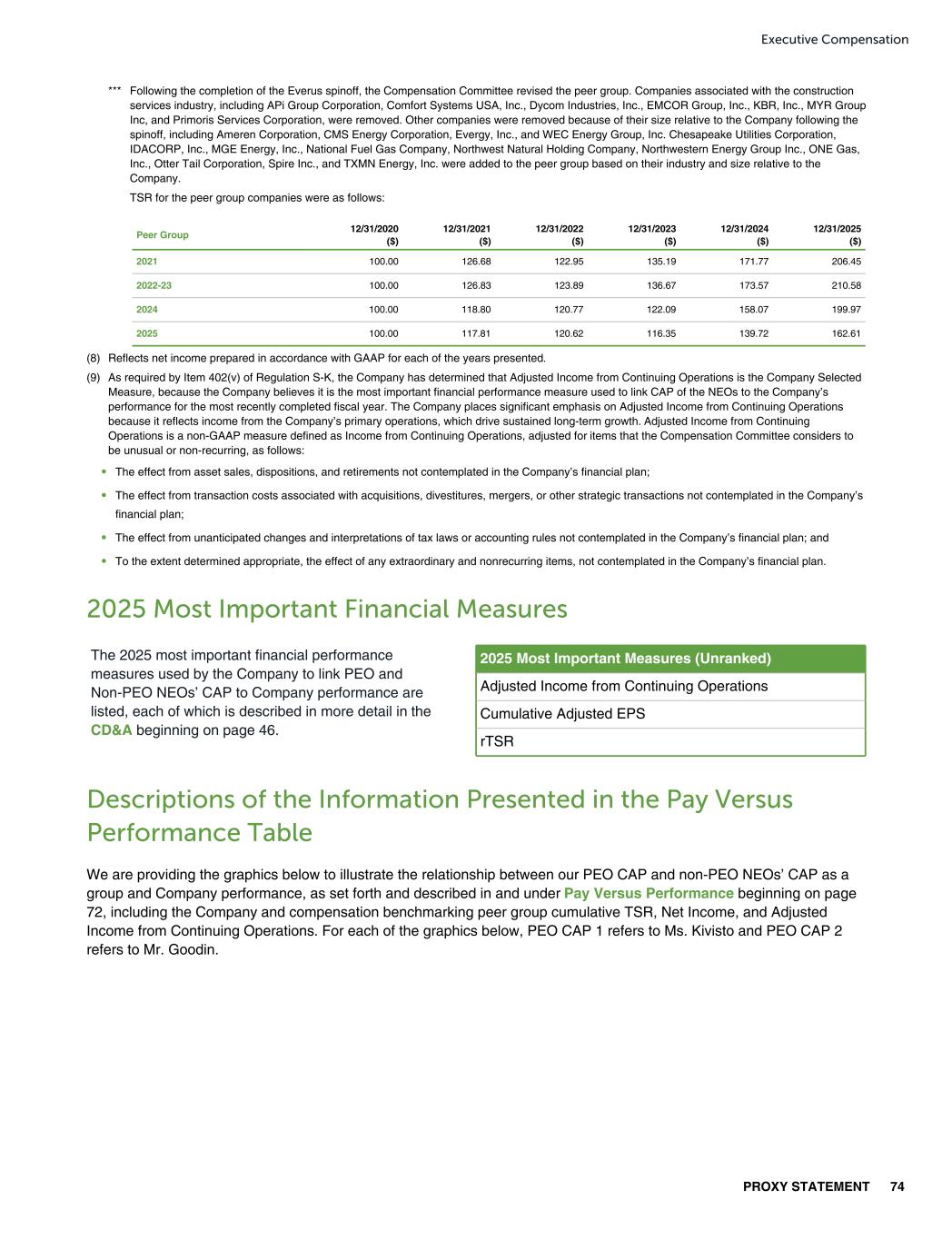 *** Following the completion of the Everus spinoff, the Compensation Committee revised the peer group. Companies associated with the construction services industry, including APi Group Corporation, Comfort Systems USA, Inc., Dycom Industries, Inc., EMCOR Group, Inc., KBR, Inc., MYR Group Inc, and Primoris Services Corporation, were removed. Other companies were removed because of their size relative to the Company following the spinoff, including Ameren Corporation, CMS Energy Corporation, Evergy, Inc., and WEC Energy Group, Inc. Chesapeake Utilities Corporation, IDACORP, Inc., MGE Energy, Inc., National Fuel Gas Company, Northwest Natural Holding Company, Northwestern Energy Group Inc., ONE Gas, Inc., Otter Tail Corporation, Spire Inc., and TXMN Energy, Inc. were added to the peer group based on their industry and size relative to the Company. TSR for the peer group companies were as follows: Peer Group 12/31/2020 ($) 12/31/2021 ($) 12/31/2022 ($) 12/31/2023 ($) 12/31/2024 ($) 12/31/2025 ($) 2021 100.00 126.68 122.95 135.19 171.77 206.45 2022-23 100.00 126.83 123.89 136.67 173.57 210.58 2024 100.00 118.80 120.77 122.09 158.07 199.97 2025 100.00 117.81 120.62 116.35 139.72 162.61 (8) Reflects net income prepared in accordance with GAAP for each of the years presented. (9) As required by Item 402(v) of Regulation S-K, the Company has determined that Adjusted Income from Continuing Operations is the Company Selected Measure, because the Company believes it is the most important financial performance measure used to link CAP of the NEOs to the Company’s performance for the most recently completed fiscal year. The Company places significant emphasis on Adjusted Income from Continuing Operations because it reflects income from the Company’s primary operations, which drive sustained long-term growth. Adjusted Income from Continuing Operations is a non-GAAP measure defined as Income from Continuing Operations, adjusted for items that the Compensation Committee considers to be unusual or non-recurring, as follows: • The effect from asset sales, dispositions, and retirements not contemplated in the Company’s financial plan; • The effect from transaction costs associated with acquisitions, divestitures, mergers, or other strategic transactions not contemplated in the Company’s financial plan; • The effect from unanticipated changes and interpretations of tax laws or accounting rules not contemplated in the Company’s financial plan; and • To the extent determined appropriate, the effect of any extraordinary and nonrecurring items, not contemplated in the Company’s financial plan. 2025 Most Important Financial Measures The 2025 most important financial performance measures used by the Company to link PEO and Non-PEO NEOs’ CAP to Company performance are listed, each of which is described in more detail in the CD&A beginning on page 46. 2025 Most Important Measures (Unranked) Adjusted Income from Continuing Operations Cumulative Adjusted EPS rTSR Descriptions of the Information Presented in the Pay Versus Performance Table We are providing the graphics below to illustrate the relationship between our PEO CAP and non-PEO NEOs’ CAP as a group and Company performance, as set forth and described in and under Pay Versus Performance beginning on page 72, including the Company and compensation benchmarking peer group cumulative TSR, Net Income, and Adjusted Income from Continuing Operations. For each of the graphics below, PEO CAP 1 refers to Ms. Kivisto and PEO CAP 2 refers to Mr. Goodin. Executive Compensation PROXY STATEMENT 74