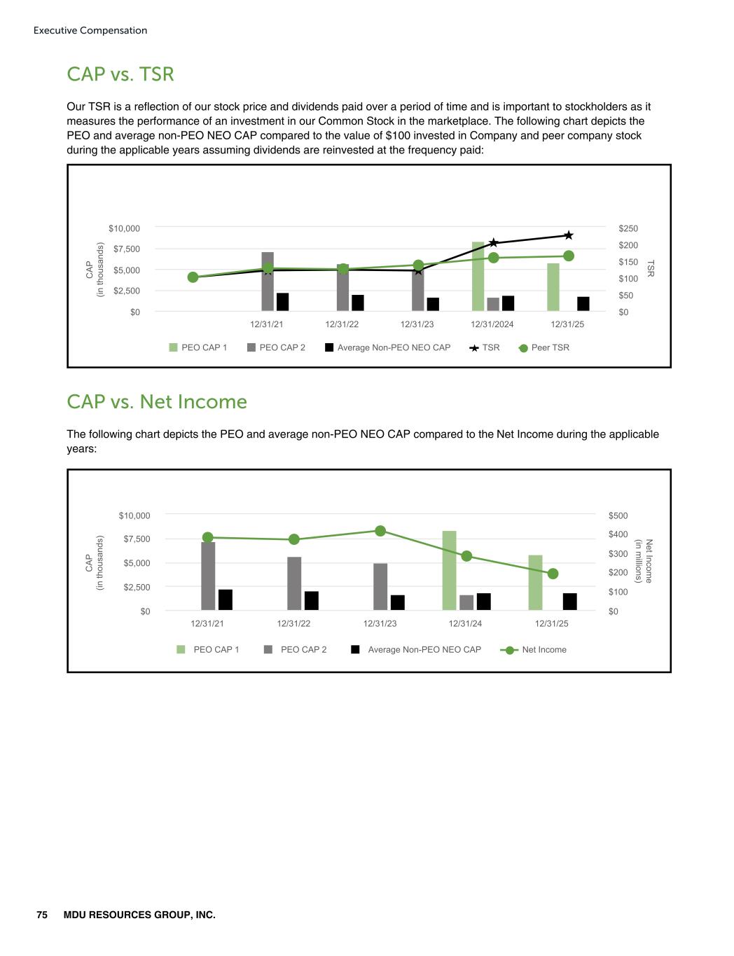 CAP vs. TSR Our TSR is a reflection of our stock price and dividends paid over a period of time and is important to stockholders as it measures the performance of an investment in our Common Stock in the marketplace. The following chart depicts the PEO and average non-PEO NEO CAP compared to the value of $100 invested in Company and peer company stock during the applicable years assuming dividends are reinvested at the frequency paid: C A P (in th ou sa nd s) TS R PEO CAP 1 PEO CAP 2 Average Non-PEO NEO CAP TSR Peer TSR 12/31/21 12/31/22 12/31/23 12/31/2024 12/31/25 $0 $2,500 $5,000 $7,500 $10,000 $0 $50 $100 $150 $200 $250 CAP vs. Net Income The following chart depicts the PEO and average non-PEO NEO CAP compared to the Net Income during the applicable years: C A P (in th ou sa nd s) N et Incom e (in m illions) PEO CAP 1 PEO CAP 2 Average Non-PEO NEO CAP Net Income 12/31/21 12/31/22 12/31/23 12/31/24 12/31/25 $0 $2,500 $5,000 $7,500 $10,000 $0 $100 $200 $300 $400 $500 Executive Compensation 75 MDU RESOURCES GROUP, INC.