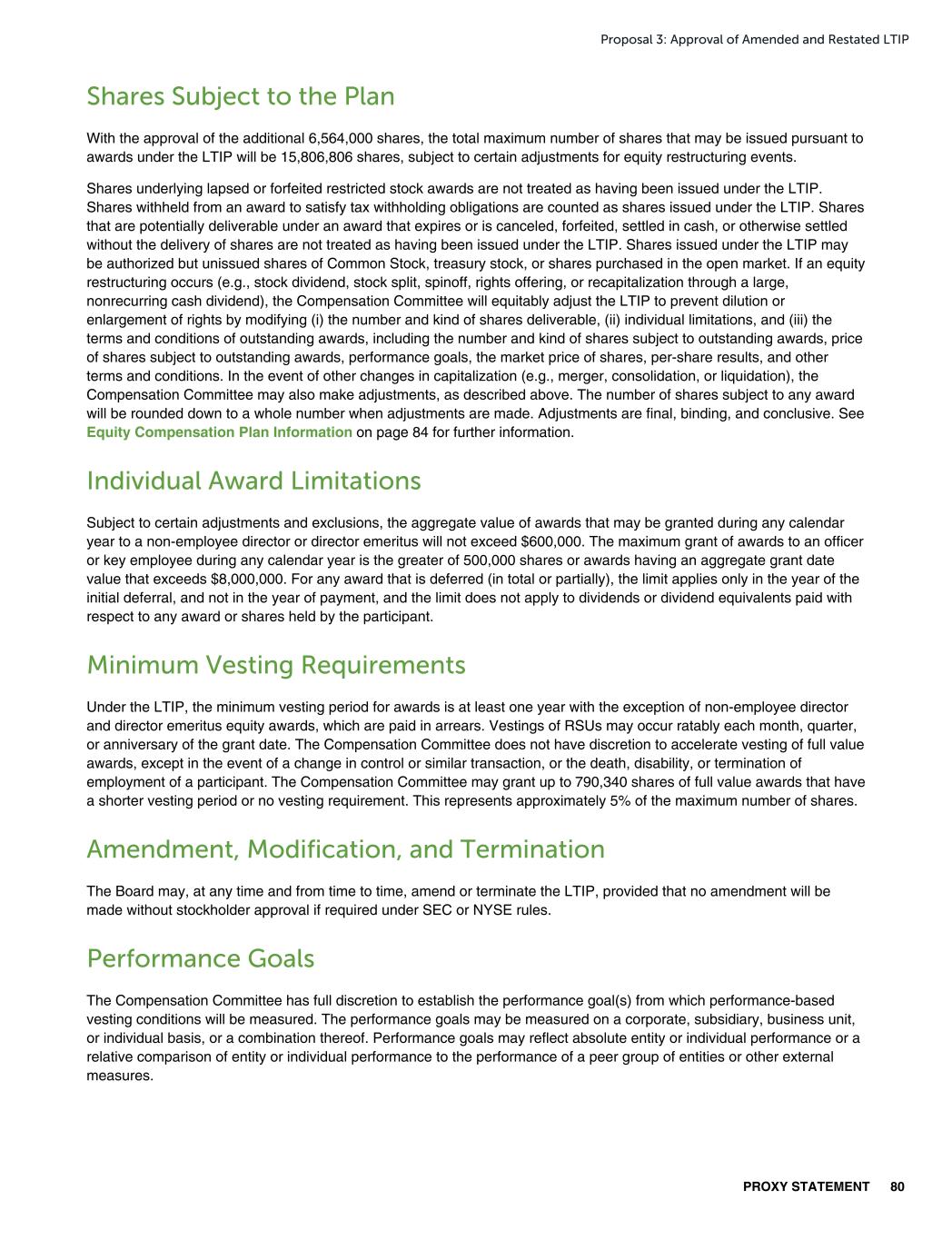 Shares Subject to the Plan With the approval of the additional 6,564,000 shares, the total maximum number of shares that may be issued pursuant to awards under the LTIP will be 15,806,806 shares, subject to certain adjustments for equity restructuring events. Shares underlying lapsed or forfeited restricted stock awards are not treated as having been issued under the LTIP. Shares withheld from an award to satisfy tax withholding obligations are counted as shares issued under the LTIP. Shares that are potentially deliverable under an award that expires or is canceled, forfeited, settled in cash, or otherwise settled without the delivery of shares are not treated as having been issued under the LTIP. Shares issued under the LTIP may be authorized but unissued shares of Common Stock, treasury stock, or shares purchased in the open market. If an equity restructuring occurs (e.g., stock dividend, stock split, spinoff, rights offering, or recapitalization through a large, nonrecurring cash dividend), the Compensation Committee will equitably adjust the LTIP to prevent dilution or enlargement of rights by modifying (i) the number and kind of shares deliverable, (ii) individual limitations, and (iii) the terms and conditions of outstanding awards, including the number and kind of shares subject to outstanding awards, price of shares subject to outstanding awards, performance goals, the market price of shares, per-share results, and other terms and conditions. In the event of other changes in capitalization (e.g., merger, consolidation, or liquidation), the Compensation Committee may also make adjustments, as described above. The number of shares subject to any award will be rounded down to a whole number when adjustments are made. Adjustments are final, binding, and conclusive. See Equity Compensation Plan Information on page 84 for further information. Individual Award Limitations Subject to certain adjustments and exclusions, the aggregate value of awards that may be granted during any calendar year to a non-employee director or director emeritus will not exceed $600,000. The maximum grant of awards to an officer or key employee during any calendar year is the greater of 500,000 shares or awards having an aggregate grant date value that exceeds $8,000,000. For any award that is deferred (in total or partially), the limit applies only in the year of the initial deferral, and not in the year of payment, and the limit does not apply to dividends or dividend equivalents paid with respect to any award or shares held by the participant. Minimum Vesting Requirements Under the LTIP, the minimum vesting period for awards is at least one year with the exception of non-employee director and director emeritus equity awards, which are paid in arrears. Vestings of RSUs may occur ratably each month, quarter, or anniversary of the grant date. The Compensation Committee does not have discretion to accelerate vesting of full value awards, except in the event of a change in control or similar transaction, or the death, disability, or termination of employment of a participant. The Compensation Committee may grant up to 790,340 shares of full value awards that have a shorter vesting period or no vesting requirement. This represents approximately 5% of the maximum number of shares. Amendment, Modification, and Termination The Board may, at any time and from time to time, amend or terminate the LTIP, provided that no amendment will be made without stockholder approval if required under SEC or NYSE rules. Performance Goals The Compensation Committee has full discretion to establish the performance goal(s) from which performance-based vesting conditions will be measured. The performance goals may be measured on a corporate, subsidiary, business unit, or individual basis, or a combination thereof. Performance goals may reflect absolute entity or individual performance or a relative comparison of entity or individual performance to the performance of a peer group of entities or other external measures. Proposal 3: Approval of Amended and Restated LTIP PROXY STATEMENT 80