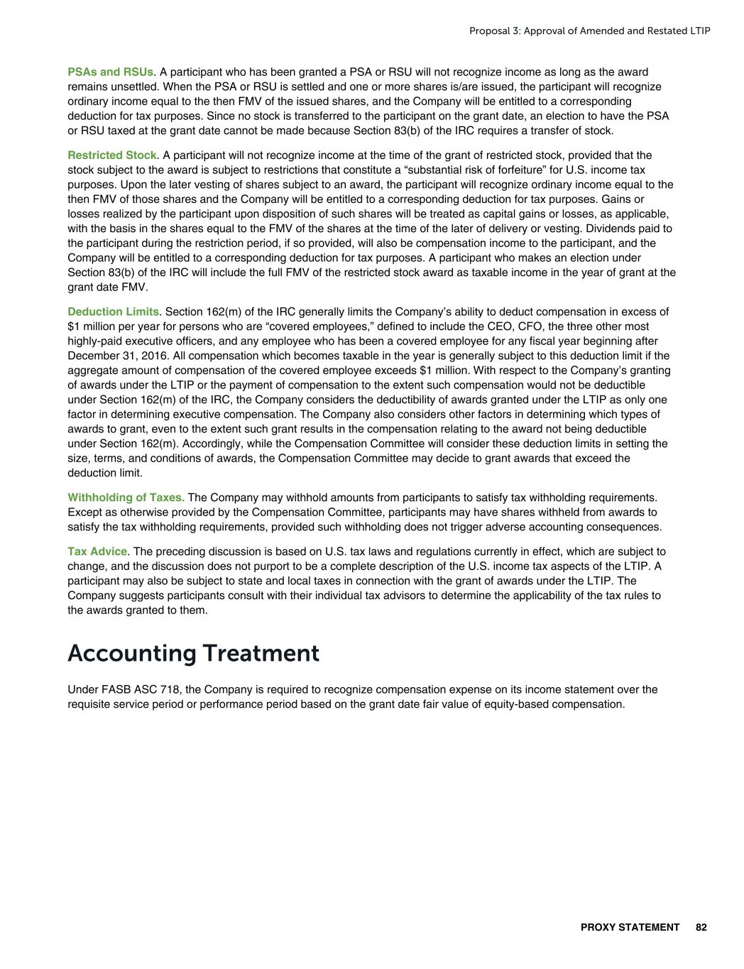 PSAs and RSUs. A participant who has been granted a PSA or RSU will not recognize income as long as the award remains unsettled. When the PSA or RSU is settled and one or more shares is/are issued, the participant will recognize ordinary income equal to the then FMV of the issued shares, and the Company will be entitled to a corresponding deduction for tax purposes. Since no stock is transferred to the participant on the grant date, an election to have the PSA or RSU taxed at the grant date cannot be made because Section 83(b) of the IRC requires a transfer of stock. Restricted Stock. A participant will not recognize income at the time of the grant of restricted stock, provided that the stock subject to the award is subject to restrictions that constitute a “substantial risk of forfeiture” for U.S. income tax purposes. Upon the later vesting of shares subject to an award, the participant will recognize ordinary income equal to the then FMV of those shares and the Company will be entitled to a corresponding deduction for tax purposes. Gains or losses realized by the participant upon disposition of such shares will be treated as capital gains or losses, as applicable, with the basis in the shares equal to the FMV of the shares at the time of the later of delivery or vesting. Dividends paid to the participant during the restriction period, if so provided, will also be compensation income to the participant, and the Company will be entitled to a corresponding deduction for tax purposes. A participant who makes an election under Section 83(b) of the IRC will include the full FMV of the restricted stock award as taxable income in the year of grant at the grant date FMV. Deduction Limits. Section 162(m) of the IRC generally limits the Company’s ability to deduct compensation in excess of $1 million per year for persons who are “covered employees,” defined to include the CEO, CFO, the three other most highly-paid executive officers, and any employee who has been a covered employee for any fiscal year beginning after December 31, 2016. All compensation which becomes taxable in the year is generally subject to this deduction limit if the aggregate amount of compensation of the covered employee exceeds $1 million. With respect to the Company’s granting of awards under the LTIP or the payment of compensation to the extent such compensation would not be deductible under Section 162(m) of the IRC, the Company considers the deductibility of awards granted under the LTIP as only one factor in determining executive compensation. The Company also considers other factors in determining which types of awards to grant, even to the extent such grant results in the compensation relating to the award not being deductible under Section 162(m). Accordingly, while the Compensation Committee will consider these deduction limits in setting the size, terms, and conditions of awards, the Compensation Committee may decide to grant awards that exceed the deduction limit. Withholding of Taxes. The Company may withhold amounts from participants to satisfy tax withholding requirements. Except as otherwise provided by the Compensation Committee, participants may have shares withheld from awards to satisfy the tax withholding requirements, provided such withholding does not trigger adverse accounting consequences. Tax Advice. The preceding discussion is based on U.S. tax laws and regulations currently in effect, which are subject to change, and the discussion does not purport to be a complete description of the U.S. income tax aspects of the LTIP. A participant may also be subject to state and local taxes in connection with the grant of awards under the LTIP. The Company suggests participants consult with their individual tax advisors to determine the applicability of the tax rules to the awards granted to them. Accounting Treatment Under FASB ASC 718, the Company is required to recognize compensation expense on its income statement over the requisite service period or performance period based on the grant date fair value of equity-based compensation. Proposal 3: Approval of Amended and Restated LTIP PROXY STATEMENT 82