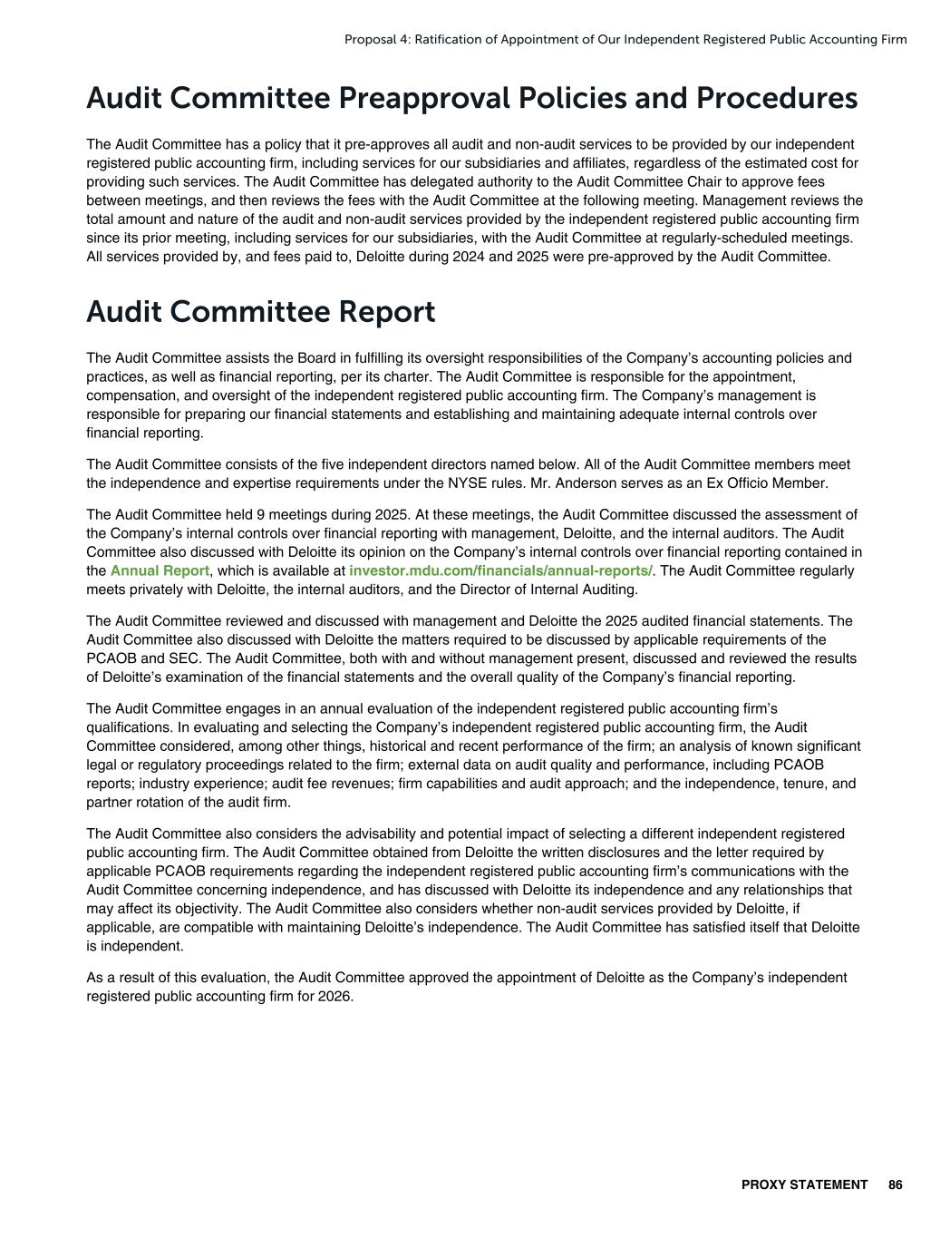 Audit Committee Preapproval Policies and Procedures The Audit Committee has a policy that it pre-approves all audit and non-audit services to be provided by our independent registered public accounting firm, including services for our subsidiaries and affiliates, regardless of the estimated cost for providing such services. The Audit Committee has delegated authority to the Audit Committee Chair to approve fees between meetings, and then reviews the fees with the Audit Committee at the following meeting. Management reviews the total amount and nature of the audit and non-audit services provided by the independent registered public accounting firm since its prior meeting, including services for our subsidiaries, with the Audit Committee at regularly-scheduled meetings. All services provided by, and fees paid to, Deloitte during 2024 and 2025 were pre-approved by the Audit Committee. Audit Committee Report The Audit Committee assists the Board in fulfilling its oversight responsibilities of the Company’s accounting policies and practices, as well as financial reporting, per its charter. The Audit Committee is responsible for the appointment, compensation, and oversight of the independent registered public accounting firm. The Company’s management is responsible for preparing our financial statements and establishing and maintaining adequate internal controls over financial reporting. The Audit Committee consists of the five independent directors named below. All of the Audit Committee members meet the independence and expertise requirements under the NYSE rules. Mr. Anderson serves as an Ex Officio Member. The Audit Committee held 9 meetings during 2025. At these meetings, the Audit Committee discussed the assessment of the Company’s internal controls over financial reporting with management, Deloitte, and the internal auditors. The Audit Committee also discussed with Deloitte its opinion on the Company’s internal controls over financial reporting contained in the Annual Report, which is available at investor.mdu.com/financials/annual-reports/. The Audit Committee regularly meets privately with Deloitte, the internal auditors, and the Director of Internal Auditing. The Audit Committee reviewed and discussed with management and Deloitte the 2025 audited financial statements. The Audit Committee also discussed with Deloitte the matters required to be discussed by applicable requirements of the PCAOB and SEC. The Audit Committee, both with and without management present, discussed and reviewed the results of Deloitte’s examination of the financial statements and the overall quality of the Company’s financial reporting. The Audit Committee engages in an annual evaluation of the independent registered public accounting firm’s qualifications. In evaluating and selecting the Company’s independent registered public accounting firm, the Audit Committee considered, among other things, historical and recent performance of the firm; an analysis of known significant legal or regulatory proceedings related to the firm; external data on audit quality and performance, including PCAOB reports; industry experience; audit fee revenues; firm capabilities and audit approach; and the independence, tenure, and partner rotation of the audit firm. The Audit Committee also considers the advisability and potential impact of selecting a different independent registered public accounting firm. The Audit Committee obtained from Deloitte the written disclosures and the letter required by applicable PCAOB requirements regarding the independent registered public accounting firm’s communications with the Audit Committee concerning independence, and has discussed with Deloitte its independence and any relationships that may affect its objectivity. The Audit Committee also considers whether non-audit services provided by Deloitte, if applicable, are compatible with maintaining Deloitte’s independence. The Audit Committee has satisfied itself that Deloitte is independent. As a result of this evaluation, the Audit Committee approved the appointment of Deloitte as the Company’s independent registered public accounting firm for 2026. Proposal 4: Ratification of Appointment of Our Independent Registered Public Accounting Firm PROXY STATEMENT 86