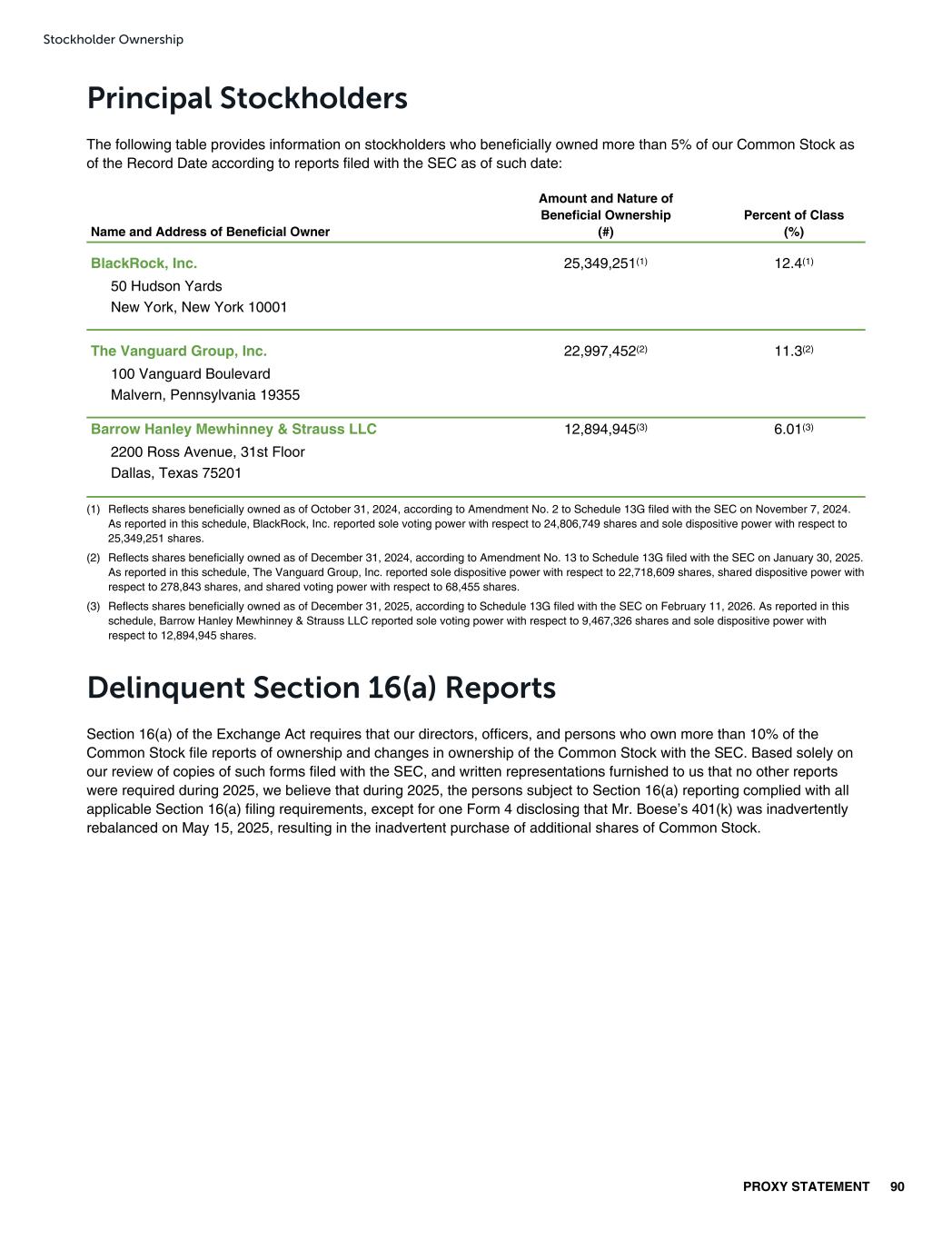 Principal Stockholders The following table provides information on stockholders who beneficially owned more than 5% of our Common Stock as of the Record Date according to reports filed with the SEC as of such date: Name and Address of Beneficial Owner Amount and Nature of Beneficial Ownership (#) Percent of Class (%) BlackRock, Inc. 25,349,251(1) 12.4(1) 50 Hudson Yards New York, New York 10001 The Vanguard Group, Inc. 22,997,452(2) 11.3(2) 100 Vanguard Boulevard Malvern, Pennsylvania 19355 Barrow Hanley Mewhinney & Strauss LLC 12,894,945(3) 6.01(3) 2200 Ross Avenue, 31st Floor Dallas, Texas 75201 (1) Reflects shares beneficially owned as of October 31, 2024, according to Amendment No. 2 to Schedule 13G filed with the SEC on November 7, 2024. As reported in this schedule, BlackRock, Inc. reported sole voting power with respect to 24,806,749 shares and sole dispositive power with respect to 25,349,251 shares. (2) Reflects shares beneficially owned as of December 31, 2024, according to Amendment No. 13 to Schedule 13G filed with the SEC on January 30, 2025. As reported in this schedule, The Vanguard Group, Inc. reported sole dispositive power with respect to 22,718,609 shares, shared dispositive power with respect to 278,843 shares, and shared voting power with respect to 68,455 shares. (3) Reflects shares beneficially owned as of December 31, 2025, according to Schedule 13G filed with the SEC on February 11, 2026. As reported in this schedule, Barrow Hanley Mewhinney & Strauss LLC reported sole voting power with respect to 9,467,326 shares and sole dispositive power with respect to 12,894,945 shares. Delinquent Section 16(a) Reports Section 16(a) of the Exchange Act requires that our directors, officers, and persons who own more than 10% of the Common Stock file reports of ownership and changes in ownership of the Common Stock with the SEC. Based solely on our review of copies of such forms filed with the SEC, and written representations furnished to us that no other reports were required during 2025, we believe that during 2025, the persons subject to Section 16(a) reporting complied with all applicable Section 16(a) filing requirements, except for one Form 4 disclosing that Mr. Boese’s 401(k) was inadvertently rebalanced on May 15, 2025, resulting in the inadvertent purchase of additional shares of Common Stock. Stockholder Ownership PROXY STATEMENT 90