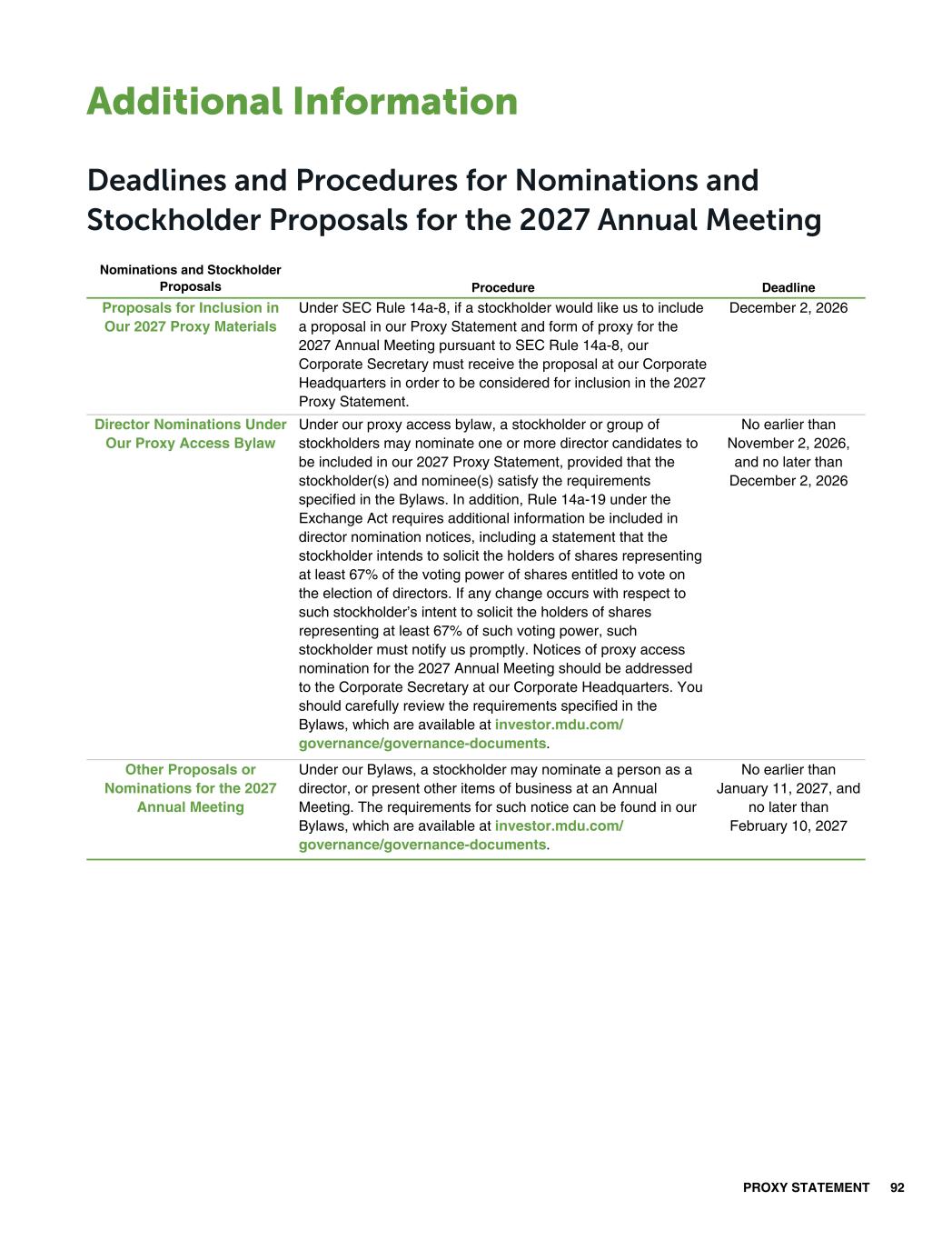 Additional Information Deadlines and Procedures for Nominations and Stockholder Proposals for the 2027 Annual Meeting Nominations and Stockholder Proposals Procedure Deadline Proposals for Inclusion in Our 2027 Proxy Materials Under SEC Rule 14a-8, if a stockholder would like us to include a proposal in our Proxy Statement and form of proxy for the 2027 Annual Meeting pursuant to SEC Rule 14a-8, our Corporate Secretary must receive the proposal at our Corporate Headquarters in order to be considered for inclusion in the 2027 Proxy Statement. December 2, 2026 Director Nominations Under Our Proxy Access Bylaw Under our proxy access bylaw, a stockholder or group of stockholders may nominate one or more director candidates to be included in our 2027 Proxy Statement, provided that the stockholder(s) and nominee(s) satisfy the requirements specified in the Bylaws. In addition, Rule 14a-19 under the Exchange Act requires additional information be included in director nomination notices, including a statement that the stockholder intends to solicit the holders of shares representing at least 67% of the voting power of shares entitled to vote on the election of directors. If any change occurs with respect to such stockholder’s intent to solicit the holders of shares representing at least 67% of such voting power, such stockholder must notify us promptly. Notices of proxy access nomination for the 2027 Annual Meeting should be addressed to the Corporate Secretary at our Corporate Headquarters. You should carefully review the requirements specified in the Bylaws, which are available at investor.mdu.com/ governance/governance-documents. No earlier than November 2, 2026, and no later than December 2, 2026 Other Proposals or Nominations for the 2027 Annual Meeting Under our Bylaws, a stockholder may nominate a person as a director, or present other items of business at an Annual Meeting. The requirements for such notice can be found in our Bylaws, which are available at investor.mdu.com/ governance/governance-documents. No earlier than January 11, 2027, and no later than February 10, 2027 PROXY STATEMENT 92