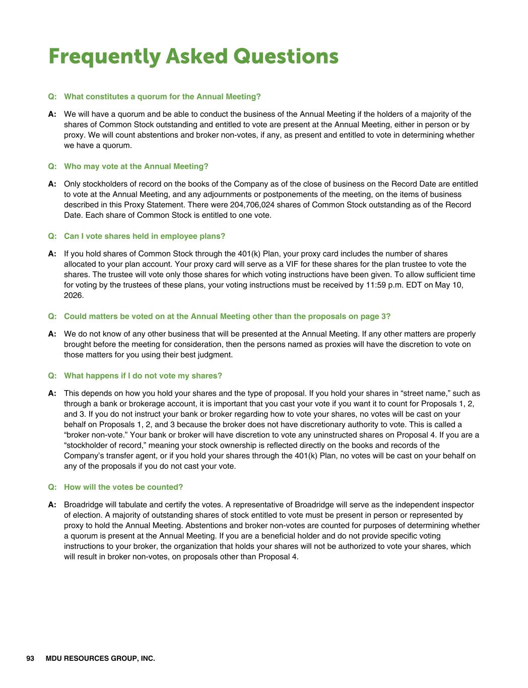 Frequently Asked Questions Q: What constitutes a quorum for the Annual Meeting? A: We will have a quorum and be able to conduct the business of the Annual Meeting if the holders of a majority of the shares of Common Stock outstanding and entitled to vote are present at the Annual Meeting, either in person or by proxy. We will count abstentions and broker non-votes, if any, as present and entitled to vote in determining whether we have a quorum. Q: Who may vote at the Annual Meeting? A: Only stockholders of record on the books of the Company as of the close of business on the Record Date are entitled to vote at the Annual Meeting, and any adjournments or postponements of the meeting, on the items of business described in this Proxy Statement. There were 204,706,024 shares of Common Stock outstanding as of the Record Date. Each share of Common Stock is entitled to one vote. Q: Can I vote shares held in employee plans? A: If you hold shares of Common Stock through the 401(k) Plan, your proxy card includes the number of shares allocated to your plan account. Your proxy card will serve as a VIF for these shares for the plan trustee to vote the shares. The trustee will vote only those shares for which voting instructions have been given. To allow sufficient time for voting by the trustees of these plans, your voting instructions must be received by 11:59 p.m. EDT on May 10, 2026. Q: Could matters be voted on at the Annual Meeting other than the proposals on page 3? A: We do not know of any other business that will be presented at the Annual Meeting. If any other matters are properly brought before the meeting for consideration, then the persons named as proxies will have the discretion to vote on those matters for you using their best judgment. Q: What happens if I do not vote my shares? A: This depends on how you hold your shares and the type of proposal. If you hold your shares in “street name,” such as through a bank or brokerage account, it is important that you cast your vote if you want it to count for Proposals 1, 2, and 3. If you do not instruct your bank or broker regarding how to vote your shares, no votes will be cast on your behalf on Proposals 1, 2, and 3 because the broker does not have discretionary authority to vote. This is called a “broker non-vote.” Your bank or broker will have discretion to vote any uninstructed shares on Proposal 4. If you are a “stockholder of record,” meaning your stock ownership is reflected directly on the books and records of the Company’s transfer agent, or if you hold your shares through the 401(k) Plan, no votes will be cast on your behalf on any of the proposals if you do not cast your vote. Q: How will the votes be counted? A: Broadridge will tabulate and certify the votes. A representative of Broadridge will serve as the independent inspector of election. A majority of outstanding shares of stock entitled to vote must be present in person or represented by proxy to hold the Annual Meeting. Abstentions and broker non-votes are counted for purposes of determining whether a quorum is present at the Annual Meeting. If you are a beneficial holder and do not provide specific voting instructions to your broker, the organization that holds your shares will not be authorized to vote your shares, which will result in broker non-votes, on proposals other than Proposal 4. 93 MDU RESOURCES GROUP, INC.