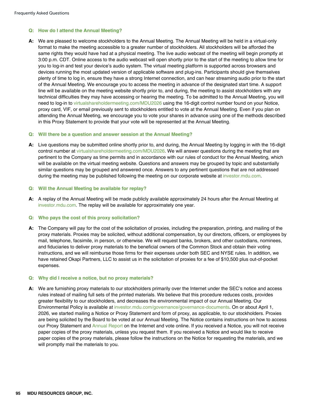 Q: How do I attend the Annual Meeting? A: We are pleased to welcome stockholders to the Annual Meeting. The Annual Meeting will be held in a virtual-only format to make the meeting accessible to a greater number of stockholders. All stockholders will be afforded the same rights they would have had at a physical meeting. The live audio webcast of the meeting will begin promptly at 3:00 p.m. CDT. Online access to the audio webcast will open shortly prior to the start of the meeting to allow time for you to log-in and test your device’s audio system. The virtual meeting platform is supported across browsers and devices running the most updated version of applicable software and plug-ins. Participants should give themselves plenty of time to log in, ensure they have a strong Internet connection, and can hear streaming audio prior to the start of the Annual Meeting. We encourage you to access the meeting in advance of the designated start time. A support line will be available on the meeting website shortly prior to, and during, the meeting to assist stockholders with any technical difficulties they may have accessing or hearing the meeting. To be admitted to the Annual Meeting, you will need to log-in to virtualshareholdermeeting.com/MDU2026 using the 16-digit control number found on your Notice, proxy card, VIF, or email previously sent to stockholders entitled to vote at the Annual Meeting. Even if you plan on attending the Annual Meeting, we encourage you to vote your shares in advance using one of the methods described in this Proxy Statement to provide that your vote will be represented at the Annual Meeting. Q: Will there be a question and answer session at the Annual Meeting? A: Live questions may be submitted online shortly prior to, and during, the Annual Meeting by logging in with the 16-digit control number at virtualshareholdermeeting.com/MDU2026. We will answer questions during the meeting that are pertinent to the Company as time permits and in accordance with our rules of conduct for the Annual Meeting, which will be available on the virtual meeting website. Questions and answers may be grouped by topic and substantially similar questions may be grouped and answered once. Answers to any pertinent questions that are not addressed during the meeting may be published following the meeting on our corporate website at investor.mdu.com. Q: Will the Annual Meeting be available for replay? A: A replay of the Annual Meeting will be made publicly available approximately 24 hours after the Annual Meeting at investor.mdu.com. The replay will be available for approximately one year. Q: Who pays the cost of this proxy solicitation? A: The Company will pay for the cost of the solicitation of proxies, including the preparation, printing, and mailing of the proxy materials. Proxies may be solicited, without additional compensation, by our directors, officers, or employees by mail, telephone, facsimile, in person, or otherwise. We will request banks, brokers, and other custodians, nominees, and fiduciaries to deliver proxy materials to the beneficial owners of the Common Stock and obtain their voting instructions, and we will reimburse those firms for their expenses under both SEC and NYSE rules. In addition, we have retained Okapi Partners, LLC to assist us in the solicitation of proxies for a fee of $10,500 plus out-of-pocket expenses. Q: Why did I receive a notice, but no proxy materials? A: We are furnishing proxy materials to our stockholders primarily over the Internet under the SEC’s notice and access rules instead of mailing full sets of the printed materials. We believe that this procedure reduces costs, provides greater flexibility to our stockholders, and decreases the environmental impact of our Annual Meeting. Our Environmental Policy is available at investor.mdu.com/governance/governance-documents. On or about April 1, 2026, we started mailing a Notice or Proxy Statement and form of proxy, as applicable, to our stockholders. Proxies are being solicited by the Board to be voted at our Annual Meeting. The Notice contains instructions on how to access our Proxy Statement and Annual Report on the Internet and vote online. If you received a Notice, you will not receive paper copies of the proxy materials, unless you request them. If you received a Notice and would like to receive paper copies of the proxy materials, please follow the instructions on the Notice for requesting the materials, and we will promptly mail the materials to you. Frequently Asked Questions 95 MDU RESOURCES GROUP, INC.
