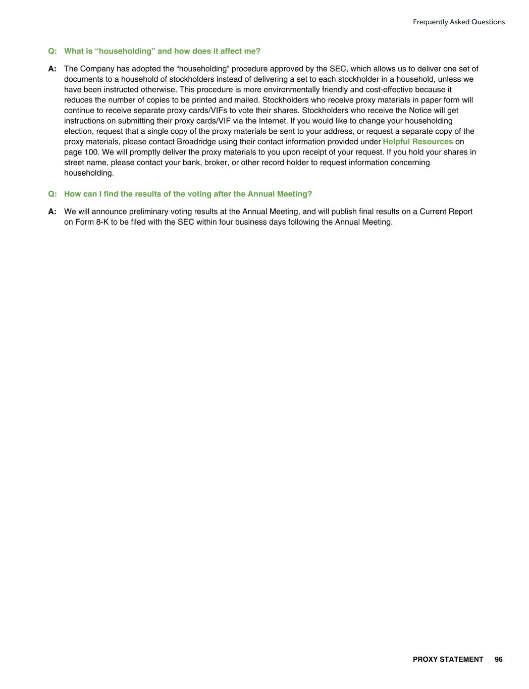 Q: What is “householding” and how does it affect me? A: The Company has adopted the “householding” procedure approved by the SEC, which allows us to deliver one set of documents to a household of stockholders instead of delivering a set to each stockholder in a household, unless we have been instructed otherwise. This procedure is more environmentally friendly and cost-effective because it reduces the number of copies to be printed and mailed. Stockholders who receive proxy materials in paper form will continue to receive separate proxy cards/VIFs to vote their shares. Stockholders who receive the Notice will get instructions on submitting their proxy cards/VIF via the Internet. If you would like to change your householding election, request that a single copy of the proxy materials be sent to your address, or request a separate copy of the proxy materials, please contact Broadridge using their contact information provided under Helpful Resources on page 100. We will promptly deliver the proxy materials to you upon receipt of your request. If you hold your shares in street name, please contact your bank, broker, or other record holder to request information concerning householding. Q: How can I find the results of the voting after the Annual Meeting? A: We will announce preliminary voting results at the Annual Meeting, and will publish final results on a Current Report on Form 8-K to be filed with the SEC within four business days following the Annual Meeting. Frequently Asked Questions PROXY STATEMENT 96