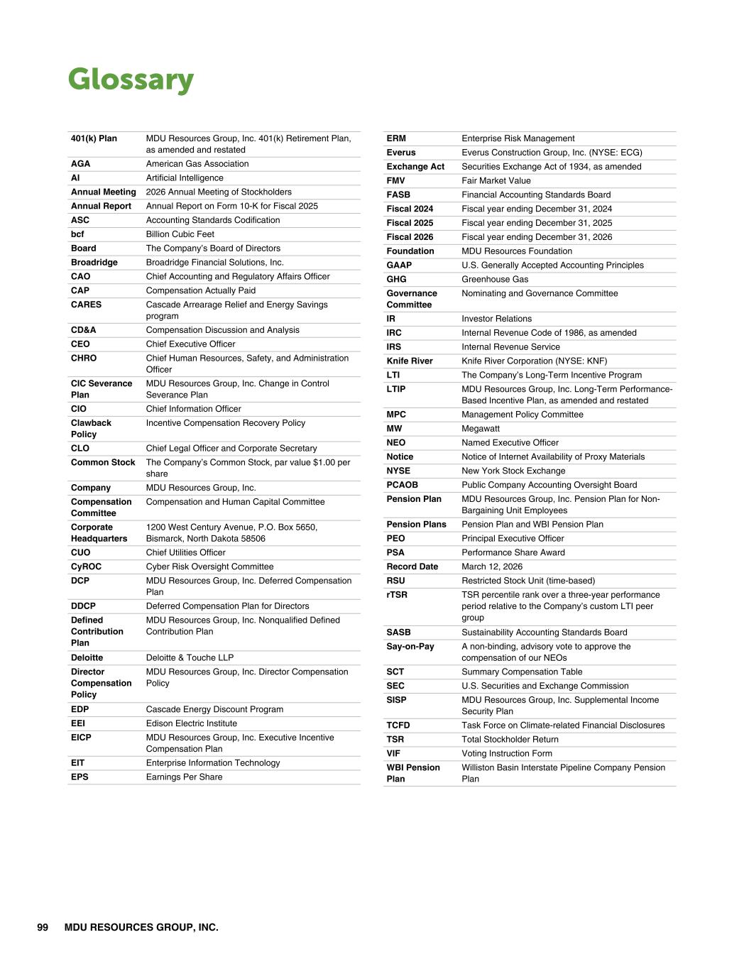 Glossary 401(k) Plan MDU Resources Group, Inc. 401(k) Retirement Plan, as amended and restated AGA American Gas Association AI Artificial Intelligence Annual Meeting 2026 Annual Meeting of Stockholders Annual Report Annual Report on Form 10-K for Fiscal 2025 ASC Accounting Standards Codification bcf Billion Cubic Feet Board The Company’s Board of Directors Broadridge Broadridge Financial Solutions, Inc. CAO Chief Accounting and Regulatory Affairs Officer CAP Compensation Actually Paid CARES Cascade Arrearage Relief and Energy Savings program CD&A Compensation Discussion and Analysis CEO Chief Executive Officer CHRO Chief Human Resources, Safety, and Administration Officer CIC Severance Plan MDU Resources Group, Inc. Change in Control Severance Plan CIO Chief Information Officer Clawback Policy Incentive Compensation Recovery Policy CLO Chief Legal Officer and Corporate Secretary Common Stock The Company’s Common Stock, par value $1.00 per share Company MDU Resources Group, Inc. Compensation Committee Compensation and Human Capital Committee Corporate Headquarters 1200 West Century Avenue, P.O. Box 5650, Bismarck, North Dakota 58506 CUO Chief Utilities Officer CyROC Cyber Risk Oversight Committee DCP MDU Resources Group, Inc. Deferred Compensation Plan DDCP Deferred Compensation Plan for Directors Defined Contribution Plan MDU Resources Group, Inc. Nonqualified Defined Contribution Plan Deloitte Deloitte & Touche LLP Director Compensation Policy MDU Resources Group, Inc. Director Compensation Policy EDP Cascade Energy Discount Program EEI Edison Electric Institute EICP MDU Resources Group, Inc. Executive Incentive Compensation Plan EIT Enterprise Information Technology EPS Earnings Per Share ERM Enterprise Risk Management Everus Everus Construction Group, Inc. (NYSE: ECG) Exchange Act Securities Exchange Act of 1934, as amended FMV Fair Market Value FASB Financial Accounting Standards Board Fiscal 2024 Fiscal year ending December 31, 2024 Fiscal 2025 Fiscal year ending December 31, 2025 Fiscal 2026 Fiscal year ending December 31, 2026 Foundation MDU Resources Foundation GAAP U.S. Generally Accepted Accounting Principles GHG Greenhouse Gas Governance Committee Nominating and Governance Committee IR Investor Relations IRC Internal Revenue Code of 1986, as amended IRS Internal Revenue Service Knife River Knife River Corporation (NYSE: KNF) LTI The Company’s Long-Term Incentive Program LTIP MDU Resources Group, Inc. Long-Term Performance- Based Incentive Plan, as amended and restated MPC Management Policy Committee MW Megawatt NEO Named Executive Officer Notice Notice of Internet Availability of Proxy Materials NYSE New York Stock Exchange PCAOB Public Company Accounting Oversight Board Pension Plan MDU Resources Group, Inc. Pension Plan for Non- Bargaining Unit Employees Pension Plans Pension Plan and WBI Pension Plan PEO Principal Executive Officer PSA Performance Share Award Record Date March 12, 2026 RSU Restricted Stock Unit (time-based) rTSR TSR percentile rank over a three-year performance period relative to the Company’s custom LTI peer group SASB Sustainability Accounting Standards Board Say-on-Pay A non-binding, advisory vote to approve the compensation of our NEOs SCT Summary Compensation Table SEC U.S. Securities and Exchange Commission SISP MDU Resources Group, Inc. Supplemental Income Security Plan TCFD Task Force on Climate-related Financial Disclosures TSR Total Stockholder Return VIF Voting Instruction Form WBI Pension Plan Williston Basin Interstate Pipeline Company Pension Plan 99 MDU RESOURCES GROUP, INC.