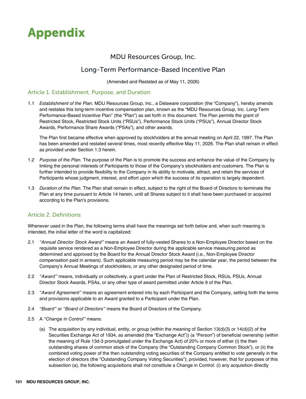 Appendix MDU Resources Group, Inc. Long-Term Performance-Based Incentive Plan (Amended and Restated as of May 11, 2026) Article 1. Establishment, Purpose, and Duration 1.1 Establishment of the Plan. MDU Resources Group, Inc., a Delaware corporation (the “Company”), hereby amends and restates this long-term incentive compensation plan, known as the “MDU Resources Group, Inc. Long-Term Performance-Based Incentive Plan” (the “Plan”) as set forth in this document. The Plan permits the grant of Restricted Stock, Restricted Stock Units (“RSUs”), Performance Stock Units (“PSUs”), Annual Director Stock Awards, Performance Share Awards (“PSAs”), and other awards. The Plan first became effective when approved by stockholders at the annual meeting on April 22, 1997. The Plan has been amended and restated several times, most recently effective May 11, 2026. The Plan shall remain in effect as provided under Section 1.3 herein. 1.2 Purpose of the Plan. The purpose of the Plan is to promote the success and enhance the value of the Company by linking the personal interests of Participants to those of the Company’s stockholders and customers. The Plan is further intended to provide flexibility to the Company in its ability to motivate, attract, and retain the services of Participants whose judgment, interest, and effort upon which the success of its operation is largely dependent. 1.3 Duration of the Plan. The Plan shall remain in effect, subject to the right of the Board of Directors to terminate the Plan at any time pursuant to Article 14 herein, until all Shares subject to it shall have been purchased or acquired according to the Plan's provisions. Article 2. Definitions Whenever used in the Plan, the following terms shall have the meanings set forth below and, when such meaning is intended, the initial letter of the word is capitalized: 2.1 “Annual Director Stock Award” means an Award of fully-vested Shares to a Non-Employee Director based on the requisite service rendered as a Non-Employee Director during the applicable service measuring period as determined and approved by the Board for the Annual Director Stock Award (i.e., Non-Employee Director compensation paid in arrears). Such applicable measuring period may be the calendar year, the period between the Company's Annual Meetings of stockholders, or any other designated period of time. 2.2 “Award” means, individually or collectively, a grant under the Plan of Restricted Stock, RSUs, PSUs, Annual Director Stock Awards, PSAs, or any other type of award permitted under Article 9 of the Plan. 2.3 “Award Agreement” means an agreement entered into by each Participant and the Company, setting forth the terms and provisions applicable to an Award granted to a Participant under the Plan. 2.4 “Board” or “Board of Directors” means the Board of Directors of the Company. 2.5 A “Change in Control” means: (a) The acquisition by any individual, entity, or group (within the meaning of Section 13(d)(3) or 14(d)(2) of the Securities Exchange Act of 1934, as amended (the “Exchange Act”)) (a “Person”) of beneficial ownership (within the meaning of Rule 13d-3 promulgated under the Exchange Act) of 20% or more of either (i) the then outstanding shares of common stock of the Company (the “Outstanding Company Common Stock”), or (ii) the combined voting power of the then outstanding voting securities of the Company entitled to vote generally in the election of directors (the “Outstanding Company Voting Securities”); provided, however, that for purposes of this subsection (a), the following acquisitions shall not constitute a Change in Control: (i) any acquisition directly 101 MDU RESOURCES GROUP, INC.