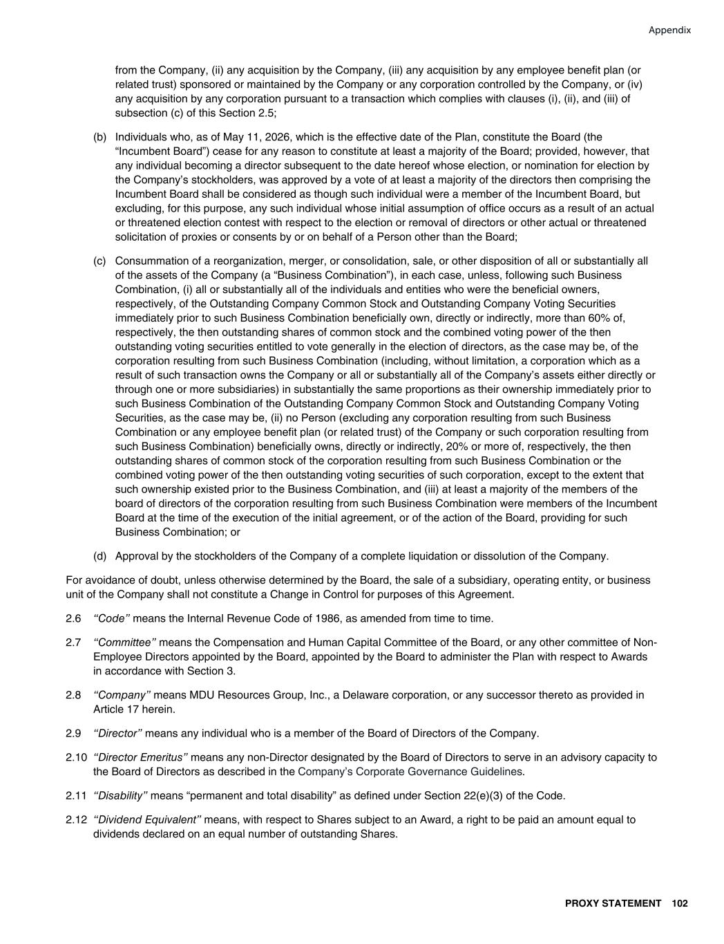 from the Company, (ii) any acquisition by the Company, (iii) any acquisition by any employee benefit plan (or related trust) sponsored or maintained by the Company or any corporation controlled by the Company, or (iv) any acquisition by any corporation pursuant to a transaction which complies with clauses (i), (ii), and (iii) of subsection (c) of this Section 2.5; (b) Individuals who, as of May 11, 2026, which is the effective date of the Plan, constitute the Board (the “Incumbent Board”) cease for any reason to constitute at least a majority of the Board; provided, however, that any individual becoming a director subsequent to the date hereof whose election, or nomination for election by the Company’s stockholders, was approved by a vote of at least a majority of the directors then comprising the Incumbent Board shall be considered as though such individual were a member of the Incumbent Board, but excluding, for this purpose, any such individual whose initial assumption of office occurs as a result of an actual or threatened election contest with respect to the election or removal of directors or other actual or threatened solicitation of proxies or consents by or on behalf of a Person other than the Board; (c) Consummation of a reorganization, merger, or consolidation, sale, or other disposition of all or substantially all of the assets of the Company (a “Business Combination”), in each case, unless, following such Business Combination, (i) all or substantially all of the individuals and entities who were the beneficial owners, respectively, of the Outstanding Company Common Stock and Outstanding Company Voting Securities immediately prior to such Business Combination beneficially own, directly or indirectly, more than 60% of, respectively, the then outstanding shares of common stock and the combined voting power of the then outstanding voting securities entitled to vote generally in the election of directors, as the case may be, of the corporation resulting from such Business Combination (including, without limitation, a corporation which as a result of such transaction owns the Company or all or substantially all of the Company’s assets either directly or through one or more subsidiaries) in substantially the same proportions as their ownership immediately prior to such Business Combination of the Outstanding Company Common Stock and Outstanding Company Voting Securities, as the case may be, (ii) no Person (excluding any corporation resulting from such Business Combination or any employee benefit plan (or related trust) of the Company or such corporation resulting from such Business Combination) beneficially owns, directly or indirectly, 20% or more of, respectively, the then outstanding shares of common stock of the corporation resulting from such Business Combination or the combined voting power of the then outstanding voting securities of such corporation, except to the extent that such ownership existed prior to the Business Combination, and (iii) at least a majority of the members of the board of directors of the corporation resulting from such Business Combination were members of the Incumbent Board at the time of the execution of the initial agreement, or of the action of the Board, providing for such Business Combination; or (d) Approval by the stockholders of the Company of a complete liquidation or dissolution of the Company. For avoidance of doubt, unless otherwise determined by the Board, the sale of a subsidiary, operating entity, or business unit of the Company shall not constitute a Change in Control for purposes of this Agreement. 2.6 “Code” means the Internal Revenue Code of 1986, as amended from time to time. 2.7 “Committee” means the Compensation and Human Capital Committee of the Board, or any other committee of Non- Employee Directors appointed by the Board, appointed by the Board to administer the Plan with respect to Awards in accordance with Section 3. 2.8 “Company” means MDU Resources Group, Inc., a Delaware corporation, or any successor thereto as provided in Article 17 herein. 2.9 “Director” means any individual who is a member of the Board of Directors of the Company. 2.10 “Director Emeritus” means any non-Director designated by the Board of Directors to serve in an advisory capacity to the Board of Directors as described in the Company’s Corporate Governance Guidelines. 2.11 “Disability” means “permanent and total disability” as defined under Section 22(e)(3) of the Code. 2.12 “Dividend Equivalent” means, with respect to Shares subject to an Award, a right to be paid an amount equal to dividends declared on an equal number of outstanding Shares. Appendix PROXY STATEMENT 102