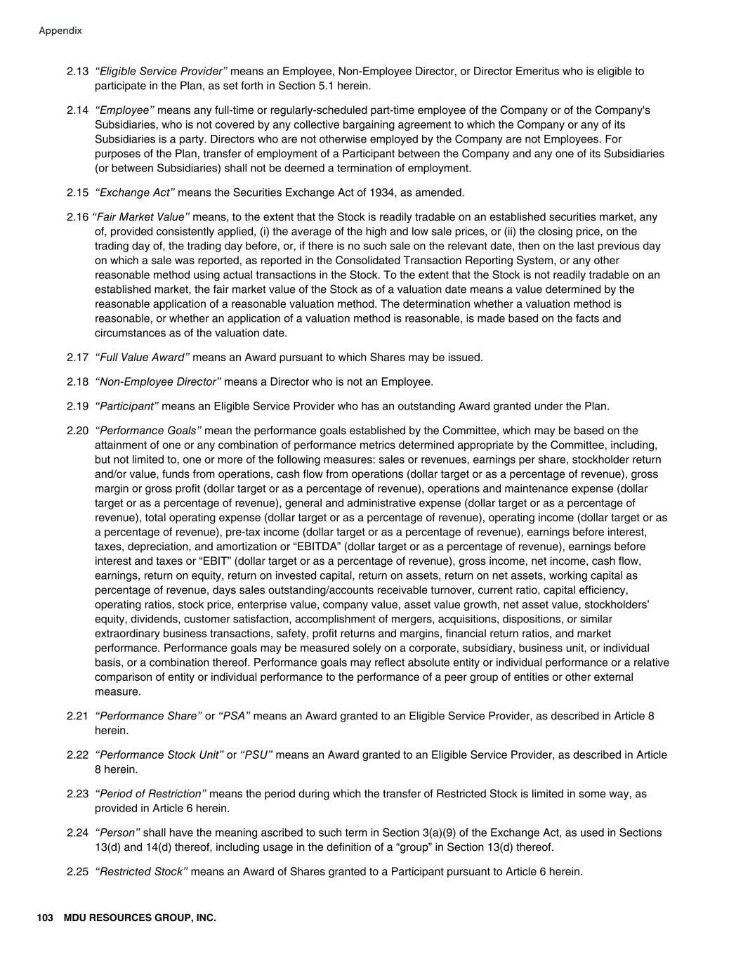 2.13 “Eligible Service Provider” means an Employee, Non-Employee Director, or Director Emeritus who is eligible to participate in the Plan, as set forth in Section 5.1 herein. 2.14 “Employee” means any full-time or regularly-scheduled part-time employee of the Company or of the Company's Subsidiaries, who is not covered by any collective bargaining agreement to which the Company or any of its Subsidiaries is a party. Directors who are not otherwise employed by the Company are not Employees. For purposes of the Plan, transfer of employment of a Participant between the Company and any one of its Subsidiaries (or between Subsidiaries) shall not be deemed a termination of employment. 2.15 “Exchange Act” means the Securities Exchange Act of 1934, as amended. 2.16 “Fair Market Value” means, to the extent that the Stock is readily tradable on an established securities market, any of, provided consistently applied, (i) the average of the high and low sale prices, or (ii) the closing price, on the trading day of, the trading day before, or, if there is no such sale on the relevant date, then on the last previous day on which a sale was reported, as reported in the Consolidated Transaction Reporting System, or any other reasonable method using actual transactions in the Stock. To the extent that the Stock is not readily tradable on an established market, the fair market value of the Stock as of a valuation date means a value determined by the reasonable application of a reasonable valuation method. The determination whether a valuation method is reasonable, or whether an application of a valuation method is reasonable, is made based on the facts and circumstances as of the valuation date. 2.17 “Full Value Award” means an Award pursuant to which Shares may be issued. 2.18 “Non-Employee Director” means a Director who is not an Employee. 2.19 “Participant” means an Eligible Service Provider who has an outstanding Award granted under the Plan. 2.20 “Performance Goals” mean the performance goals established by the Committee, which may be based on the attainment of one or any combination of performance metrics determined appropriate by the Committee, including, but not limited to, one or more of the following measures: sales or revenues, earnings per share, stockholder return and/or value, funds from operations, cash flow from operations (dollar target or as a percentage of revenue), gross margin or gross profit (dollar target or as a percentage of revenue), operations and maintenance expense (dollar target or as a percentage of revenue), general and administrative expense (dollar target or as a percentage of revenue), total operating expense (dollar target or as a percentage of revenue), operating income (dollar target or as a percentage of revenue), pre-tax income (dollar target or as a percentage of revenue), earnings before interest, taxes, depreciation, and amortization or “EBITDA” (dollar target or as a percentage of revenue), earnings before interest and taxes or “EBIT” (dollar target or as a percentage of revenue), gross income, net income, cash flow, earnings, return on equity, return on invested capital, return on assets, return on net assets, working capital as percentage of revenue, days sales outstanding/accounts receivable turnover, current ratio, capital efficiency, operating ratios, stock price, enterprise value, company value, asset value growth, net asset value, stockholders’ equity, dividends, customer satisfaction, accomplishment of mergers, acquisitions, dispositions, or similar extraordinary business transactions, safety, profit returns and margins, financial return ratios, and market performance. Performance goals may be measured solely on a corporate, subsidiary, business unit, or individual basis, or a combination thereof. Performance goals may reflect absolute entity or individual performance or a relative comparison of entity or individual performance to the performance of a peer group of entities or other external measure. 2.21 “Performance Share” or “PSA” means an Award granted to an Eligible Service Provider, as described in Article 8 herein. 2.22 “Performance Stock Unit” or “PSU” means an Award granted to an Eligible Service Provider, as described in Article 8 herein. 2.23 “Period of Restriction” means the period during which the transfer of Restricted Stock is limited in some way, as provided in Article 6 herein. 2.24 “Person” shall have the meaning ascribed to such term in Section 3(a)(9) of the Exchange Act, as used in Sections 13(d) and 14(d) thereof, including usage in the definition of a “group” in Section 13(d) thereof. 2.25 “Restricted Stock” means an Award of Shares granted to a Participant pursuant to Article 6 herein. Appendix 103 MDU RESOURCES GROUP, INC.
