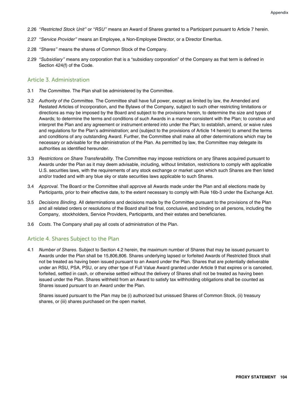 2.26 “Restricted Stock Unit” or “RSU” means an Award of Shares granted to a Participant pursuant to Article 7 herein. 2.27 “Service Provider” means an Employee, a Non-Employee Director, or a Director Emeritus. 2.28 “Shares” means the shares of Common Stock of the Company. 2.29 “Subsidiary” means any corporation that is a “subsidiary corporation” of the Company as that term is defined in Section 424(f) of the Code. Article 3. Administration 3.1 The Committee. The Plan shall be administered by the Committee. 3.2 Authority of the Committee. The Committee shall have full power, except as limited by law, the Amended and Restated Articles of Incorporation, and the Bylaws of the Company, subject to such other restricting limitations or directions as may be imposed by the Board and subject to the provisions herein, to determine the size and types of Awards; to determine the terms and conditions of such Awards in a manner consistent with the Plan; to construe and interpret the Plan and any agreement or instrument entered into under the Plan; to establish, amend, or waive rules and regulations for the Plan’s administration; and (subject to the provisions of Article 14 herein) to amend the terms and conditions of any outstanding Award. Further, the Committee shall make all other determinations which may be necessary or advisable for the administration of the Plan. As permitted by law, the Committee may delegate its authorities as identified hereunder. 3.3 Restrictions on Share Transferability. The Committee may impose restrictions on any Shares acquired pursuant to Awards under the Plan as it may deem advisable, including, without limitation, restrictions to comply with applicable U.S. securities laws, with the requirements of any stock exchange or market upon which such Shares are then listed and/or traded and with any blue sky or state securities laws applicable to such Shares. 3.4 Approval. The Board or the Committee shall approve all Awards made under the Plan and all elections made by Participants, prior to their effective date, to the extent necessary to comply with Rule 16b-3 under the Exchange Act. 3.5 Decisions Binding. All determinations and decisions made by the Committee pursuant to the provisions of the Plan and all related orders or resolutions of the Board shall be final, conclusive, and binding on all persons, including the Company, stockholders, Service Providers, Participants, and their estates and beneficiaries. 3.6 Costs. The Company shall pay all costs of administration of the Plan. Article 4. Shares Subject to the Plan 4.1 Number of Shares. Subject to Section 4.2 herein, the maximum number of Shares that may be issued pursuant to Awards under the Plan shall be 15,806,806. Shares underlying lapsed or forfeited Awards of Restricted Stock shall not be treated as having been issued pursuant to an Award under the Plan. Shares that are potentially deliverable under an RSU, PSA, PSU, or any other type of Full Value Award granted under Article 9 that expires or is canceled, forfeited, settled in cash, or otherwise settled without the delivery of Shares shall not be treated as having been issued under the Plan. Shares withheld from an Award to satisfy tax withholding obligations shall be counted as Shares issued pursuant to an Award under the Plan. Shares issued pursuant to the Plan may be (i) authorized but unissued Shares of Common Stock, (ii) treasury shares, or (iii) shares purchased on the open market. Appendix PROXY STATEMENT 104