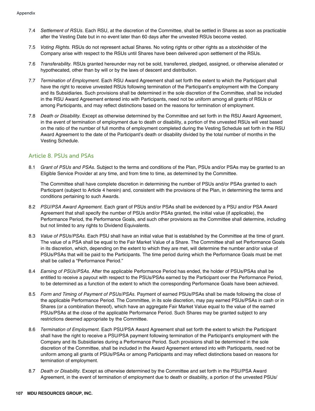 7.4 Settlement of RSUs. Each RSU, at the discretion of the Committee, shall be settled in Shares as soon as practicable after the Vesting Date but in no event later than 60 days after the unvested RSUs become vested. 7.5 Voting Rights. RSUs do not represent actual Shares. No voting rights or other rights as a stockholder of the Company arise with respect to the RSUs until Shares have been delivered upon settlement of the RSUs. 7.6 Transferability. RSUs granted hereunder may not be sold, transferred, pledged, assigned, or otherwise alienated or hypothecated, other than by will or by the laws of descent and distribution. 7.7 Termination of Employment. Each RSU Award Agreement shall set forth the extent to which the Participant shall have the right to receive unvested RSUs following termination of the Participant’s employment with the Company and its Subsidiaries. Such provisions shall be determined in the sole discretion of the Committee, shall be included in the RSU Award Agreement entered into with Participants, need not be uniform among all grants of RSUs or among Participants, and may reflect distinctions based on the reasons for termination of employment. 7.8 Death or Disability. Except as otherwise determined by the Committee and set forth in the RSU Award Agreement, in the event of termination of employment due to death or disability, a portion of the unvested RSUs will vest based on the ratio of the number of full months of employment completed during the Vesting Schedule set forth in the RSU Award Agreement to the date of the Participant’s death or disability divided by the total number of months in the Vesting Schedule. Article 8. PSUs and PSAs 8.1 Grant of PSUs and PSAs. Subject to the terms and conditions of the Plan, PSUs and/or PSAs may be granted to an Eligible Service Provider at any time, and from time to time, as determined by the Committee. The Committee shall have complete discretion in determining the number of PSUs and/or PSAs granted to each Participant (subject to Article 4 herein) and, consistent with the provisions of the Plan, in determining the terms and conditions pertaining to such Awards. 8.2 PSU/PSA Award Agreement. Each grant of PSUs and/or PSAs shall be evidenced by a PSU and/or PSA Award Agreement that shall specify the number of PSUs and/or PSAs granted, the initial value (if applicable), the Performance Period, the Performance Goals, and such other provisions as the Committee shall determine, including but not limited to any rights to Dividend Equivalents. 8.3 Value of PSUs/PSAs. Each PSU shall have an initial value that is established by the Committee at the time of grant. The value of a PSA shall be equal to the Fair Market Value of a Share. The Committee shall set Performance Goals in its discretion, which, depending on the extent to which they are met, will determine the number and/or value of PSUs/PSAs that will be paid to the Participants. The time period during which the Performance Goals must be met shall be called a “Performance Period.” 8.4 Earning of PSUs/PSAs. After the applicable Performance Period has ended, the holder of PSUs/PSAs shall be entitled to receive a payout with respect to the PSUs/PSAs earned by the Participant over the Performance Period, to be determined as a function of the extent to which the corresponding Performance Goals have been achieved. 8.5 Form and Timing of Payment of PSUs/PSAs. Payment of earned PSUs/PSAs shall be made following the close of the applicable Performance Period. The Committee, in its sole discretion, may pay earned PSUs/PSAs in cash or in Shares (or a combination thereof), which have an aggregate Fair Market Value equal to the value of the earned PSUs/PSAs at the close of the applicable Performance Period. Such Shares may be granted subject to any restrictions deemed appropriate by the Committee. 8.6 Termination of Employment. Each PSU/PSA Award Agreement shall set forth the extent to which the Participant shall have the right to receive a PSU/PSA payment following termination of the Participant's employment with the Company and its Subsidiaries during a Performance Period. Such provisions shall be determined in the sole discretion of the Committee, shall be included in the Award Agreement entered into with Participants, need not be uniform among all grants of PSUs/PSAs or among Participants and may reflect distinctions based on reasons for termination of employment. 8.7 Death or Disability. Except as otherwise determined by the Committee and set forth in the PSU/PSA Award Agreement, in the event of termination of employment due to death or disability, a portion of the unvested PSUs/ Appendix 107 MDU RESOURCES GROUP, INC.