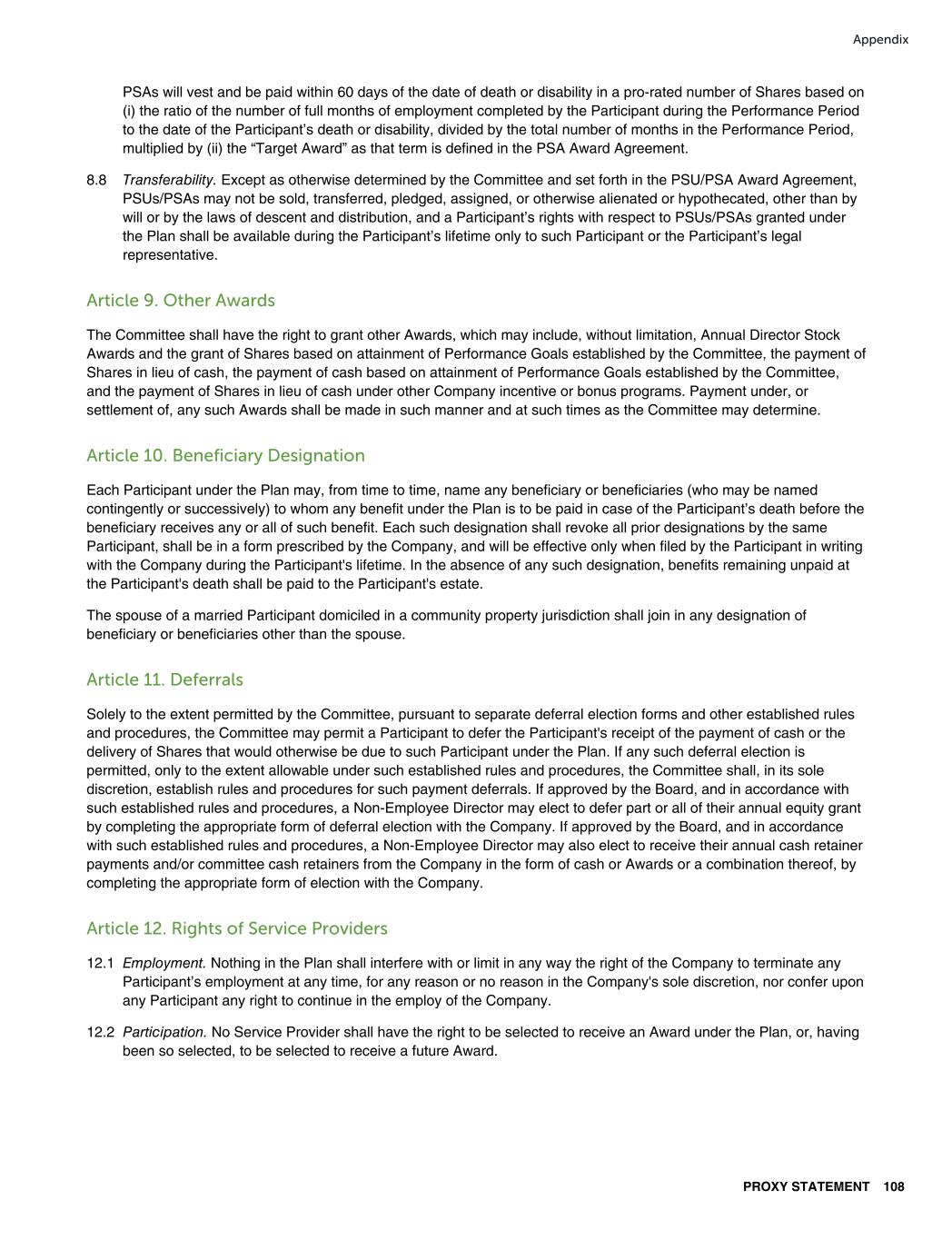 PSAs will vest and be paid within 60 days of the date of death or disability in a pro-rated number of Shares based on (i) the ratio of the number of full months of employment completed by the Participant during the Performance Period to the date of the Participant’s death or disability, divided by the total number of months in the Performance Period, multiplied by (ii) the “Target Award” as that term is defined in the PSA Award Agreement. 8.8 Transferability. Except as otherwise determined by the Committee and set forth in the PSU/PSA Award Agreement, PSUs/PSAs may not be sold, transferred, pledged, assigned, or otherwise alienated or hypothecated, other than by will or by the laws of descent and distribution, and a Participant’s rights with respect to PSUs/PSAs granted under the Plan shall be available during the Participant’s lifetime only to such Participant or the Participant’s legal representative. Article 9. Other Awards The Committee shall have the right to grant other Awards, which may include, without limitation, Annual Director Stock Awards and the grant of Shares based on attainment of Performance Goals established by the Committee, the payment of Shares in lieu of cash, the payment of cash based on attainment of Performance Goals established by the Committee, and the payment of Shares in lieu of cash under other Company incentive or bonus programs. Payment under, or settlement of, any such Awards shall be made in such manner and at such times as the Committee may determine. Article 10. Beneficiary Designation Each Participant under the Plan may, from time to time, name any beneficiary or beneficiaries (who may be named contingently or successively) to whom any benefit under the Plan is to be paid in case of the Participant’s death before the beneficiary receives any or all of such benefit. Each such designation shall revoke all prior designations by the same Participant, shall be in a form prescribed by the Company, and will be effective only when filed by the Participant in writing with the Company during the Participant's lifetime. In the absence of any such designation, benefits remaining unpaid at the Participant's death shall be paid to the Participant's estate. The spouse of a married Participant domiciled in a community property jurisdiction shall join in any designation of beneficiary or beneficiaries other than the spouse. Article 11. Deferrals Solely to the extent permitted by the Committee, pursuant to separate deferral election forms and other established rules and procedures, the Committee may permit a Participant to defer the Participant's receipt of the payment of cash or the delivery of Shares that would otherwise be due to such Participant under the Plan. If any such deferral election is permitted, only to the extent allowable under such established rules and procedures, the Committee shall, in its sole discretion, establish rules and procedures for such payment deferrals. If approved by the Board, and in accordance with such established rules and procedures, a Non-Employee Director may elect to defer part or all of their annual equity grant by completing the appropriate form of deferral election with the Company. If approved by the Board, and in accordance with such established rules and procedures, a Non-Employee Director may also elect to receive their annual cash retainer payments and/or committee cash retainers from the Company in the form of cash or Awards or a combination thereof, by completing the appropriate form of election with the Company. Article 12. Rights of Service Providers 12.1 Employment. Nothing in the Plan shall interfere with or limit in any way the right of the Company to terminate any Participant’s employment at any time, for any reason or no reason in the Company's sole discretion, nor confer upon any Participant any right to continue in the employ of the Company. 12.2 Participation. No Service Provider shall have the right to be selected to receive an Award under the Plan, or, having been so selected, to be selected to receive a future Award. Appendix PROXY STATEMENT 108