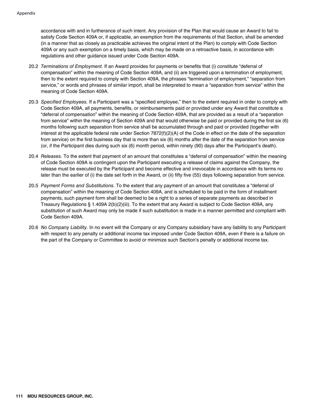 accordance with and in furtherance of such intent. Any provision of the Plan that would cause an Award to fail to satisfy Code Section 409A or, if applicable, an exemption from the requirements of that Section, shall be amended (in a manner that as closely as practicable achieves the original intent of the Plan) to comply with Code Section 409A or any such exemption on a timely basis, which may be made on a retroactive basis, in accordance with regulations and other guidance issued under Code Section 409A. 20.2 Terminations of Employment. If an Award provides for payments or benefits that (i) constitute “deferral of compensation” within the meaning of Code Section 409A, and (ii) are triggered upon a termination of employment, then to the extent required to comply with Section 409A, the phrases “termination of employment,” “separation from service,” or words and phrases of similar import, shall be interpreted to mean a “separation from service” within the meaning of Code Section 409A. 20.3 Specified Employees. If a Participant was a “specified employee,” then to the extent required in order to comply with Code Section 409A, all payments, benefits, or reimbursements paid or provided under any Award that constitute a “deferral of compensation” within the meaning of Code Section 409A, that are provided as a result of a “separation from service” within the meaning of Section 409A and that would otherwise be paid or provided during the first six (6) months following such separation from service shall be accumulated through and paid or provided (together with interest at the applicable federal rate under Section 7872(f)(2)(A) of the Code in effect on the date of the separation from service) on the first business day that is more than six (6) months after the date of the separation from service (or, if the Participant dies during such six (6) month period, within ninety (90) days after the Participant’s death). 20.4 Releases. To the extent that payment of an amount that constitutes a “deferral of compensation” within the meaning of Code Section 409A is contingent upon the Participant executing a release of claims against the Company, the release must be executed by the Participant and become effective and irrevocable in accordance with its terms no later than the earlier of (i) the date set forth in the Award, or (ii) fifty five (55) days following separation from service. 20.5 Payment Forms and Substitutions. To the extent that any payment of an amount that constitutes a “deferral of compensation” within the meaning of Code Section 409A, and is scheduled to be paid in the form of installment payments, such payment form shall be deemed to be a right to a series of separate payments as described in Treasury Regulations § 1.409A 2(b)(2)(iii). To the extent that any Award is subject to Code Section 409A, any substitution of such Award may only be made if such substitution is made in a manner permitted and compliant with Code Section 409A. 20.6 No Company Liability. In no event will the Company or any Company subsidiary have any liability to any Participant with respect to any penalty or additional income tax imposed under Code Section 409A, even if there is a failure on the part of the Company or Committee to avoid or minimize such Section’s penalty or additional income tax. Appendix 111 MDU RESOURCES GROUP, INC.