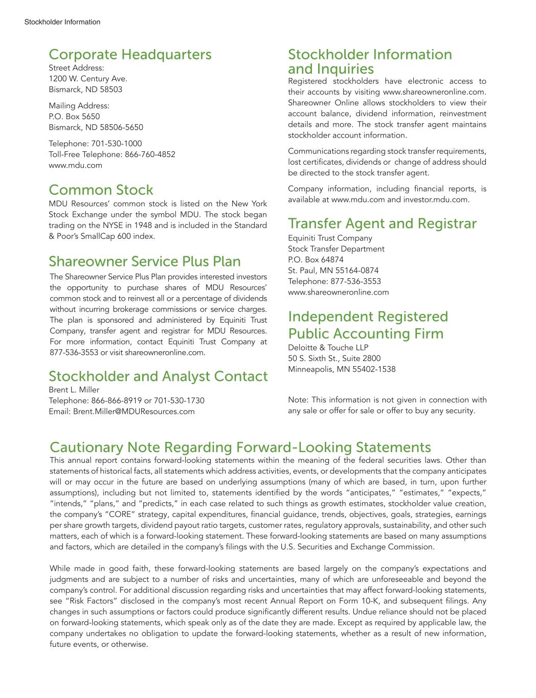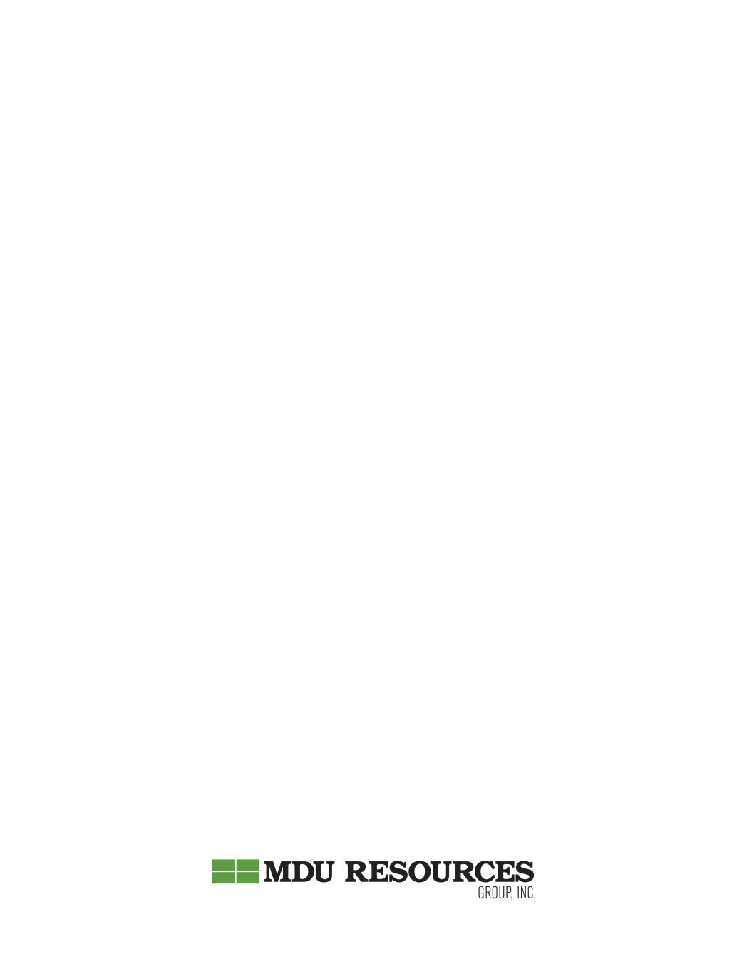 Cautionary Note Regarding Forward-Looking Statements This annual report contains forward-looking statements within the meaning of the federal securities laws. Other than statements of historical facts, all statements which address activities, events, or developments that the company anticipates will or may occur in the future are based on underlying assumptions (many of which are based, in turn, upon further assumptions), including but not limited to, statements identified by the words “anticipates,” “estimates,” “expects,” “intends,” “plans,” and “predicts,” in each case related to such things as growth estimates, stockholder value creation, the company’s “CORE” strategy, capital expenditures, financial guidance, trends, objectives, goals, strategies, earnings per share growth targets, dividend payout ratio targets, customer rates, regulatory approvals, sustainability, and other such matters, each of which is a forward-looking statement. These forward-looking statements are based on many assumptions and factors, which are detailed in the company’s filings with the U.S. Securities and Exchange Commission. While made in good faith, these forward-looking statements are based largely on the company’s expectations and judgments and are subject to a number of risks and uncertainties, many of which are unforeseeable and beyond the company’s control. For additional discussion regarding risks and uncertainties that may affect forward-looking statements, see “Risk Factors” disclosed in the company’s most recent Annual Report on Form 10-K, and subsequent filings. Any changes in such assumptions or factors could produce significantly different results. Undue reliance should not be placed on forward-looking statements, which speak only as of the date they are made. Except as required by applicable law, the company undertakes no obligation to update the forward-looking statements, whether as a result of new information, future events, or otherwise. Stockholder Information Common Stock Corporate Headquarters MDU Resources’ common stock is listed on the New York Stock Exchange under the symbol MDU. The stock began trading on the NYSE in 1948 and is included in the Standard & Poor’s SmallCap 600 index. Street Address: 1200 W. Century Ave. Bismarck, ND 58503 Mailing Address: P.O. Box 5650 Bismarck, ND 58506-5650 Telephone: 701-530-1000 Toll-Free Telephone: 866-760-4852 www.mdu.com Shareowner Service Plus Plan The Shareowner Service Plus Plan provides interested investors the opportunity to purchase shares of MDU Resources’ common stock and to reinvest all or a percentage of dividends without incurring brokerage commissions or service charges. The plan is sponsored and administered by Equiniti Trust Company, transfer agent and registrar for MDU Resources. For more information, contact Equiniti Trust Company at 877-536-3553 or visit shareowneronline.com. Stockholder Information and Inquiries Registered stockholders have electronic access to their accounts by visiting www.shareowneronline.com. Shareowner Online allows stockholders to view their account balance, dividend information, reinvestment details and more. The stock transfer agent maintains stockholder account information. Communications regarding stock transfer requirements, lost certificates, dividends or change of address should be directed to the stock transfer agent. Company information, including financial reports, is available at www.mdu.com and investor.mdu.com. Stockholder and Analyst Contact Brent L. Miller Telephone: 866-866-8919 or 701-530-1730 Email: Brent.Miller@MDUResources.com Transfer Agent and Registrar Equiniti Trust Company Stock Transfer Department P.O. Box 64874 St. Paul, MN 55164-0874 Telephone: 877-536-3553 www.shareowneronline.com Independent Registered Public Accounting Firm Deloitte & Touche LLP 50 S. Sixth St., Suite 2800 Minneapolis, MN 55402-1538 Note: This information is not given in connection with any sale or offer for sale or offer to buy any security.