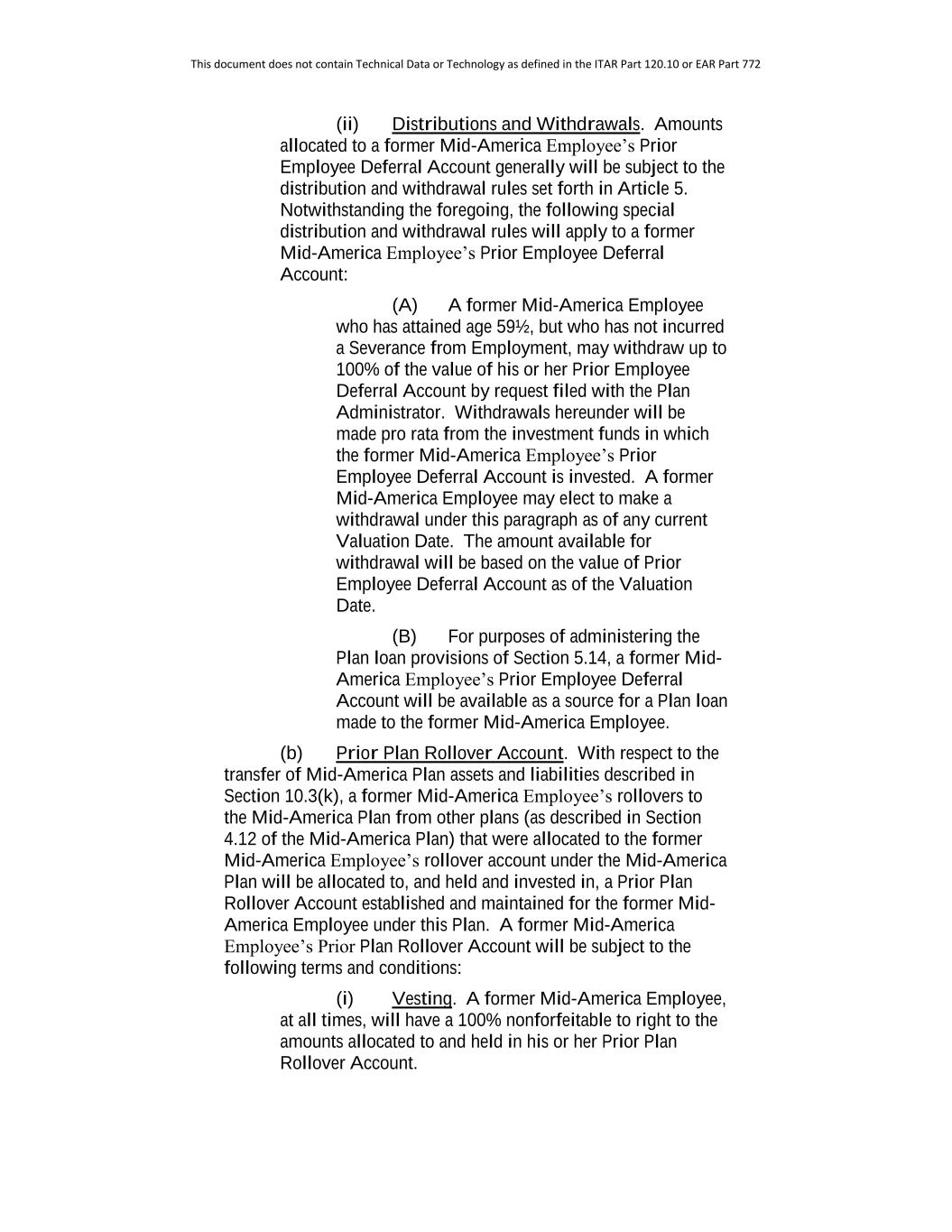 This document does not contain Technical Data or Technology as defined in the ITAR Part 120.10 or EAR Part 772 (ii) Distributions and Withdrawals. Amounts allocated to a former Mid-America Employee’s Prior Employee Deferral Account generally will be subject to the distribution and withdrawal rules set forth in Article 5. Notwithstanding the foregoing, the following special distribution and withdrawal rules will apply to a former Mid-America Employee’s Prior Employee Deferral Account: (A) A former Mid-America Employee who has attained age 59½, but who has not incurred a Severance from Employment, may withdraw up to 100% of the value of his or her Prior Employee Deferral Account by request filed with the Plan Administrator. Withdrawals hereunder will be made pro rata from the investment funds in which the former Mid-America Employee’s Prior Employee Deferral Account is invested. A former Mid-America Employee may elect to make a withdrawal under this paragraph as of any current Valuation Date. The amount available for withdrawal will be based on the value of Prior Employee Deferral Account as of the Valuation Date. (B) For purposes of administering the Plan loan provisions of Section 5.14, a former Mid- America Employee’s Prior Employee Deferral Account will be available as a source for a Plan loan made to the former Mid-America Employee. (b) Prior Plan Rollover Account. With respect to the transfer of Mid-America Plan assets and liabilities described in Section 10.3(k), a former Mid-America Employee’s rollovers to the Mid-America Plan from other plans (as described in Section 4.12 of the Mid-America Plan) that were allocated to the former Mid-America Employee’s rollover account under the Mid-America Plan will be allocated to, and held and invested in, a Prior Plan Rollover Account established and maintained for the former Mid- America Employee under this Plan. A former Mid-America Employee’s Prior Plan Rollover Account will be subject to the following terms and conditions: (i) Vesting. A former Mid-America Employee, at all times, will have a 100% nonforfeitable to right to the amounts allocated to and held in his or her Prior Plan Rollover Account.