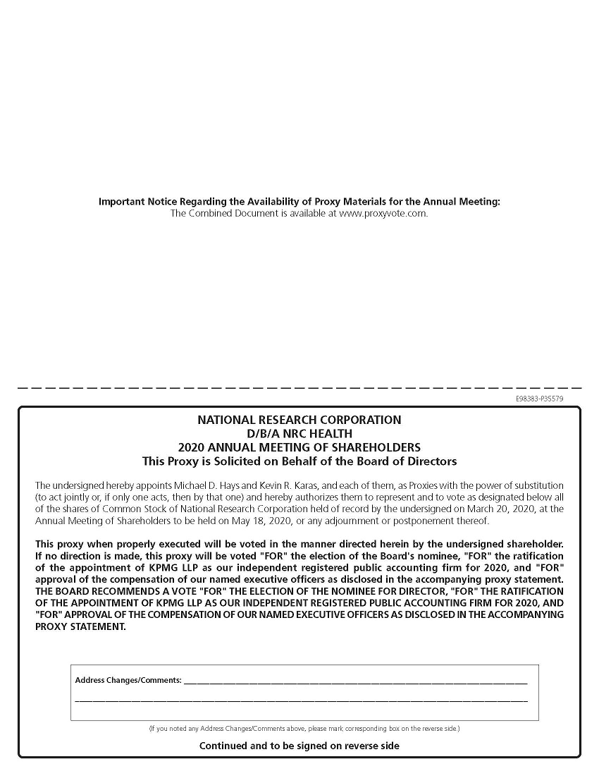 Important Notice Regarding the Availability of Proxy Materials for the Shareholder Meeting To Be Held on May 18, 2020. The National Research Corporation proxy statement for the 2020 Annual Meeting of Shareholders and the 2019 Annual Report to Shareholders are available at www.proxyvote.com.