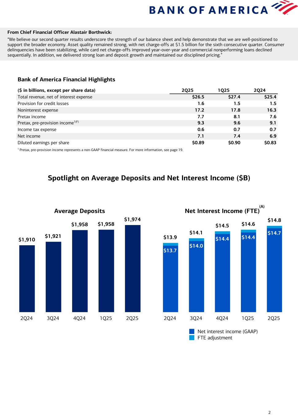 1 2Q25 Financial Highlights2(B) 2Q25 Business Segment Highlights1,2,3(B) Consumer Banking • Net income of $3.0 billion • Revenue of $10.8 billion, up 6% • Average deposits of $952 billion were modestly higher and up 32% from pre-pandemic levels (4Q19) • Average loans and leases of $319 billion, up $7 billion, or 2% • Combined credit / debit card spend of $244 billion, up 4% • Client Highlights – Added ~175,000 net new consumer checking accounts; 26th consecutive quarter of growth – 38.2 million consumer checking accounts; 92% are primary4 – ~4 million small business checking accounts – $540 billion in consumer investment assets, up 13%5 – $1.2 trillion in payments, up 4%6 – 4.1 billion digital logins; 65% of total sales were digitally-enabled Global Wealth and Investment Management • Net income of $1.0 billion • Revenue of $5.9 billion, up 7%. The increase was primarily driven by asset management fees, up 9% to $3.6 billion, on strong AUM flows and higher market levels • Client balances of $4.4 trillion, up 10%, driven by higher market valuations and positive net client flows • Client Highlights – Added ~7,100 net new relationships across Merrill and Private Bank – ~$2.0 trillion of AUM balances, up 13% – 86% of Merrill and Private Bank clients digitally active Global Banking • Net income of $1.7 billion • Total Corporation investment banking fees (excl. self-led) of $1.4 billion, down 9% • #3 investment banking fee ranking YTD9 • $603 billion in average deposits, up 15% • 8% growth in Middle Market average loan balances10 • 15% improvement in treasury service charges Global Markets • Net income of $1.5 billion • Sales and trading revenue up 14% to $5.3 billion including net debit valuation adjustment (DVA) losses of $51 million. Excluding net DVA, up 15%.(E) 13th consecutive quarter of year-over-year growth – Fixed Income, Currencies and Commodities (FICC) revenue up 16% to $3.2 billion. Excluding net DVA, up 19%(E) – Equities revenue up 10% to $2.1 billion, including and excluding net DVA(E) Bank of America Reports 2Q25 Net Income of $7.1 Billion and EPS of $0.89 Revenue up 4% YoY to $26.5 Billion,1 Net Interest Income Grew 7% YoY to $14.7 Billion ($14.8 Billion FTE)(A) Ending Deposits up 5% YoY to more than $2 trillion From Chair and CEO Brian Moynihan: “We delivered another solid quarter, with earnings per share up seven percent from last year. Net interest income grew for the fourth straight quarter, reflecting eight consecutive quarters of deposit growth and seven percent year-over-year loan growth. Consumers remained resilient, with healthy spending and asset quality, and commercial borrower utilization rates rose. In addition, we saw good momentum in our markets businesses. So far this year, we have supplied more capital to our businesses and returned 40 percent more capital to shareholders in the first half of this year than last year.” See page 10 for endnotes. Amounts may not total due to rounding. 1 Revenue, net of interest expense. 2 Financial Highlights and Business Segment Highlights are compared to the year-ago quarter unless noted. 3 The Bank of America Corporation (Corporation) reports the results of operations of its four business segments and All Other on a fully taxable-equivalent (FTE) basis. 4 Represents the percentage of consumer checking accounts that are estimated to be the customer’s primary account based on multiple relationship factors (e.g., linked to their direct deposit). 5 End of period. Consumer investment assets include client brokerage assets, deposit sweep balances, brokered CDs, and AUM in Consumer Banking. 6 Total payments represent payments made from Bank of America accounts using credit card, debit card, ACH, wires, billpay, person-to-person, cash and checks. 7 Subject to approval by the Corporation’s Board of Directors. 8 Tangible book value per common share and return on average tangible common shareholders’ equity ratio represent non-GAAP financial measures. For more information, see page 19. 9 Source: Dealogic as of June 30, 2025. 10 Includes loans to Global Commercial Banking clients, excluding commercial real estate and specialized industries. • Net income of $7.1 billion, or $0.89 per diluted share, compared to $6.9 billion, or $0.83 per diluted share • Revenue, net of interest expense, of $26.5 billion ($26.6 billion FTE),(A) up 4%, reflected higher net interest income (NII), sales and trading revenue and asset management fees, as well as lower investment banking fees – NII of $14.7 billion ($14.8 billion FTE),(A) up 7%, as fixed-rate asset repricing, higher NII related to Global Markets activity, and deposit and loan growth were partially offset by the impact of lower interest rates ▪ 4th consecutive quarter of sequential NII growth • Provision for credit losses of $1.6 billion increased from $1.5 billion in 2Q24 and 1Q25 – Net charge-offs of $1.5 billion were flat to 2Q24 and 1Q25 • Noninterest expense of $17.2 billion, up 5%, driven by higher revenue- related expenses and investments in people, brand and technology – Declined $587 million from 1Q25 driven primarily by the absence of 1Q seasonal elevation in payroll tax expense • Balance Sheet Remained Strong – Average deposit balances of $1.97 trillion increased 3%; eighth consecutive quarter of sequential growth – Average loans and leases of $1.13 trillion increased 7%, with growth across every business segment – Average Global Liquidity Sources of $938 billion(C) – Common equity tier 1 (CET1) capital of $201 billion was flat to 1Q25 – CET1 ratio of 11.5% (Standardized);(D) well above the regulatory minimum – Returned $7.3 billion to shareholders ($2.0 billion through common stock dividends and $5.3 billion in share repurchases) and announced plans to increase the quarterly common stock dividend 8% beginning in 3Q257 • Book value per common share rose 8% to $37.13; tangible book value pe