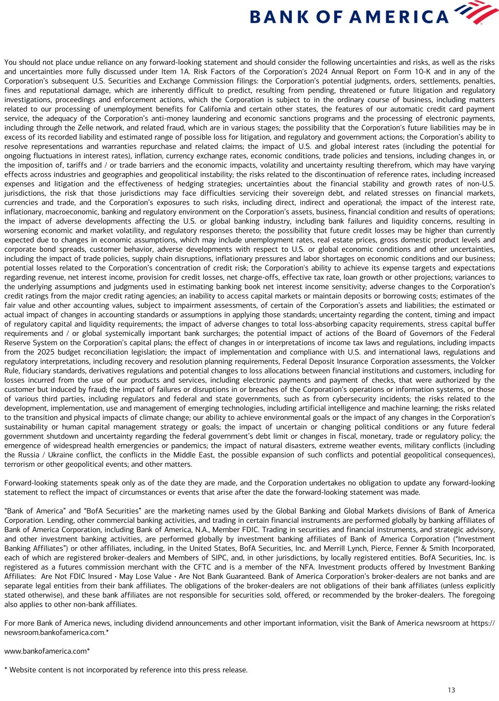 13 You should not place undue reliance on any forward-looking statement and should consider the following uncertainties and risks, as well as the risks and uncertainties more fully discussed under Item 1A. Risk Factors of the Corporation's 2024 Annual Report on Form 10-K and in any of the Corporation’s subsequent U.S. Securities and Exchange Commission filings: the Corporation’s potential judgments, orders, settlements, penalties, fines and reputational damage, which are inherently difficult to predict, resulting from pending, threatened or future litigation and regulatory investigations, proceedings and enforcement actions, which the Corporation is subject to in the ordinary course of business, including matters related to our processing of unemployment benefits for California and certain other states, the features of our automatic credit card payment service, the adequacy of the Corporation’s anti-money laundering and economic sanctions programs and the processing of electronic payments, including through the Zelle network, and related fraud, which are in various stages; the possibility that the Corporation's future liabilities may be in excess of its recorded liability and estimated range of possible loss for litigation, and regulatory and government actions; the Corporation’s ability to resolve representations and warranties repurchase and related claims; the impact of U.S. and global interest rates (including the potential for ongoing fluctuations in interest rates), inflation, currency exchange rates, economic conditions, trade policies and tensions, including changes in, or the imposition of, tariffs and / or trade barriers and the economic impacts, volatility and uncertainty resulting therefrom, which may have varying effects across industries and geographies and geopolitical instability; the risks related to the discontinuation of reference rates, including increased expenses and litigation and the effectiveness of hedging strategies; uncertainties about the financial stability and growth rates of non-U.S. jurisdictions, the risk that those jurisdictions may face difficulties servicing their sovereign debt, and related stresses on financial markets, currencies and trade, and the Corporation’s exposures to such risks, including direct, indirect and operational; the impact of the interest rate, inflationary, macroeconomic, banking and regulatory environment on the Corporation’s assets, business, financial condition and results of operations; the impact of adverse developments affecting the U.S. or global banking industry, including bank failures and liquidity concerns, resulting in worsening economic and market volatility, and regulatory responses thereto; the possibility that future credit losses may be higher than currently expected due to changes in economic assumptions, which may include unemployment rates, real estate prices, gross domestic product levels and corporate bond spreads, customer behavior, adverse developments with respect to U.S. or global economic conditions and other uncertainties, including the impact of trade policies, supply chain disruptions, inflationary pressures and labor shortages on economic conditions and our business; potential losses related to the Corporation’s concentration of credit risk; the Corporation's ability to achieve its expense targets and expectations regarding revenue, net interest income, provision for credit losses, net charge-offs, effective tax rate, loan growth or other projections; variances to the underlying assumptions and judgments used in estimating banking book net interest income sensitivity; adverse changes to the Corporation’s credit ratings from the major credit rating agencies; an inability to access capital markets or maintain deposits or borrowing costs; estimates of the fair value and other accounting values, subject to impairment assessments, of certain of the Corporation’s assets and liabilities; the estimated or actual impact of changes in accounting standards or assumptions in applying those standards; uncertainty regarding the content, timing and impact of regulatory capital and liquidity requirements; the impact of adverse changes to total loss-absorbing capacity requirements, stress capital buffer requirements and / or global systemically important bank surcharges; the potential impact of actions of the Board of Governors of the Federal Reserve System on the Corporation’s capital plans; the effect of changes in or interpretations of income tax laws and regulations, including impacts from the 2025 budget reconciliation legislation; the impact of implementation and compliance with U.S. and international laws, regulations and regulatory interpretations, including recovery and resolution planning requirements, Federal Deposit Insurance Corporation assessments, the Volcker Rule, fiduciary standards, derivatives regulations and potential changes to loss allocations between financial institutions and customers, including for losses incurred from the use of our products and services, including electronic payments and payment of checks, that were authorized by the customer but induced by fraud; the impact of failures or disruptions in or breaches of the Corporation’s operations or information systems, or those of various third parties, including regulators and federal and state governments, such as from cybersecurity incidents; the risks related to the development, implementation, use and management of emerging technologies, including artificial intelligence and machine learning; the risks related to the transition and physical impacts of climate change; our ability to achieve environmental goals or the impact of any changes in the Corporation's sustainability or human capital management strategy or goals; the impact of uncertain or changing political conditions or any future federal government shutdown and uncertainty regarding the federal government’s debt limit or changes in fiscal, monetary,