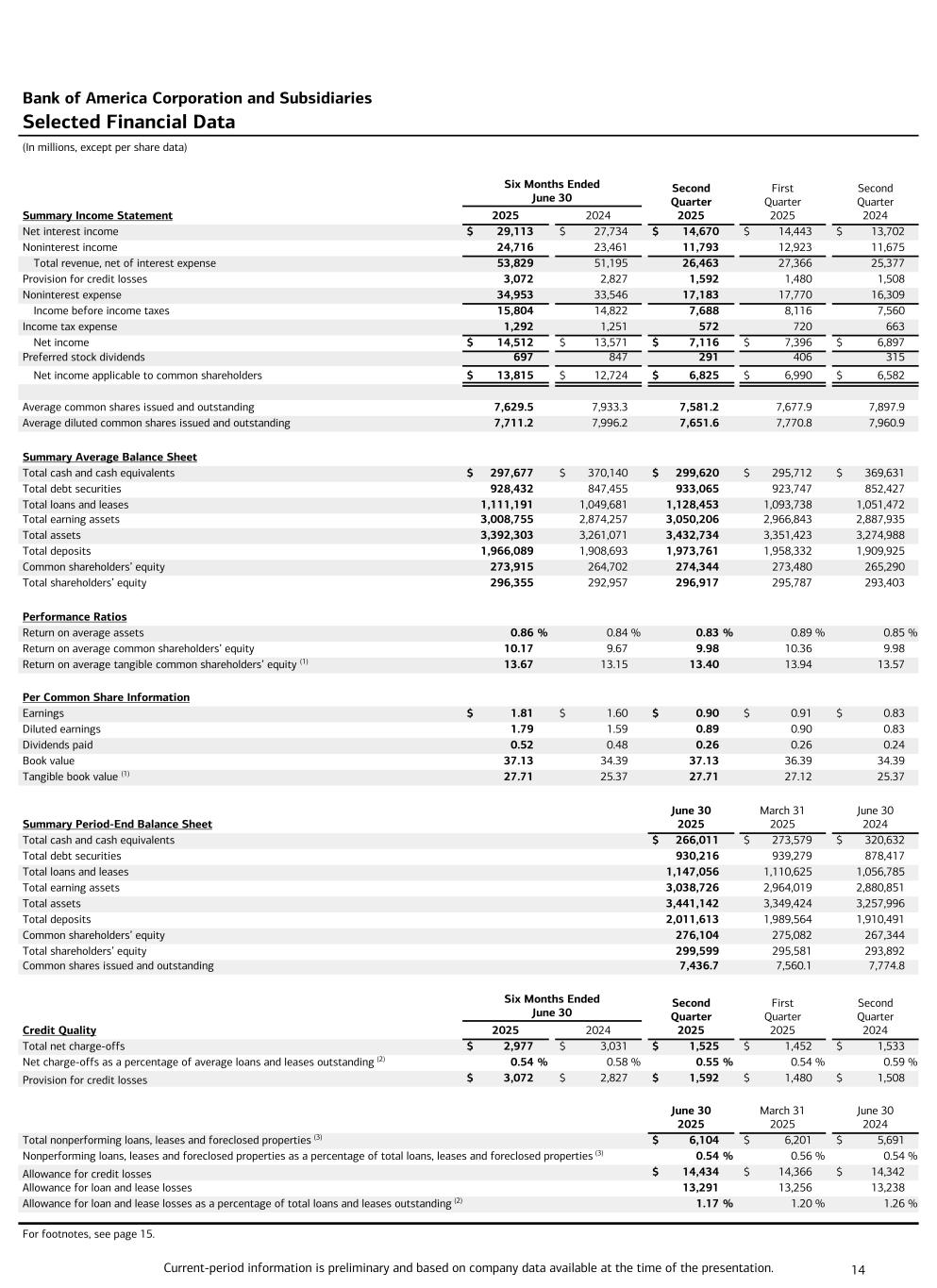Current-period information is preliminary and based on company data available at the time of the presentation. 14 Bank of America Corporation and Subsidiaries Selected Financial Data (In millions, except per share data) Six Months Ended June 30 Second Quarter 2025 First Quarter 2025 Second Quarter 2024Summary Income Statement 2025 2024 Net interest income $ 29,113 $ 27,734 $ 14,670 $ 14,443 $ 13,702 Noninterest income 24,716 23,461 11,793 12,923 11,675 Total revenue, net of interest expense 53,829 51,195 26,463 27,366 25,377 Provision for credit losses 3,072 2,827 1,592 1,480 1,508 Noninterest expense 34,953 33,546 17,183 17,770 16,309 Income before income taxes 15,804 14,822 7,688 8,116 7,560 Income tax expense 1,292 1,251 572 720 663 Net income $ 14,512 $ 13,571 $ 7,116 $ 7,396 $ 6,897 Preferred stock dividends 697 847 291 406 315 Net income applicable to common shareholders $ 13,815 $ 12,724 $ 6,825 $ 6,990 $ 6,582 Average common shares issued and outstanding 7,629.5 7,933.3 7,581.2 7,677.9 7,897.9 Average diluted common shares issued and outstanding 7,711.2 7,996.2 7,651.6 7,770.8 7,960.9 Summary Average Balance Sheet Total cash and cash equivalents $ 297,677 $ 370,140 $ 299,620 $ 295,712 $ 369,631 Total debt securities 928,432 847,455 933,065 923,747 852,427 Total loans and leases 1,111,191 1,049,681 1,128,453 1,093,738 1,051,472 Total earning assets 3,008,755 2,874,257 3,050,206 2,966,843 2,887,935 Total assets 3,392,303 3,261,071 3,432,734 3,351,423 3,274,988 Total deposits 1,966,089 1,908,693 1,973,761 1,958,332 1,909,925 Common shareholders’ equity 273,915 264,702 274,344 273,480 265,290 Total shareholders’ equity 296,355 292,957 296,917 295,787 293,403 Performance Ratios Return on average assets 0.86 % 0.84 % 0.83 % 0.89 % 0.85 % Return on average common shareholders’ equity 10.17 9.67 9.98 10.36 9.98 Return on average tangible common shareholders’ equity (1) 13.67 13.15 13.40 13.94 13.57 Per Common Share Information Earnings $ 1.81 $ 1.60 $ 0.90 $ 0.91 $ 0.83 Diluted earnings 1.79 1.59 0.89 0.90 0.83 Dividends paid 0.52 0.48 0.26 0.26 0.24 Book value 37.13 34.39 37.13 36.39 34.39 Tangible book value (1) 27.71 25.37 27.71 27.12 25.37 Summary Period-End Balance Sheet June 30 2025 March 31 2025 June 30 2024 Total cash and cash equivalents $ 266,011 $ 273,579 $ 320,632 Total debt securities 930,216 939,279 878,417 Total loans and leases 1,147,056 1,110,625 1,056,785 Total earning assets 3,038,726 2,964,019 2,880,851 Total assets 3,441,142 3,349,424 3,257,996 Total deposits 2,011,613 1,989,564 1,910,491 Common shareholders’ equity 276,104 275,082 267,344 Total shareholders’ equity 299,599 295,581 293,892 Common shares issued and outstanding 7,436.7 7,560.1 7,774.8 Six Months Ended June 30 Second Quarter 2025 First Quarter 2025 Second Quarter 2024Credit Quality 2025 2024 Total net charge-offs $ 2,977 $ 3,031 $ 1,525 $ 1,452 $ 1,533 Net charge-offs as a percentage of average loans and leases outstanding (2) 0.54 % 0.58 % 0.55 % 0.54 % 0.59 % Provision for credit losses $ 3,072 $ 2,827 $ 1,592 $ 1,480 $ 1,508 June 30 2025 March 31 2025 June 30 2024 Total nonperforming loans, leases and foreclosed properties (3) $ 6,104 $ 6,201 $ 5,691 Nonperforming loans, leases and foreclosed properties as a percentage of total loans, leases and foreclosed properties (3) 0.54 % 0.56 % 0.54 % Allowance for credit losses $ 14,434 $ 14,366 $ 14,342 Allowance for loan and lease losses 13,291 13,256 13,238 Allowance for loan and lease losses as a percentage of total loans and leases outstanding (2) 1.17 % 1.20 % 1.26 % For footnotes, see page 15.