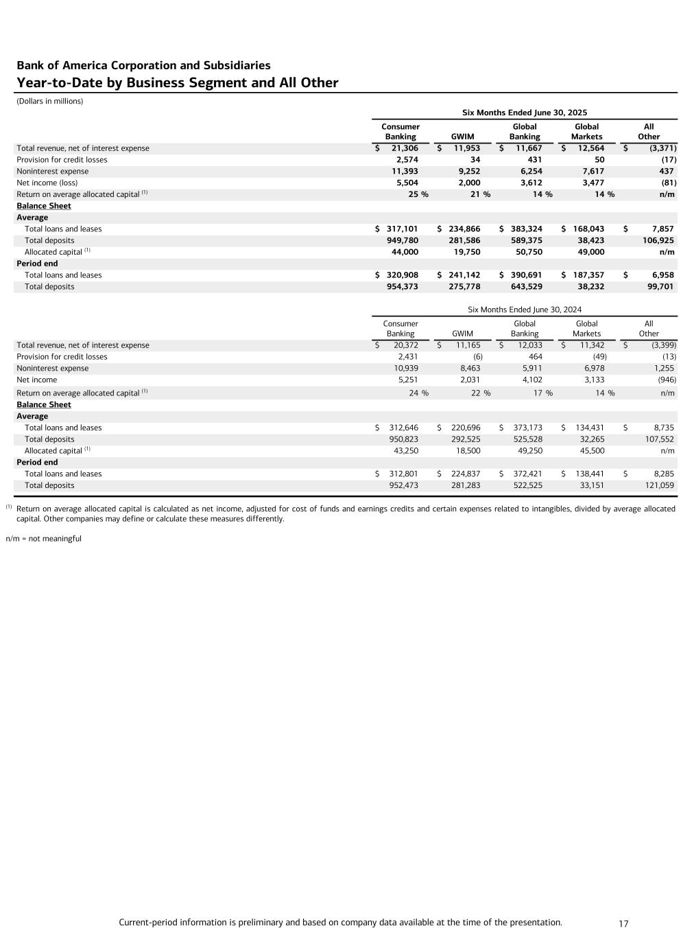 Current-period information is preliminary and based on company data available at the time of the presentation. 16 Bank of America Corporation and Subsidiaries Quarterly Results by Business Segment and All Other (Dollars in millions) Second Quarter 2025 Consumer Banking GWIM Global Banking Global Markets All Other Total revenue, net of interest expense $ 10,813 $ 5,937 $ 5,690 $ 5,980 $ (1,812) Provision for credit losses 1,282 20 277 22 (9) Noninterest expense 5,567 4,593 3,070 3,806 147 Net income 2,973 993 1,699 1,528 (77) Return on average allocated capital (1) 27 % 20 % 13 % 13 % n/m Balance Sheet Average Total loans and leases $ 319,142 $ 237,377 $ 387,864 $ 176,368 $ 7,702 Total deposits 951,986 276,825 603,410 38,040 103,500 Allocated capital (1) 44,000 19,750 50,750 49,000 n/m Period end Total loans and leases $ 320,908 $ 241,142 $ 390,691 $ 187,357 $ 6,958 Total deposits 954,373 275,778 643,529 38,232 99,701 First Quarter 2025 Consumer Banking GWIM Global Banking Global Markets All Other Total revenue, net of interest expense $ 10,493 $ 6,016 $ 5,977 $ 6,584 $ (1,559) Provision for credit losses 1,292 14 154 28 (8) Noninterest expense 5,826 4,659 3,184 3,811 290 Net income (loss) 2,531 1,007 1,913 1,949 (4) Return on average allocated capital (1) 23 % 21 % 15 % 16 % n/m Balance Sheet Average Total loans and leases $ 315,038 $ 232,326 $ 378,733 $ 159,625 $ 8,016 Total deposits 947,550 286,399 575,185 38,809 110,389 Allocated capital (1) 44,000 19,750 50,750 49,000 n/m Period end Total loans and leases $ 318,337 $ 234,304 $ 384,208 $ 166,348 $ 7,428 Total deposits 972,064 285,063 591,619 38,268 102,550 Second Quarter 2024 Consumer Banking GWIM Global Banking Global Markets All Other Total revenue, net of interest expense $ 10,206 $ 5,574 $ 6,053 $ 5,459 $ (1,755) Provision for credit losses 1,281 7 235 (13) (2) Noninterest expense 5,464 4,199 2,899 3,486 261 Net income 2,595 1,026 2,116 1,410 (250) Return on average allocated capital (1) 24 % 22 % 17 % 13 % n/m Balance Sheet Average Total loans and leases $ 312,254 $ 222,776 $ 372,738 $ 135,106 $ 8,598 Total deposits 949,180 287,678 525,357 31,944 115,766 Allocated capital (1) 43,250 18,500 49,250 45,500 n/m Period end Total loans and leases $ 312,801 $ 224,837 $ 372,421 $ 138,441 $ 8,285 Total deposits 952,473 281,283 522,525 33,151 121,059 (1) Return on average allocated capital is calculated as net income, adjusted for cost of funds and earnings credits and certain expenses related to intangibles, divided by average allocated capital. Other companies may define or calculate these measures differently. n/m = not meaningful The Company reports the results of operations of its four business segments and All Other on a fully taxable-equivalent (FTE) basis.
