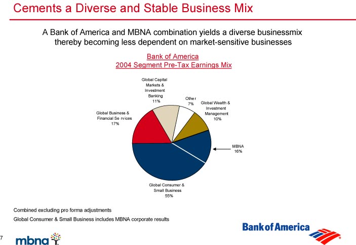 | A Bank of America and MBNA combination yields a diverse business mix thereby becoming less dependent on market-sensitive businesses Bank of America 2004 Segment Pre-Tax Earnings Mix Cements a Diverse and Stable Business Mix MBNA 16% Combined excluding pro forma adjustments Global Consumer & Small Business includes MBNA corporate results Global Business & Financial Services 17% Global Capital Markets & Investment Banking 11% Other 7% Global Wealth & Investment Management 10% Global Consumer & Small Business 55% |