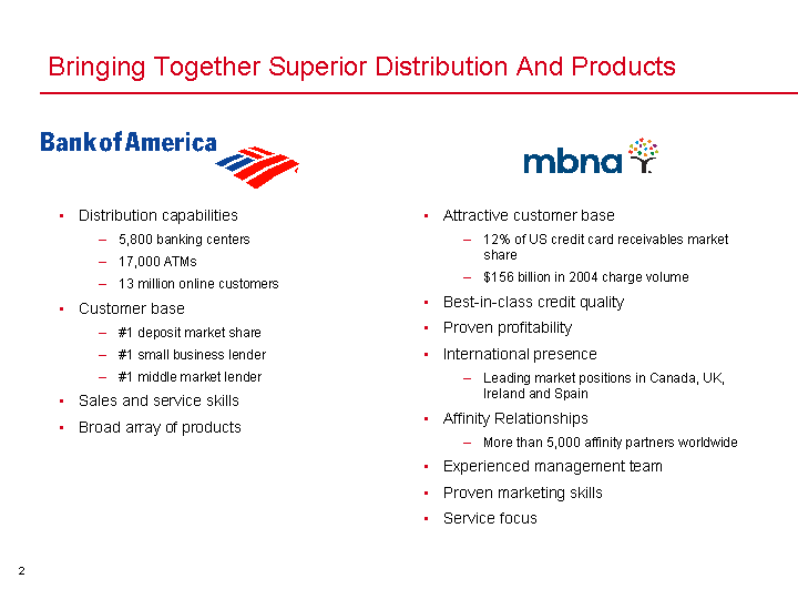 | Forward Looking Statements This presentation contains forward-looking statements, including statements about the financial conditions, results of operations and earnings outlook of Bank of America Corporation and MBNA. The forward-looking statements involve certain risks and uncertainties. Factors that may cause actual results or earnings to differ materially from such forward-looking statements include, among others, the following: 1) changes in economic conditions; 2) changes in the interest rate environment; 3) changes in foreign exchange rates; 4) adverse movements and volatility in debt and equity capital markets; 5) changes in market rates and prices; 6) political conditions and related actions by the United States military abroad which may adversely affect the company's businesses and economic conditions as a whole; 7) liabilities resulting from litigation and regulatory investigations; 8) changes in domestic or foreign tax laws, rules and regulations as well as IRS or other governmental agencies' interpretations thereof; 9) various monetary and fiscal policies and regulations; 10) increased competition; 11) ability to grow core businesses; 12) ability to develop and introduce new banking-related products , services and enhancements and gain market acceptance of such products; 13) mergers and acquisitions and their integration into the company; 14) decisions to downsize, sell or close units or otherwise change the business mix of the company; and 15) management's ability to manage these and other risks. For further information regarding either company, please read Bank of America and MBNA reports filed with the SEC and available at www.sec.gov. |