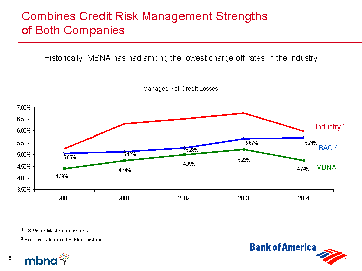 | Combines Credit Risk Management Strengths of Both Companies Historically, MBNA has had among the lowest charge-off rates in the industry Managed Net Credit Losses MBNA BAC 2 Industry 1 1 US Visa / Mastercard issuers 2 BAC c/o rate includes Fleet history |