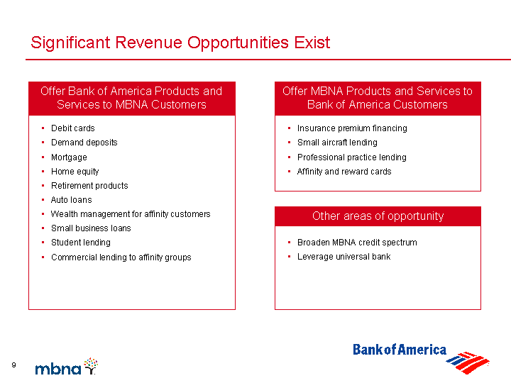 | Significant Revenue Opportunities Exist Debit cards Demand deposits Mortgage Home equity Retirement products Auto loans Wealth management for affinity customers Small business loans Student lending Commercial lending to affinity groups Insurance premium financing Small aircraft lending Professional practice lending Affinity and reward cards Broaden MBNA credit spectrum Leverage universal bank Offer Bank of America Products and Services to MBNA Customers Offer MBNA Products and Services to Bank of America Customers Other areas of opportunity |