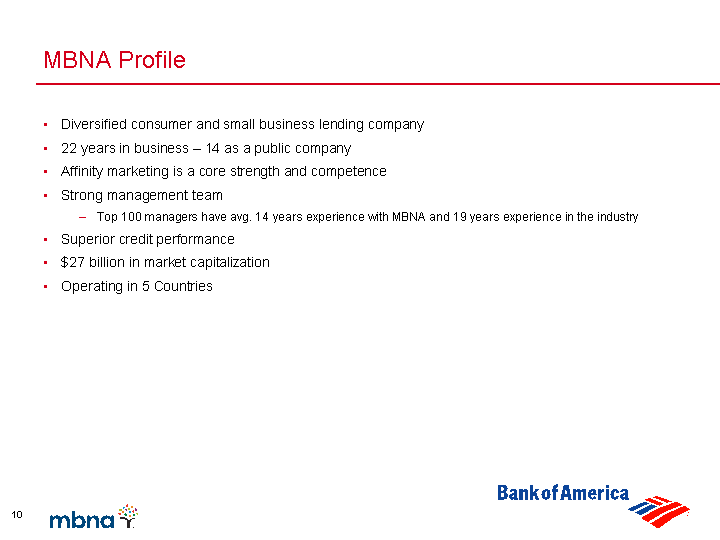 | MBNA Profile Diversified consumer and small business lending company 22 years in business - 14 as a public company Affinity marketing is a core strength and competence Strong management team Top 100 managers have avg. 14 years experience with MBNA and 19 years experience in the industry Superior credit performance $27 billion in market capitalization Operating in 5 Countries |