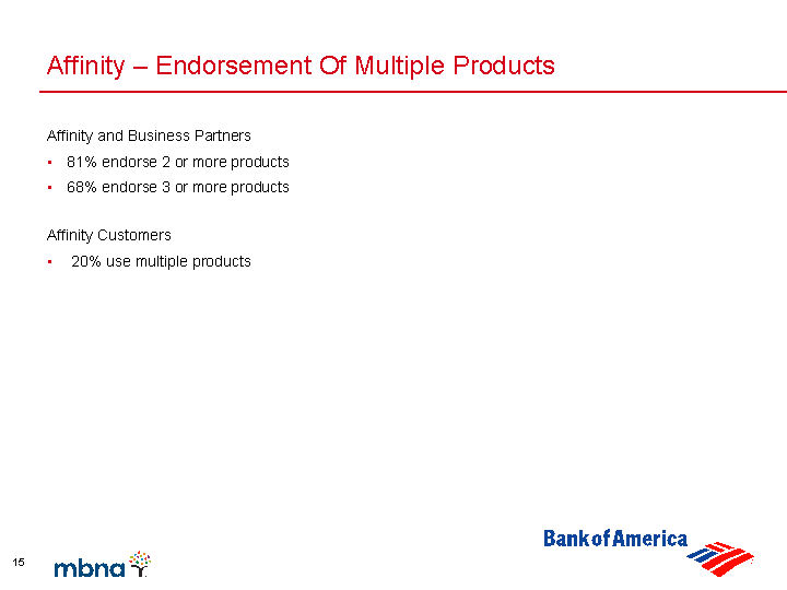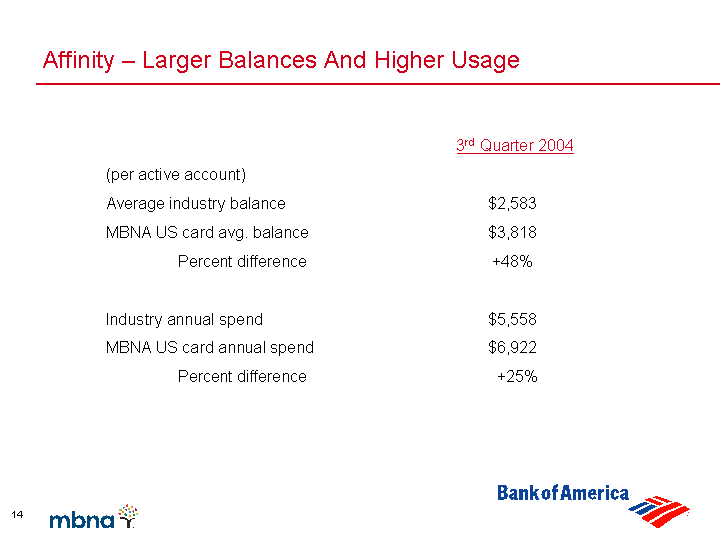 | Affinity - Larger Balances And Higher Usage 3rd Quarter 2004 (per active account) Average industry balance $2,583 MBNA US card avg. balance $3,818 Percent difference +48% Industry annual spend $5,558 MBNA US card annual spend $6,922 Percent difference +25% |