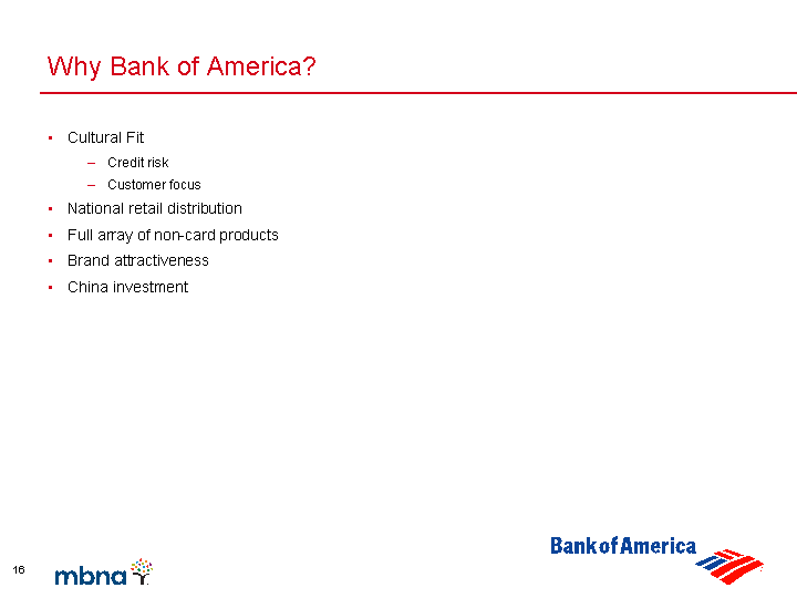 | Why Bank of America? Cultural Fit Credit risk Customer focus National retail distribution Full array of non-card products Brand attractiveness China investment |